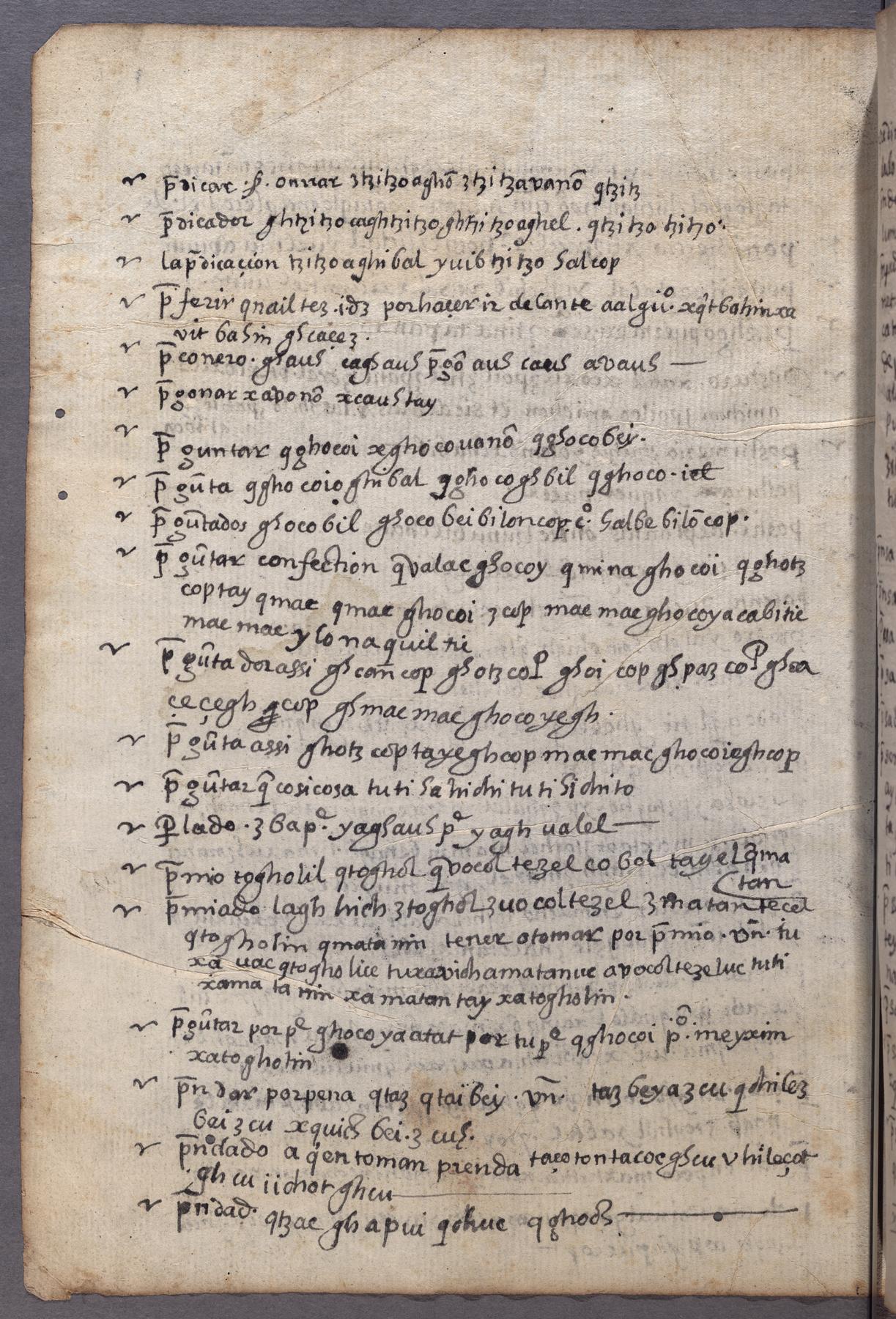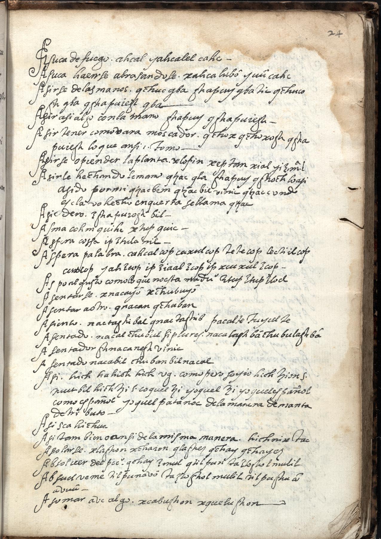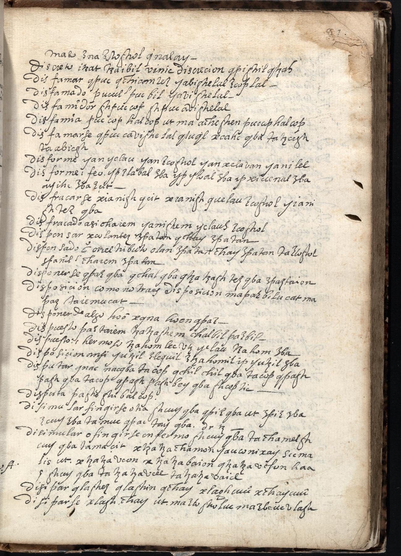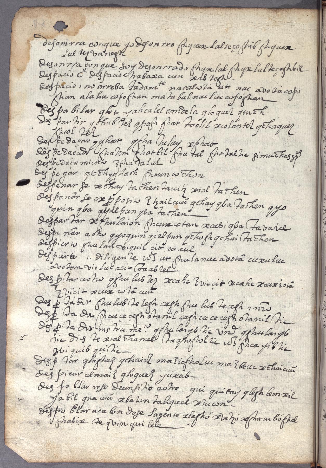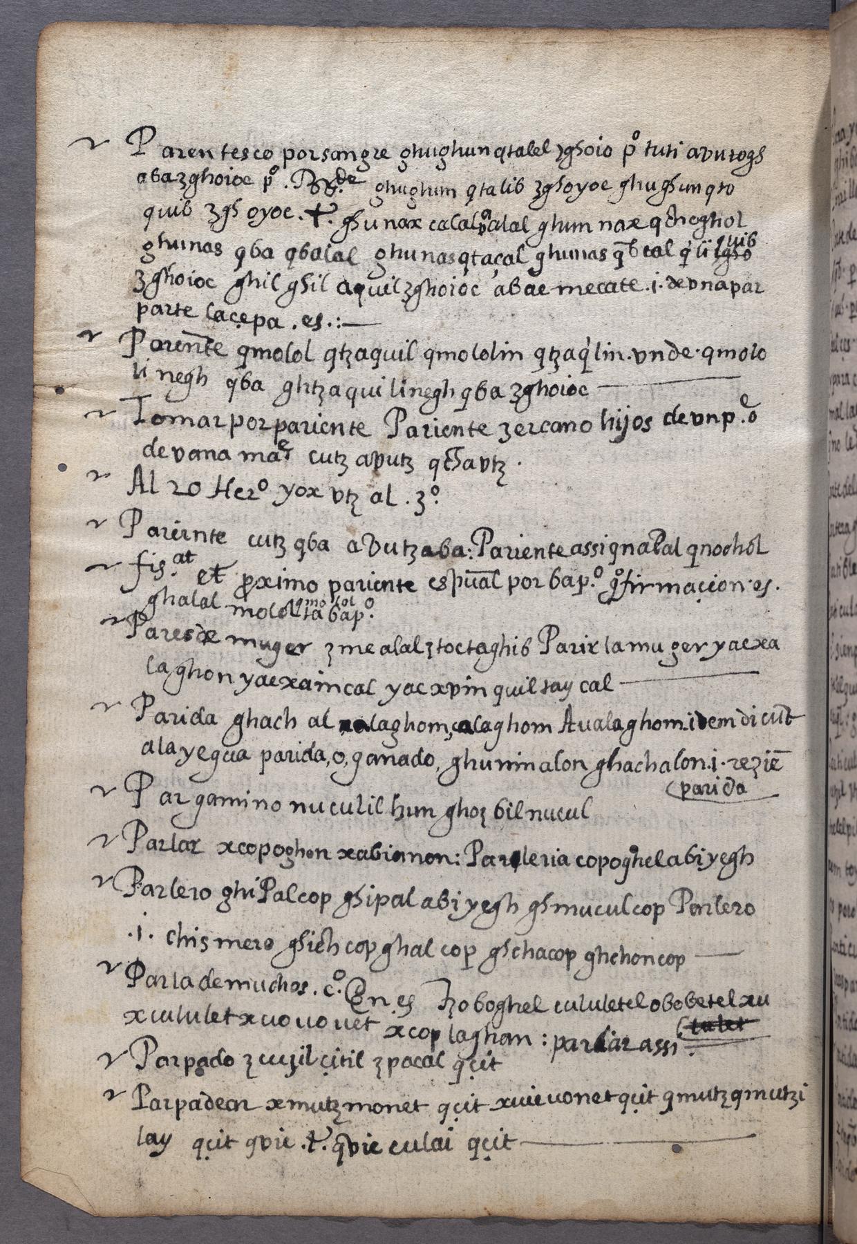 A copy, probably made in the 17th century, of an alphabetical list of Spanish names, words, and phrases, with translations in Tzeltal.