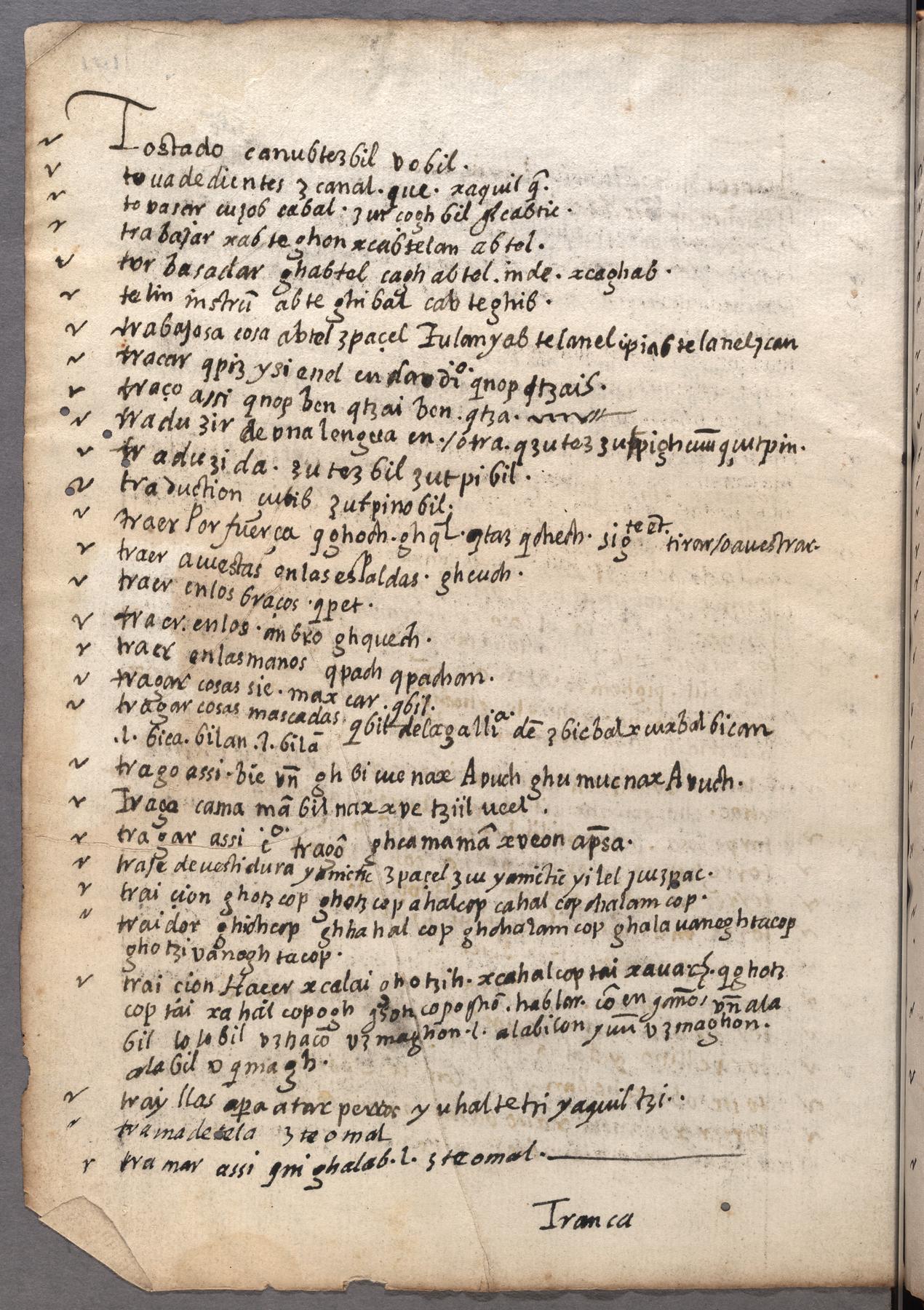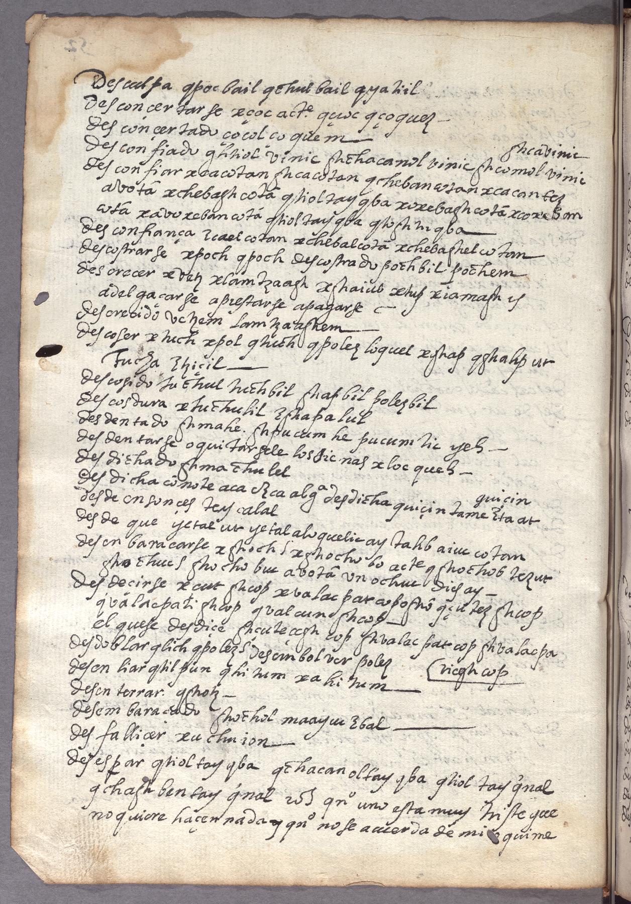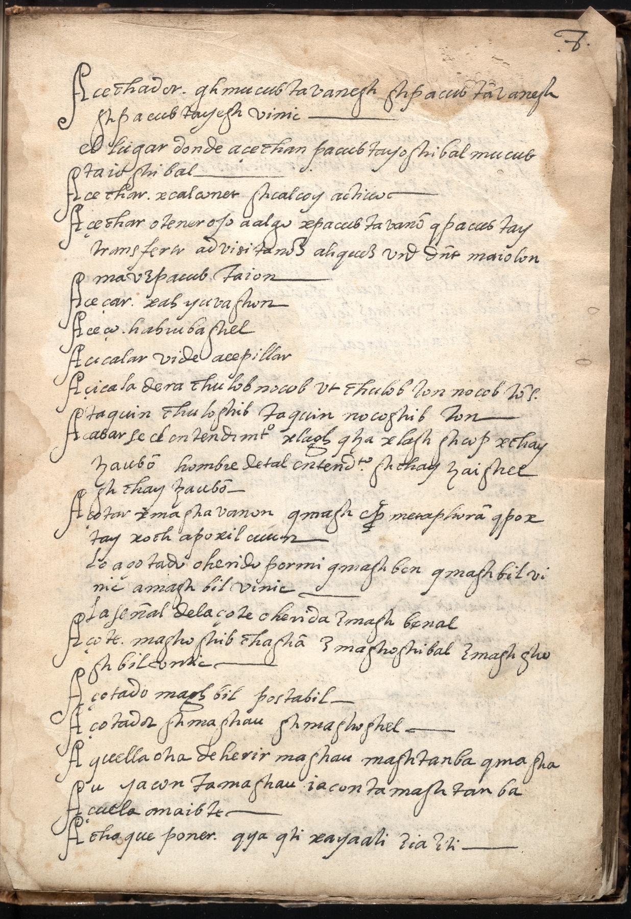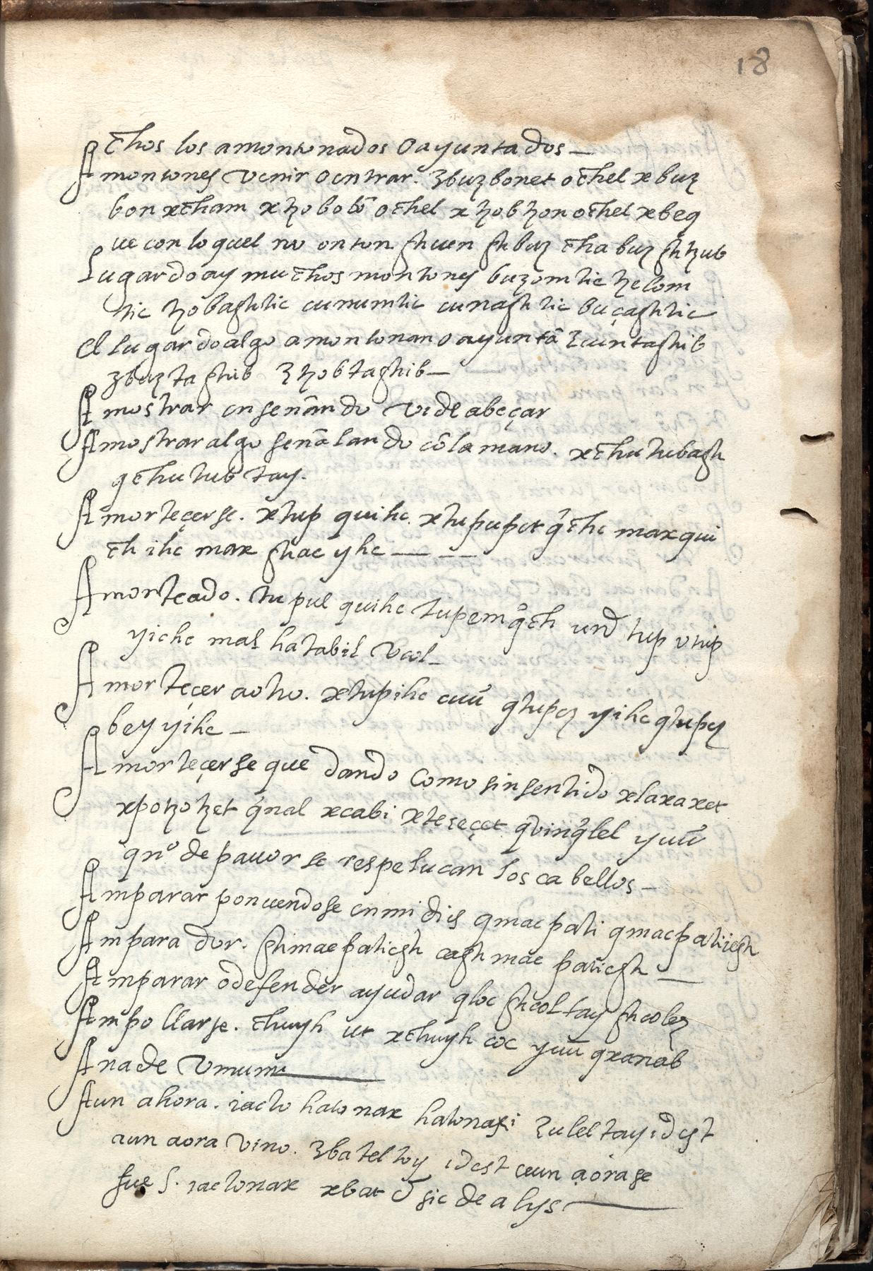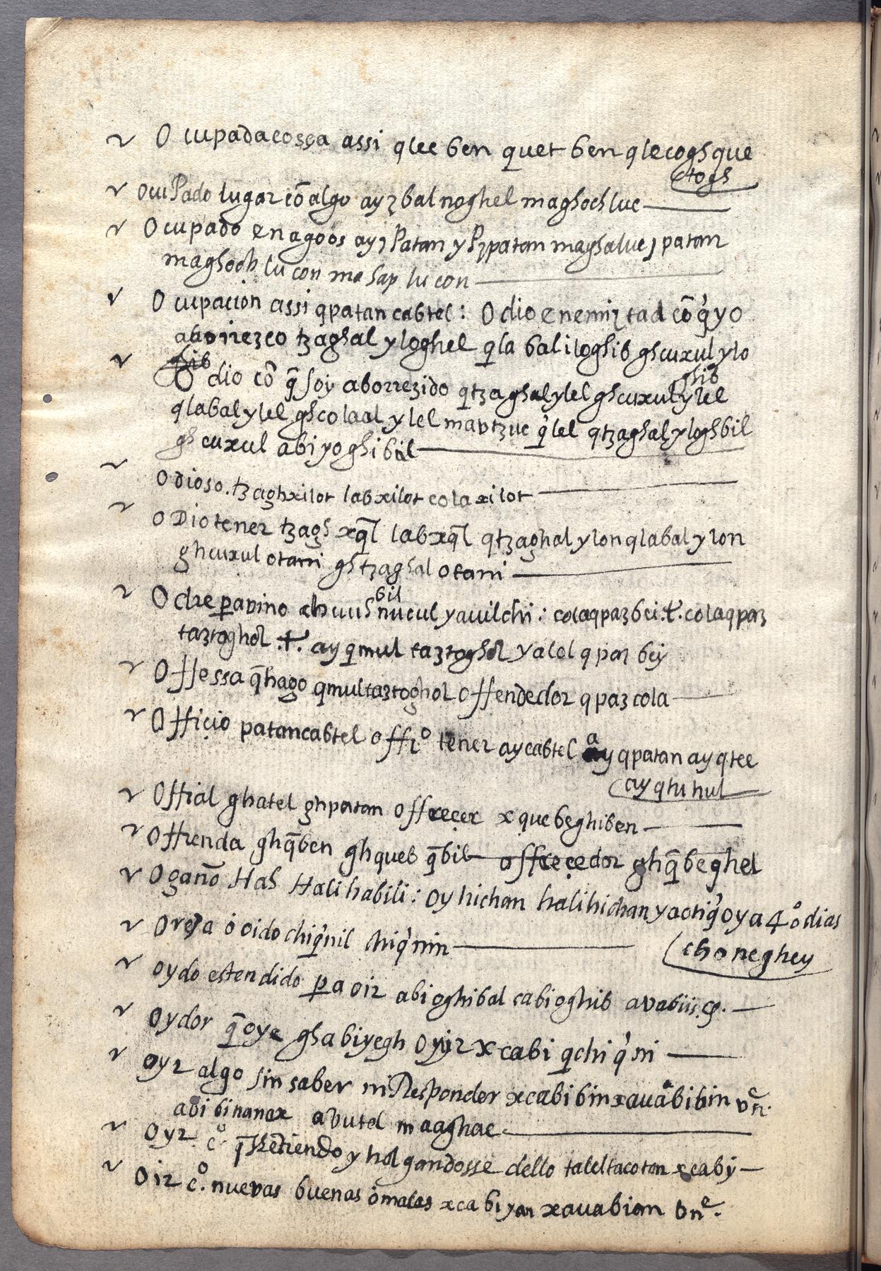 A copy, probably made in the 17th century, of an alphabetical list of Spanish names, words, and phrases, with translations in Tzeltal.