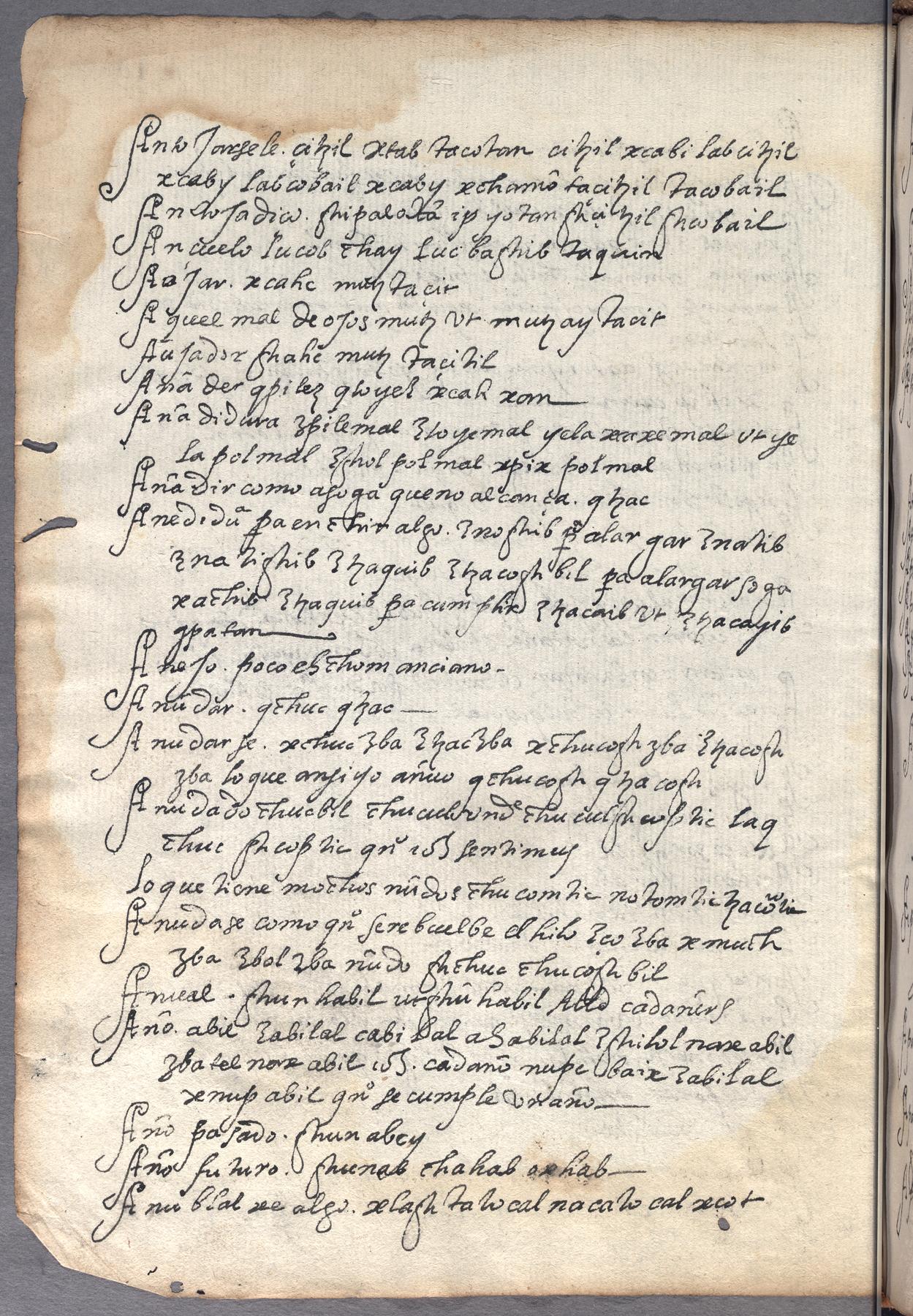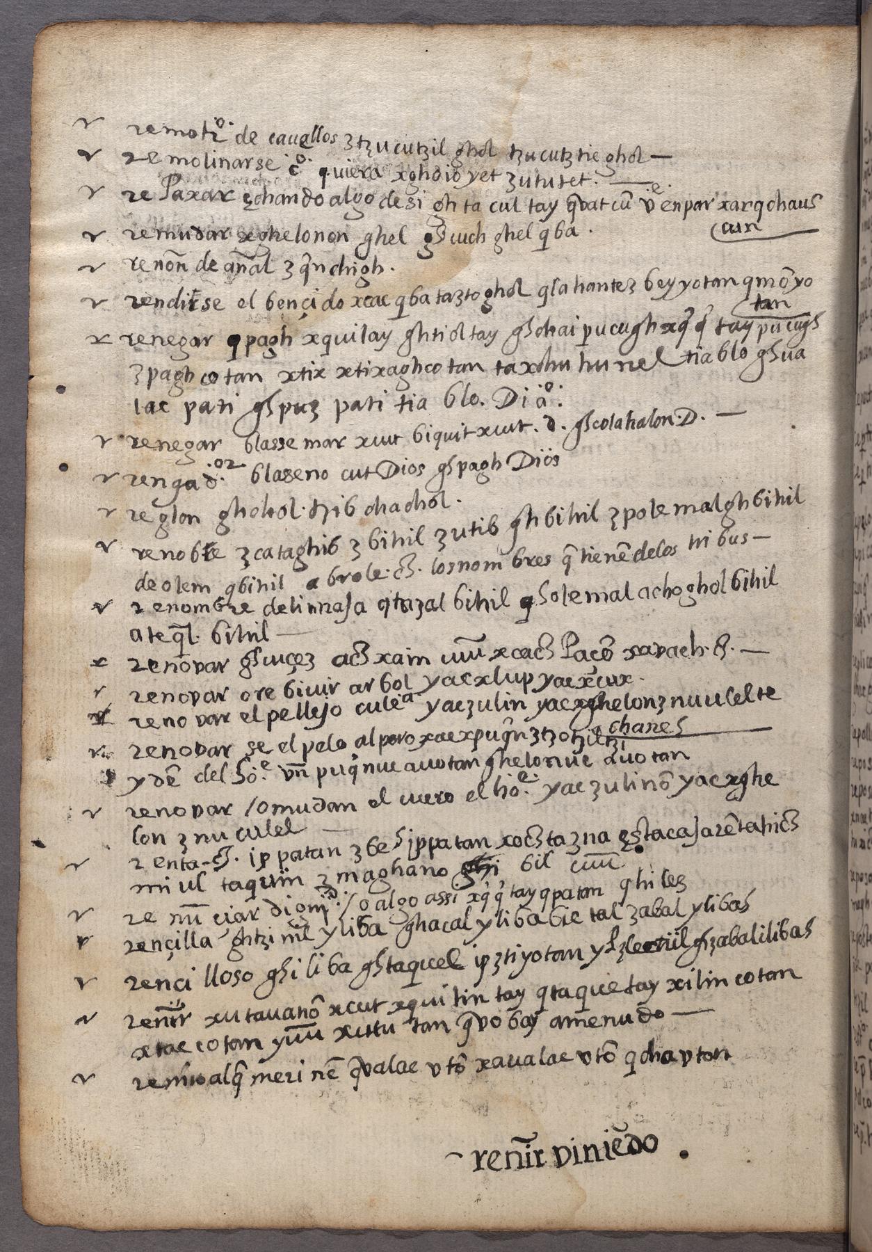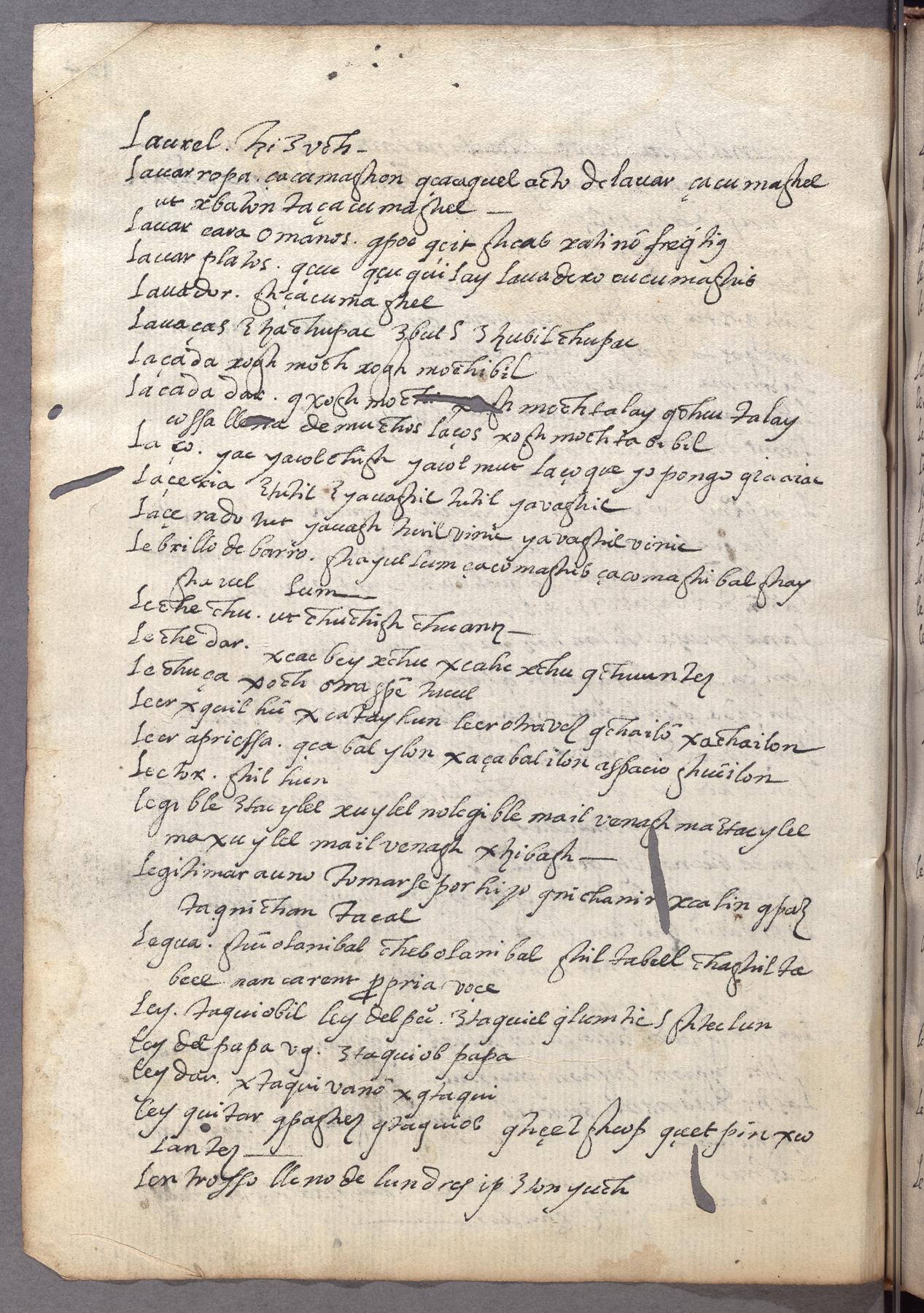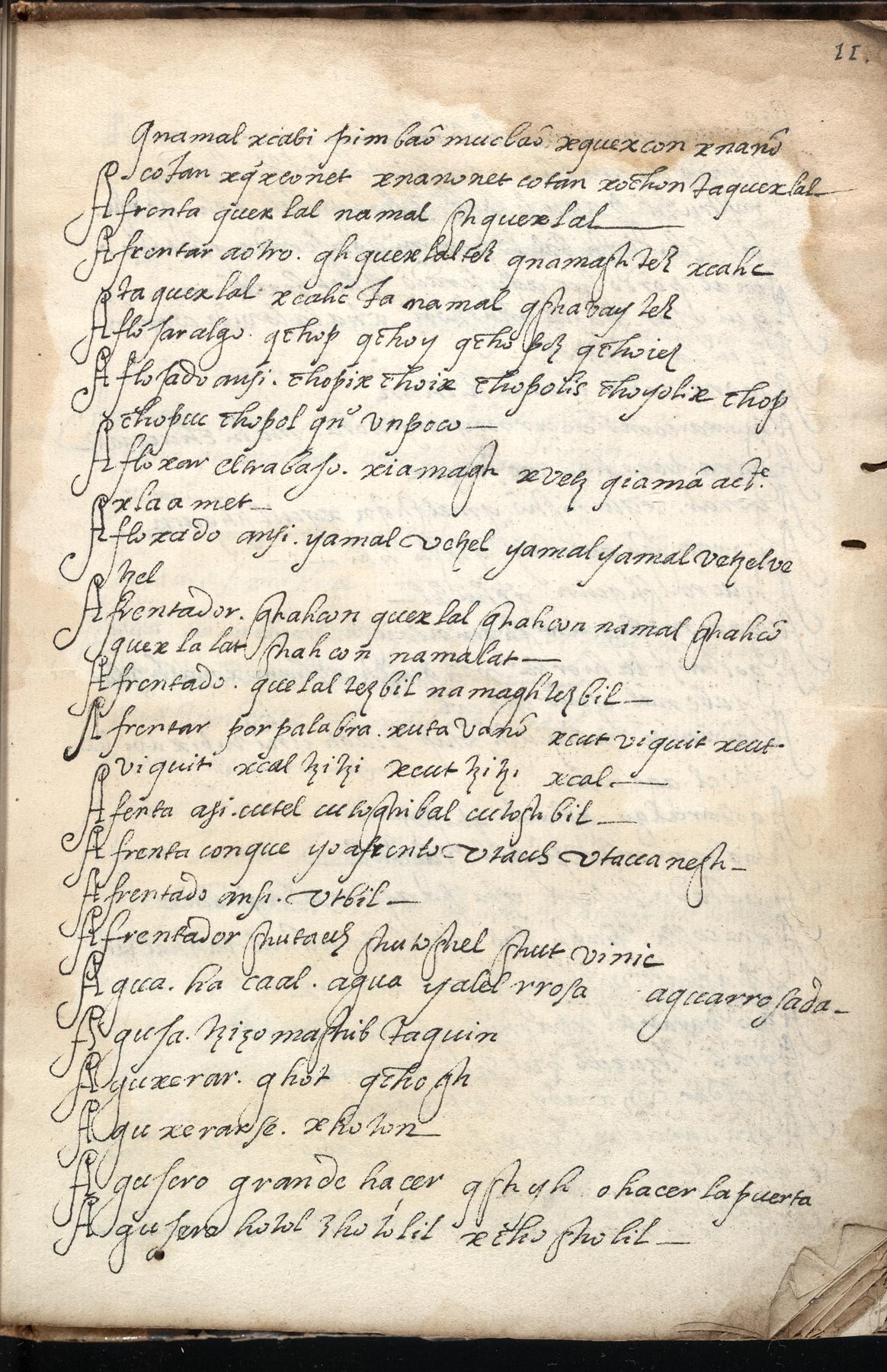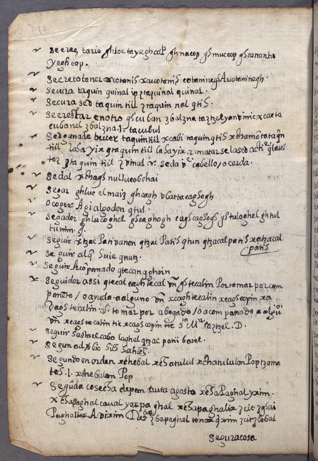 A copy, probably made in the 17th century, of an alphabetical list of Spanish names, words, and phrases, with translations in Tzeltal.