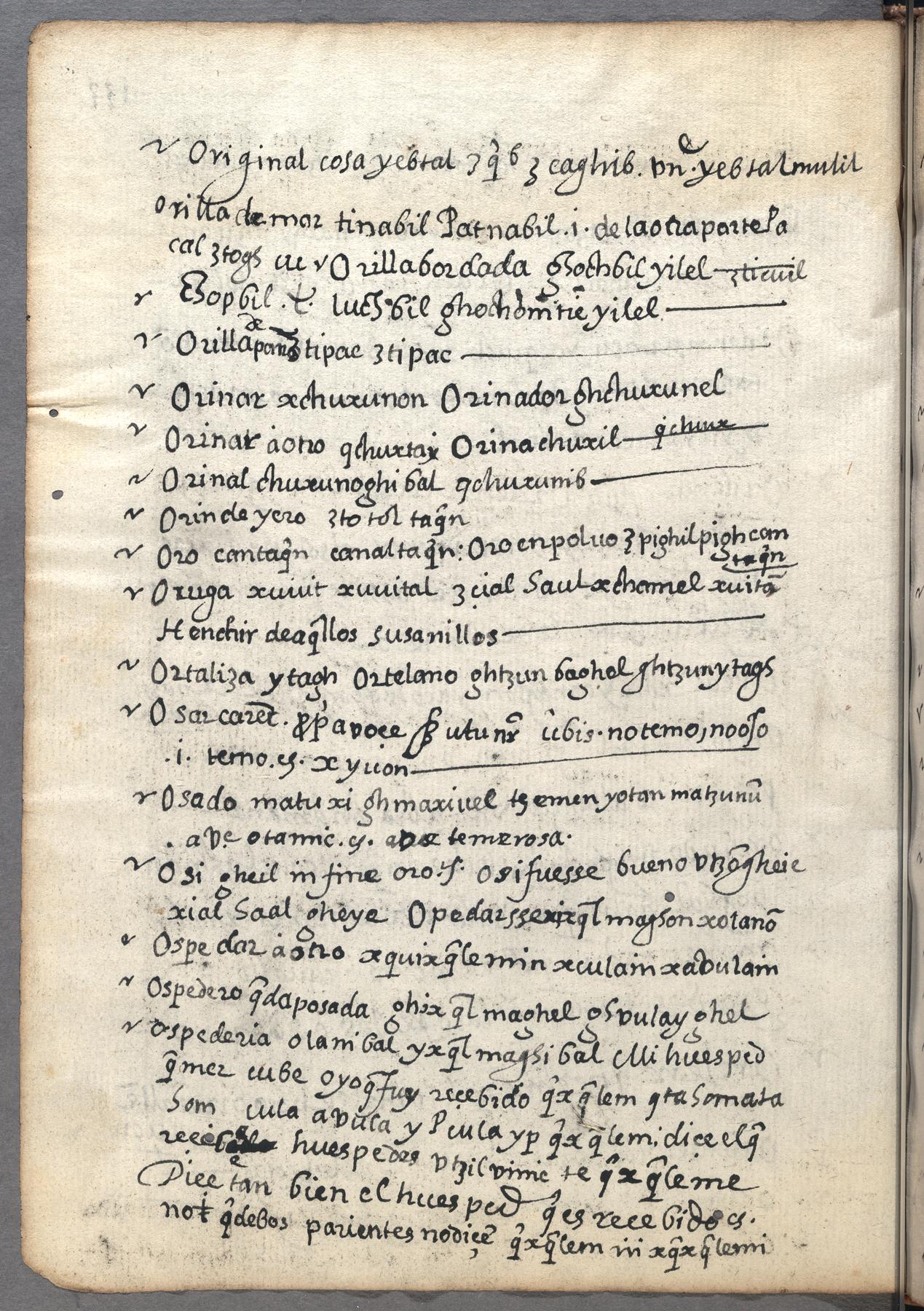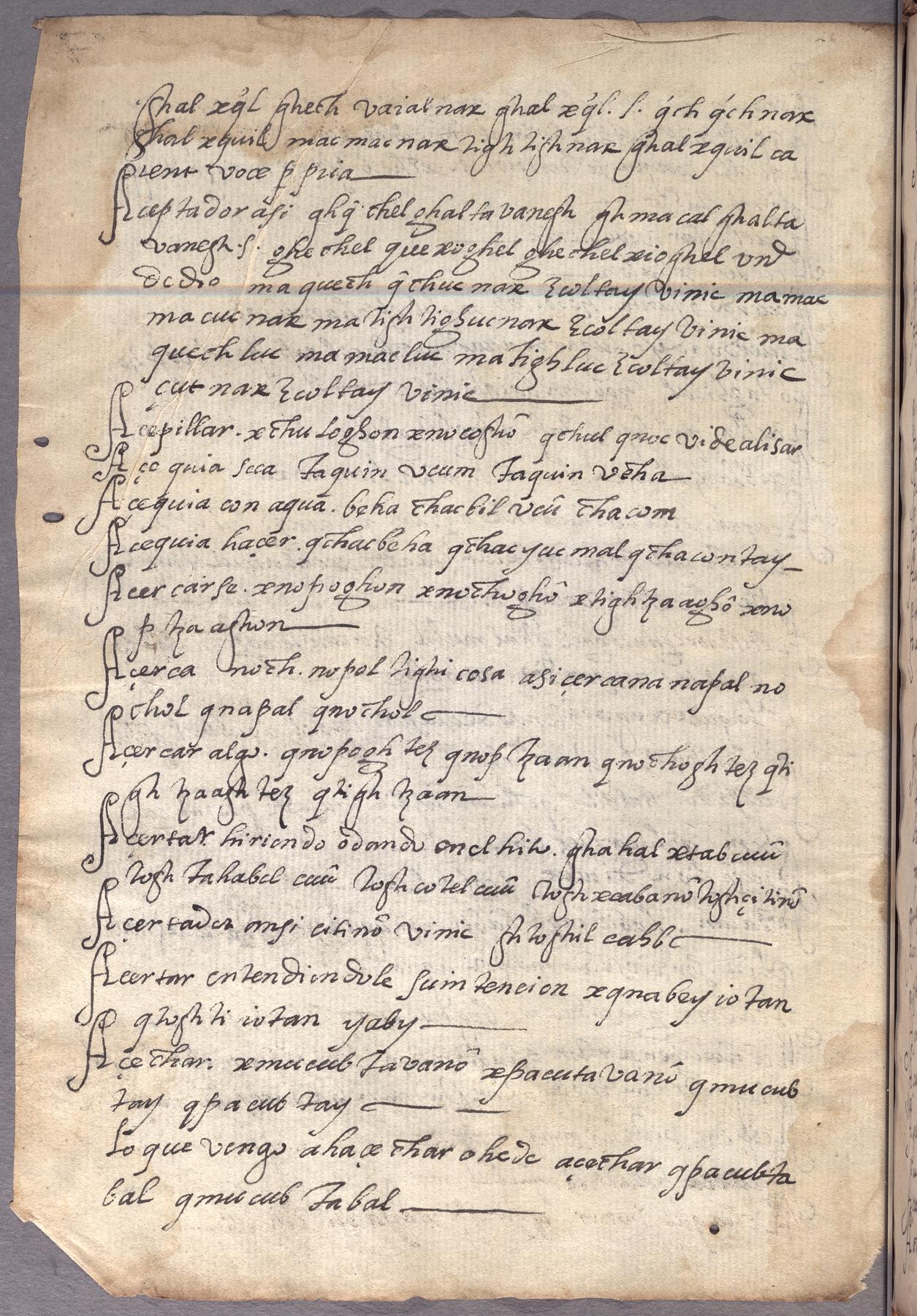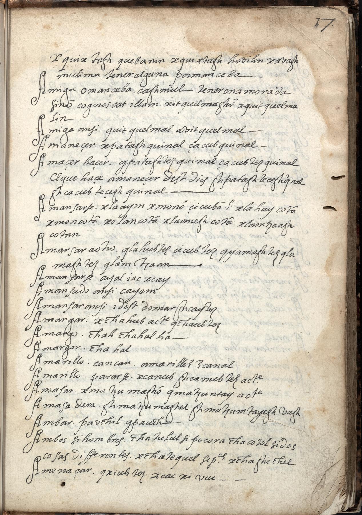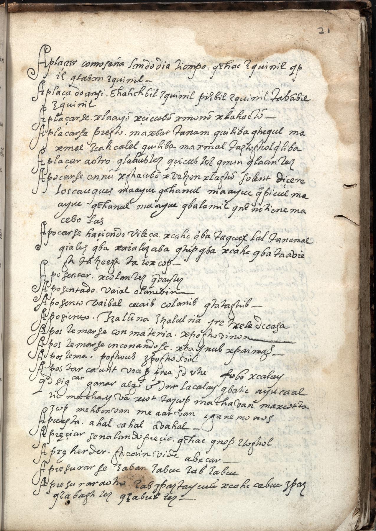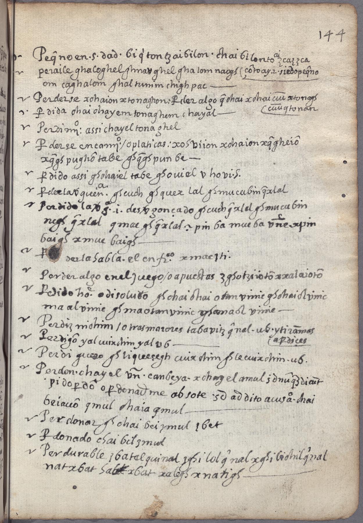 A copy, probably made in the 17th century, of an alphabetical list of Spanish names, words, and phrases, with translations in Tzeltal.