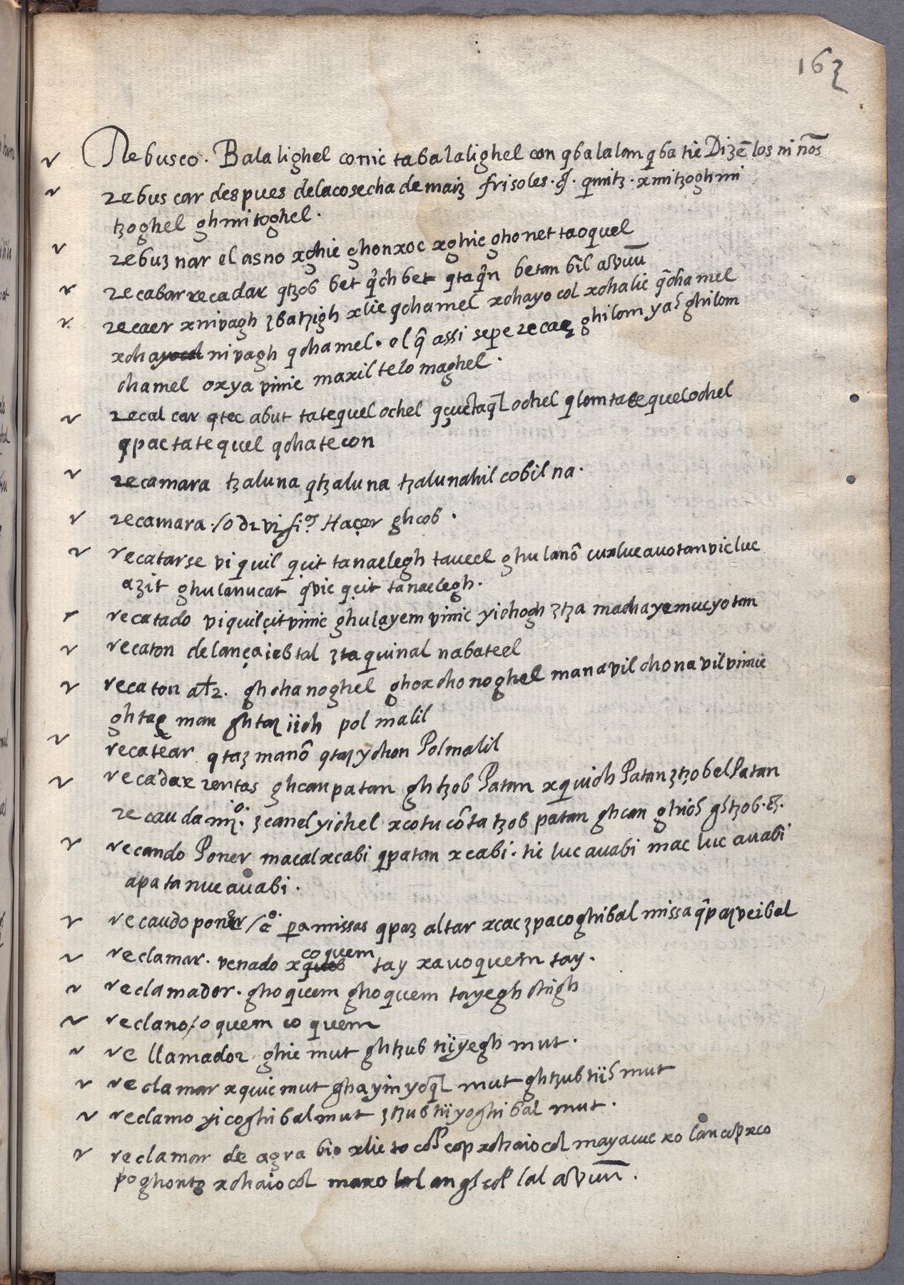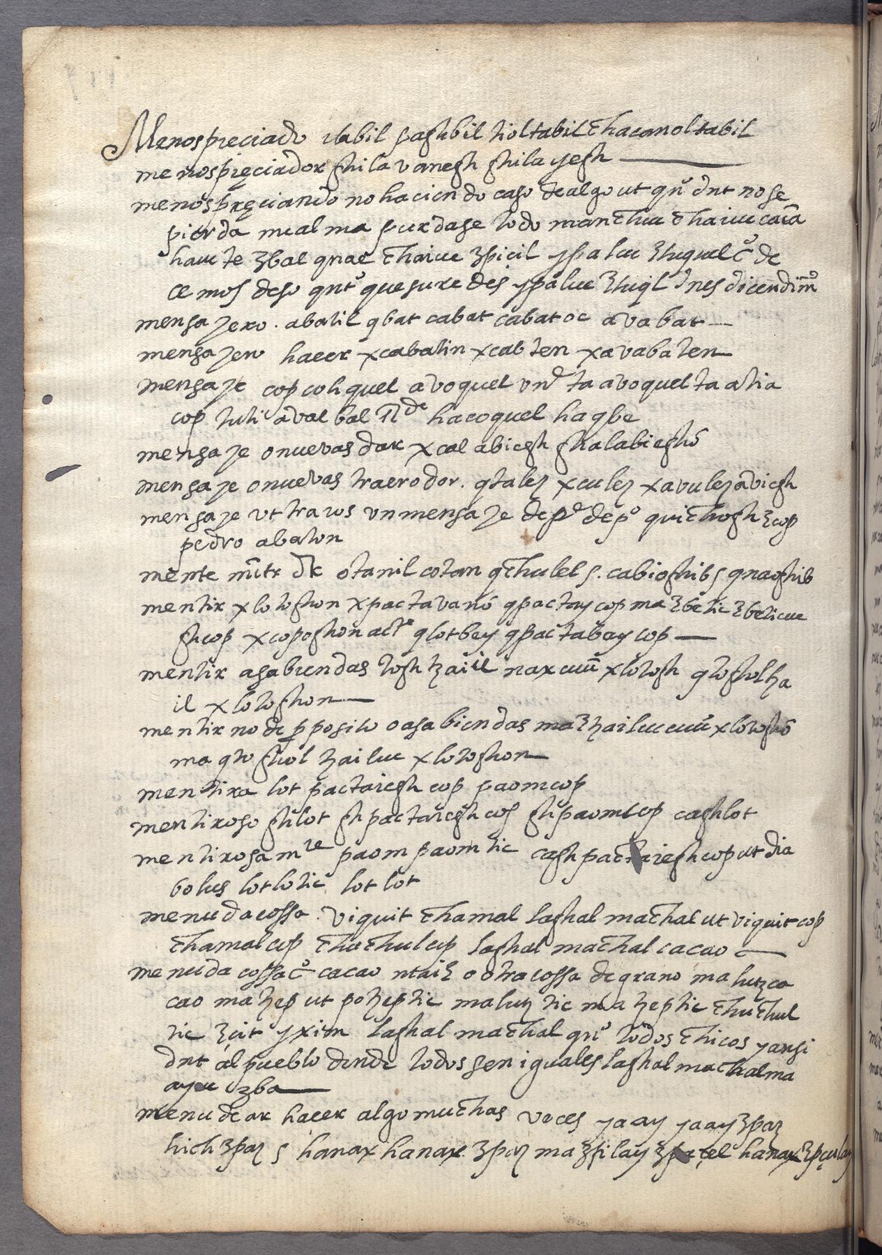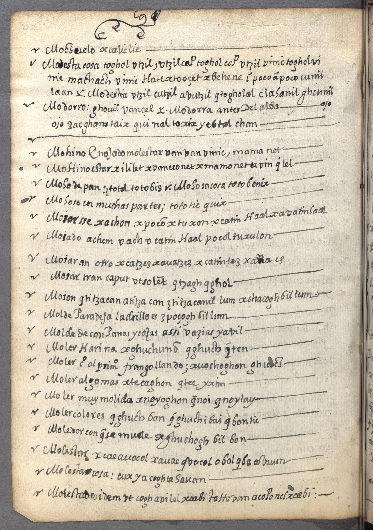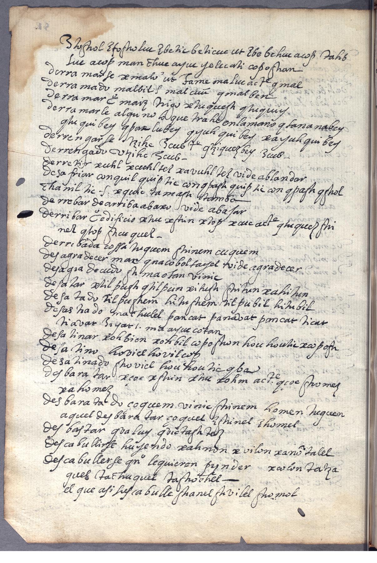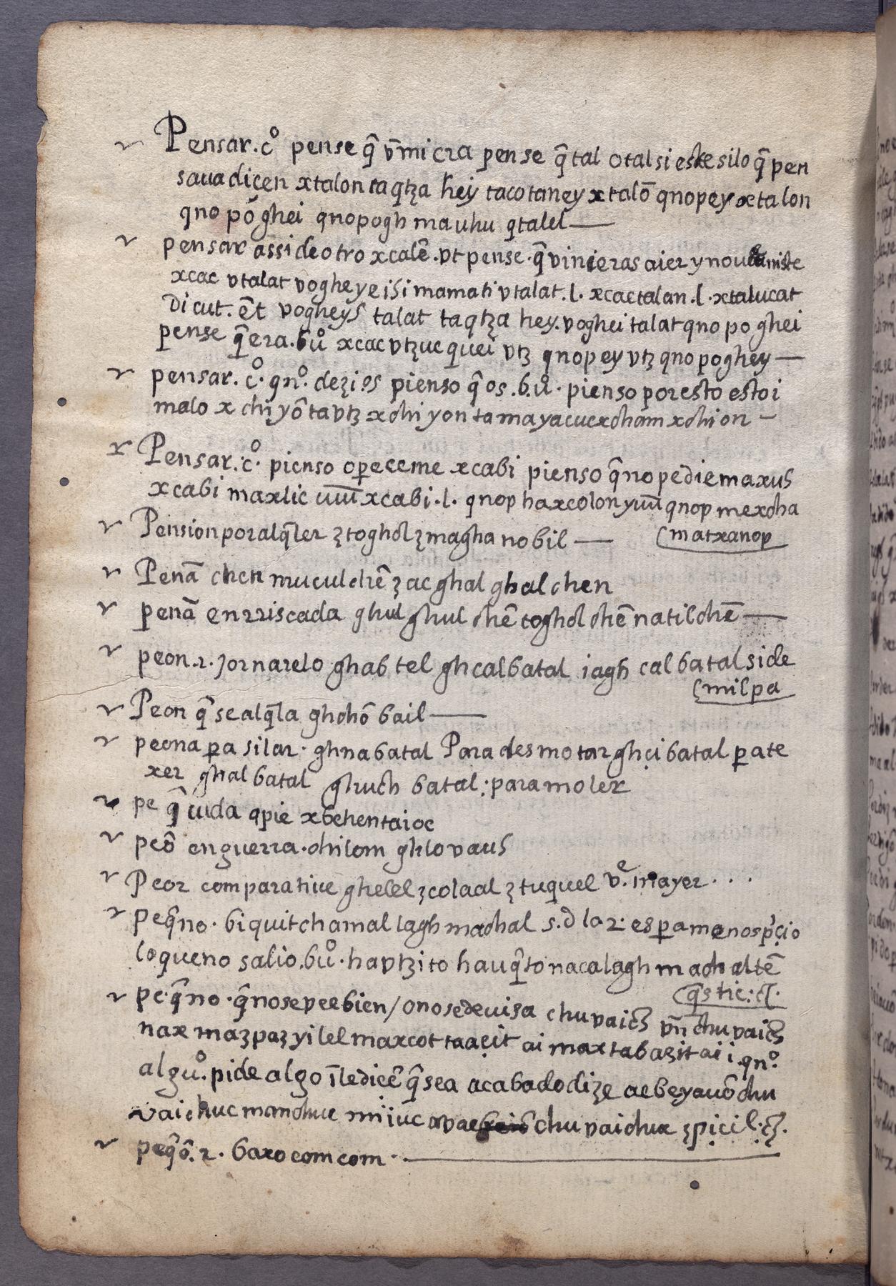 A copy, probably made in the 17th century, of an alphabetical list of Spanish names, words, and phrases, with translations in Tzeltal.