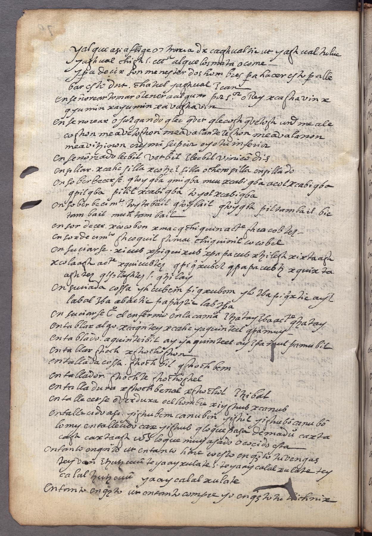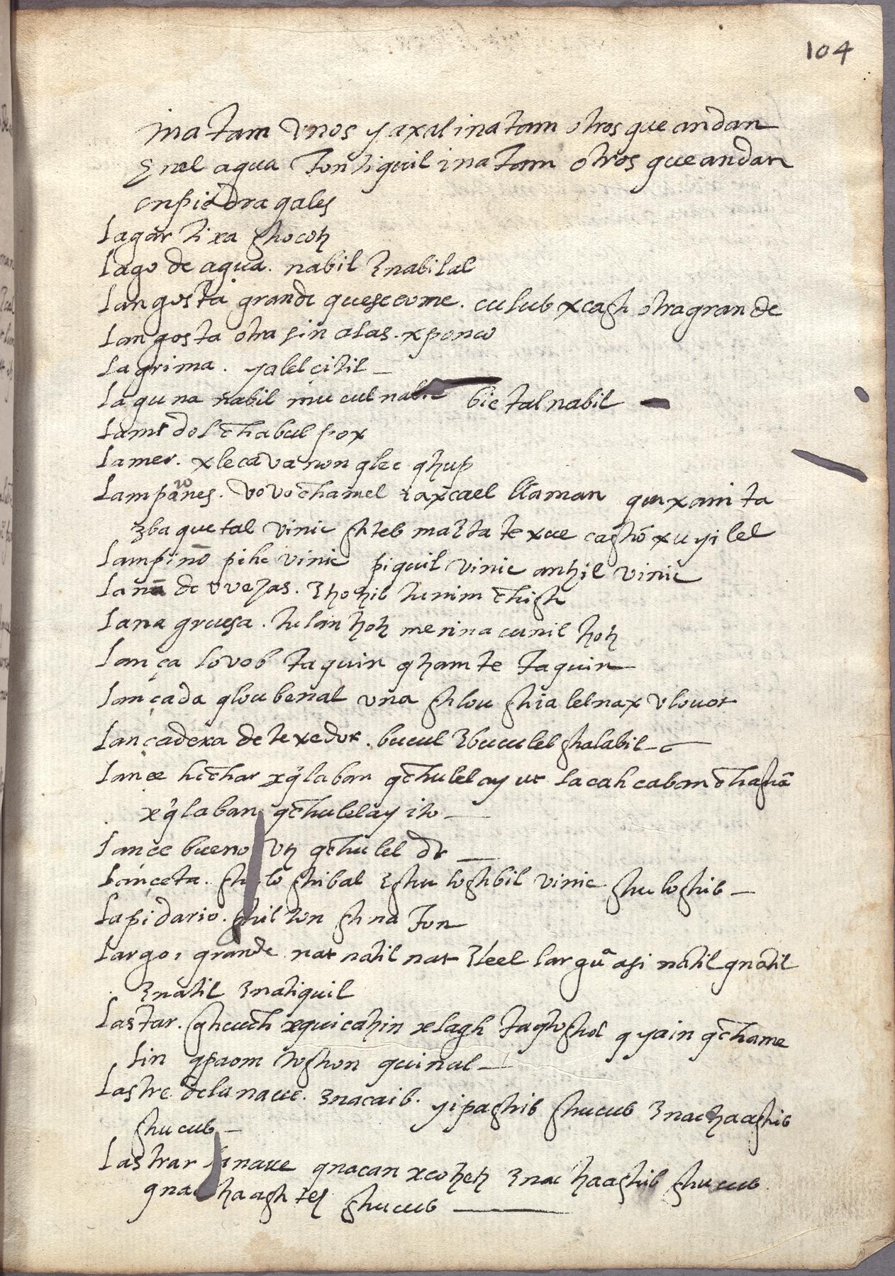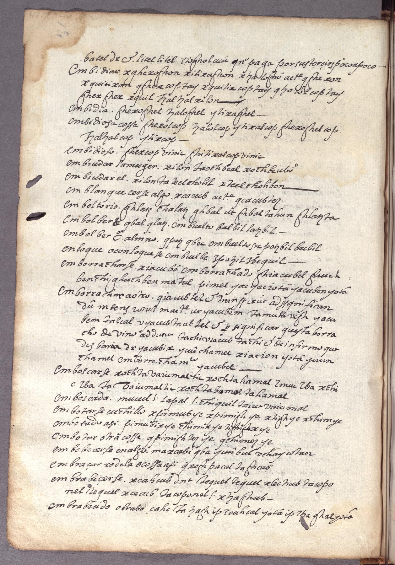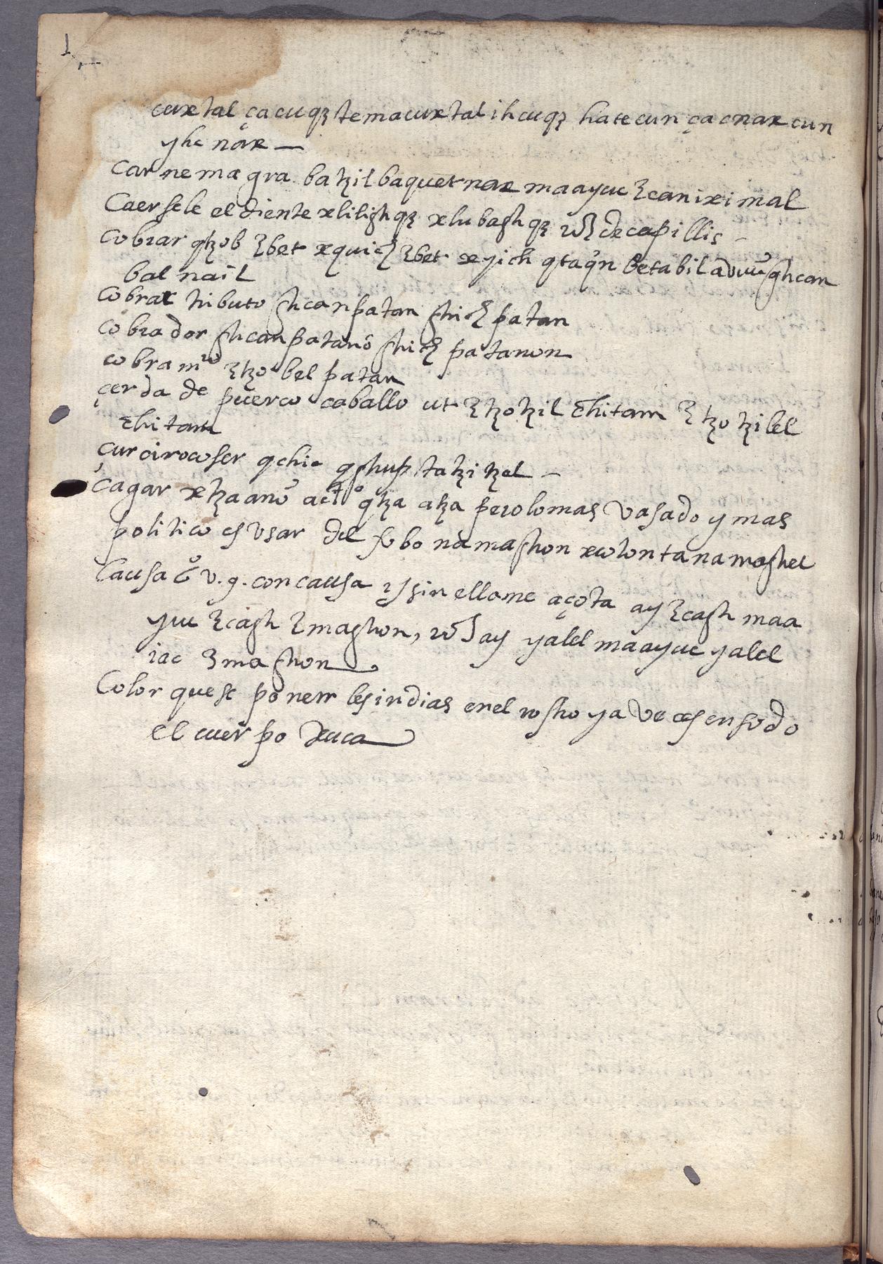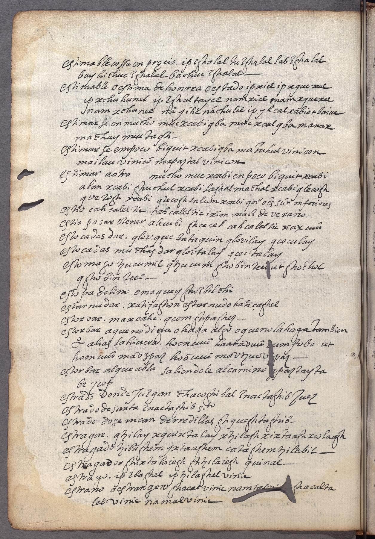 A copy, probably made in the 17th century, of an alphabetical list of Spanish names, words, and phrases, with translations in Tzeltal.