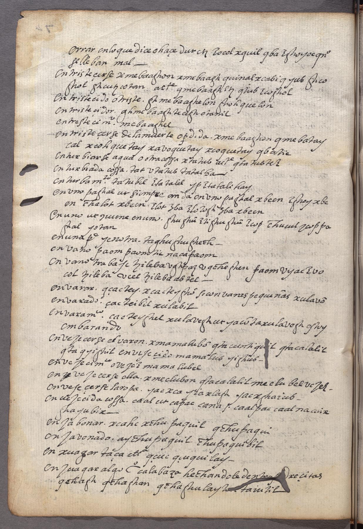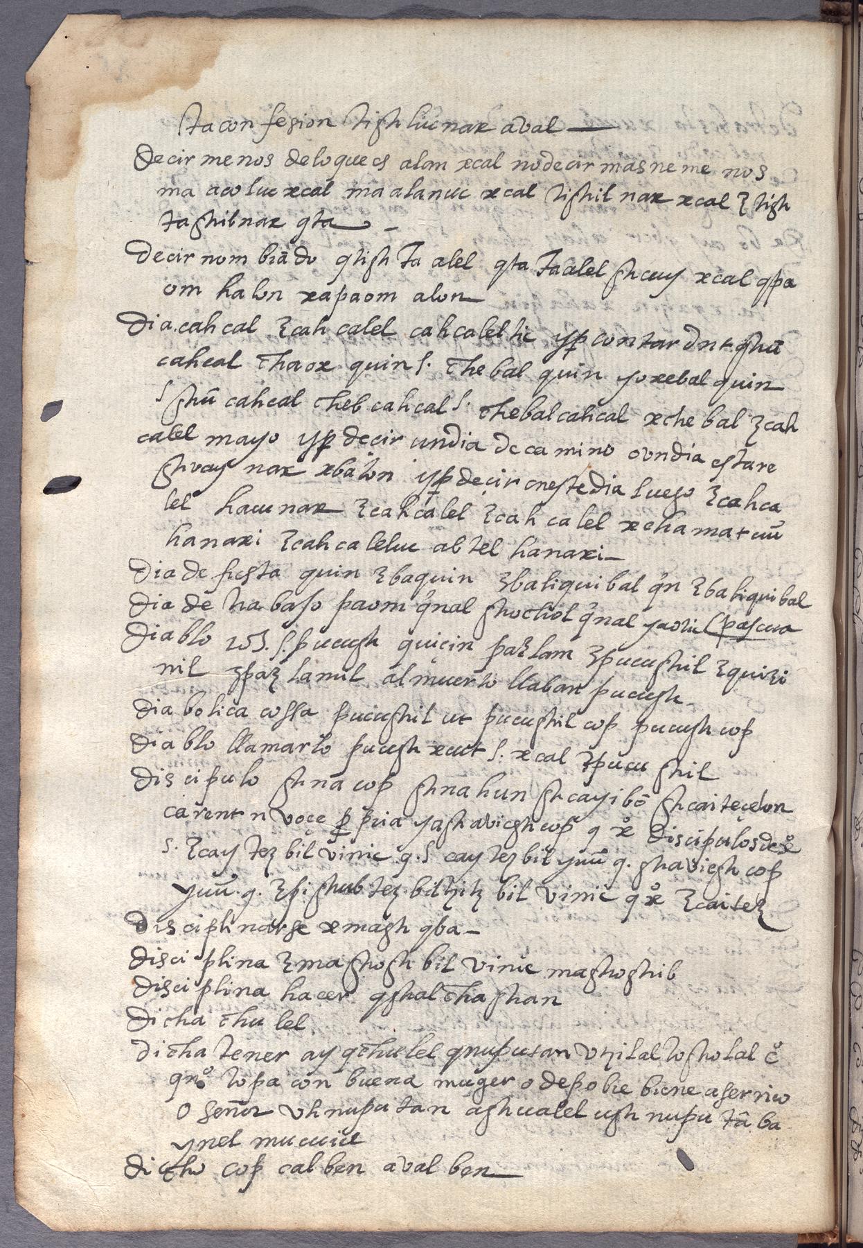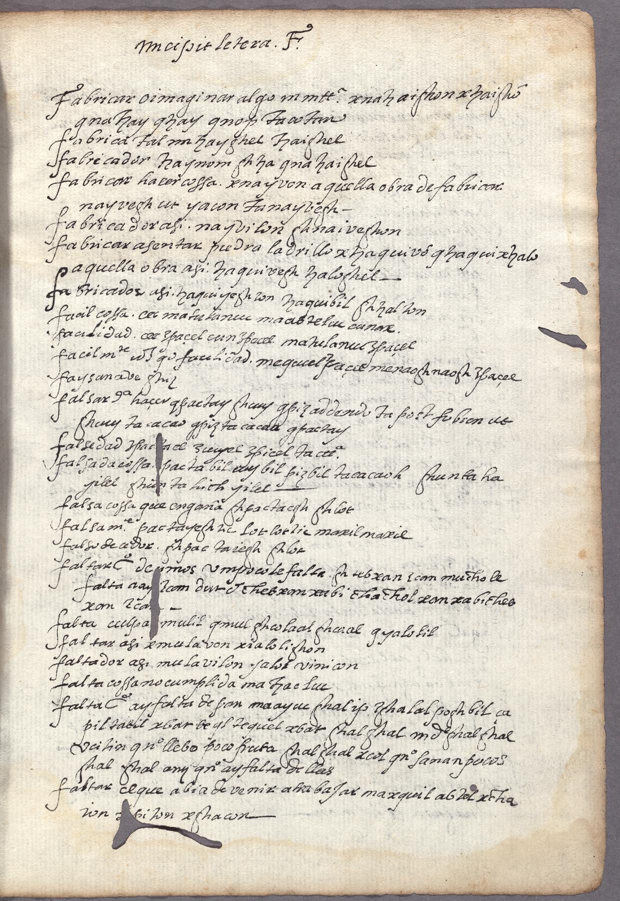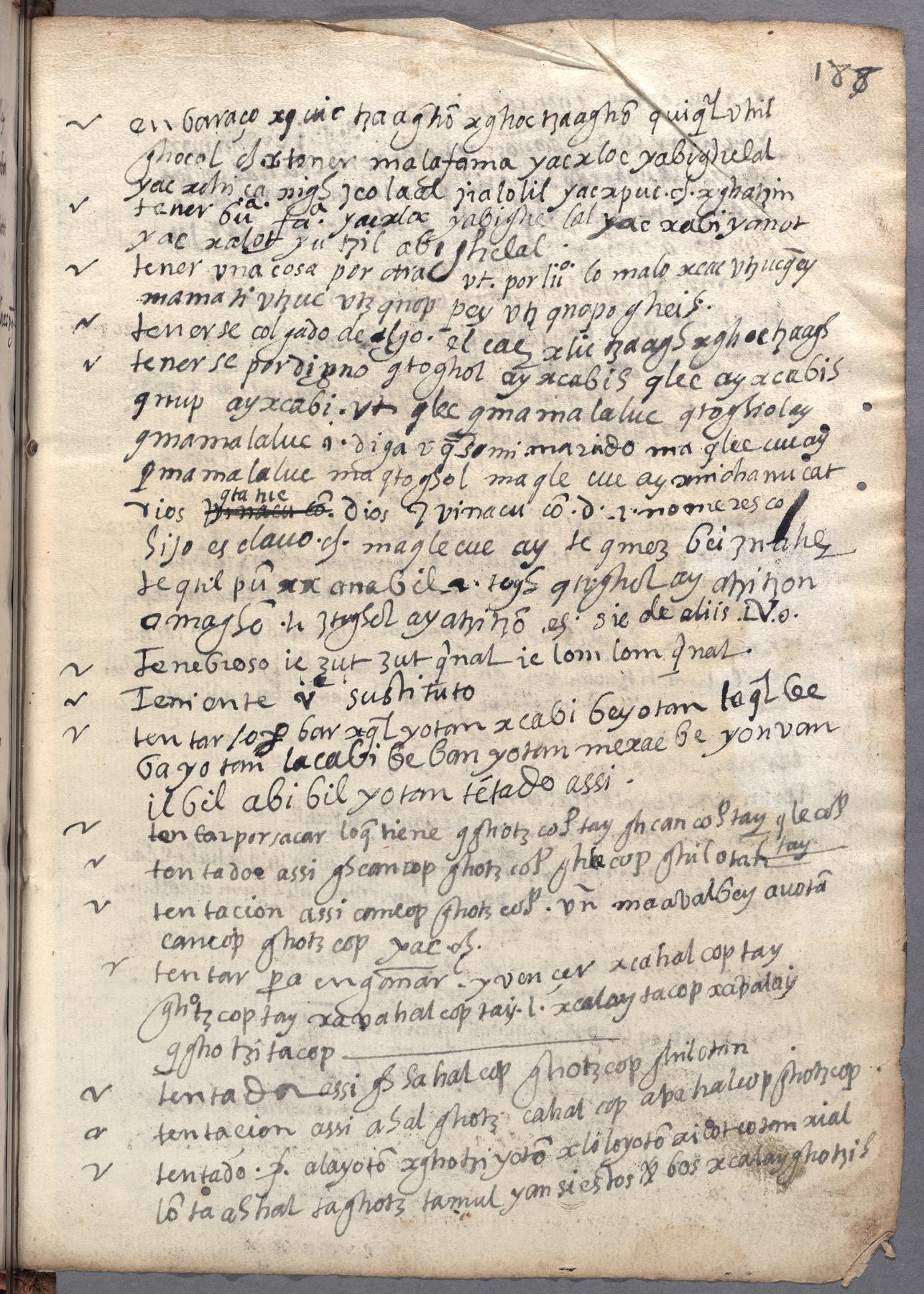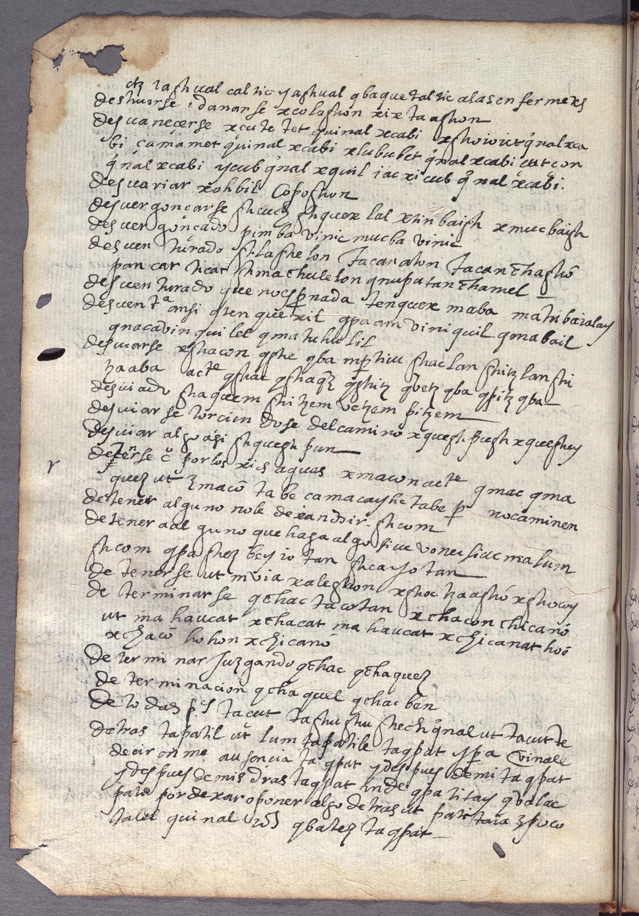 A copy, probably made in the 17th century, of an alphabetical list of Spanish names, words, and phrases, with translations in Tzeltal.