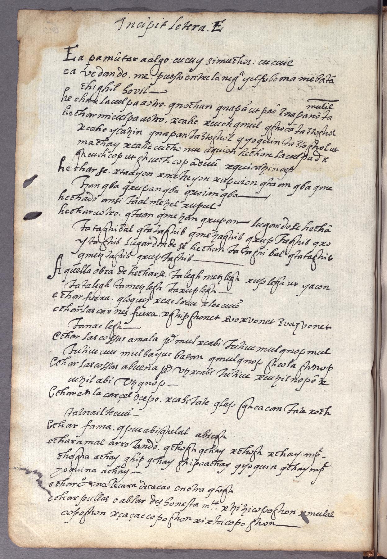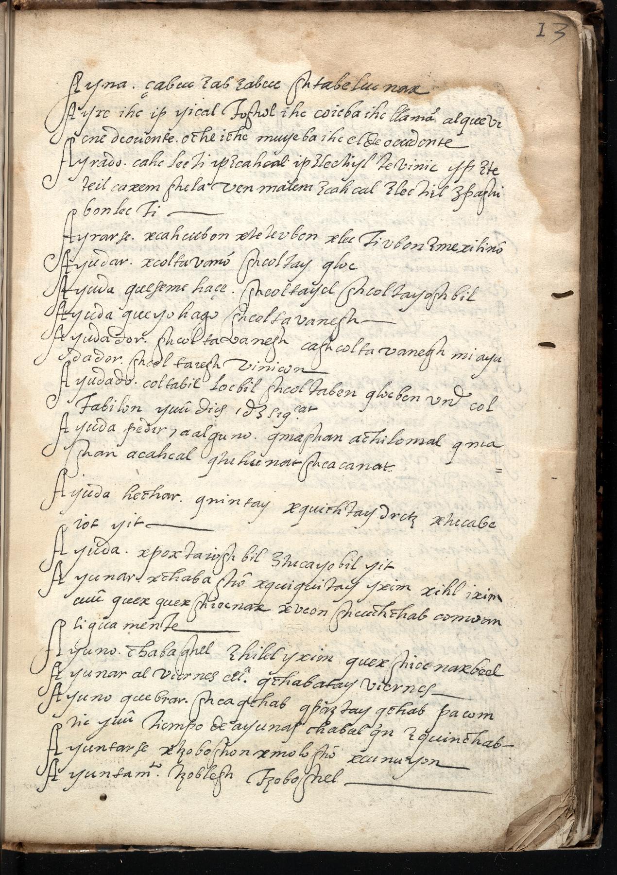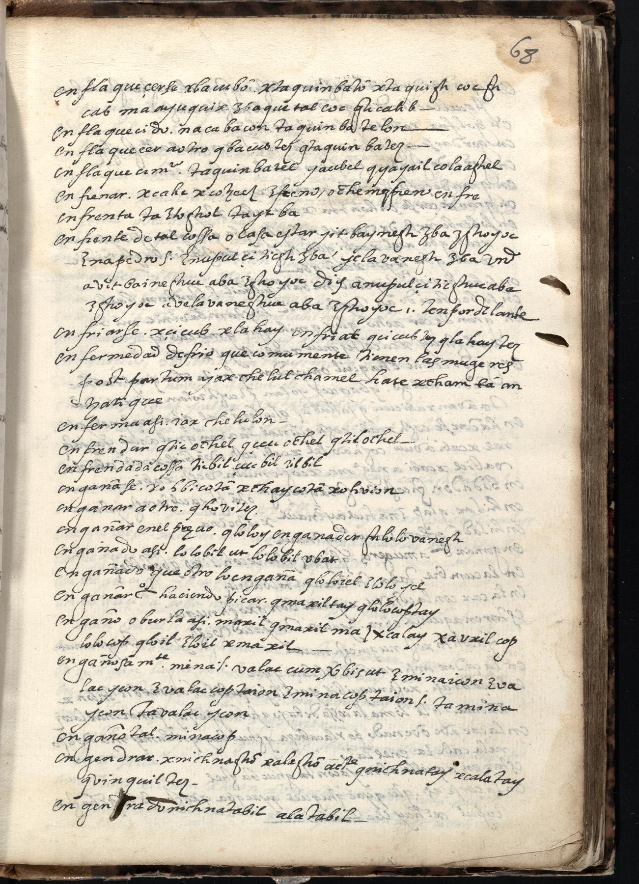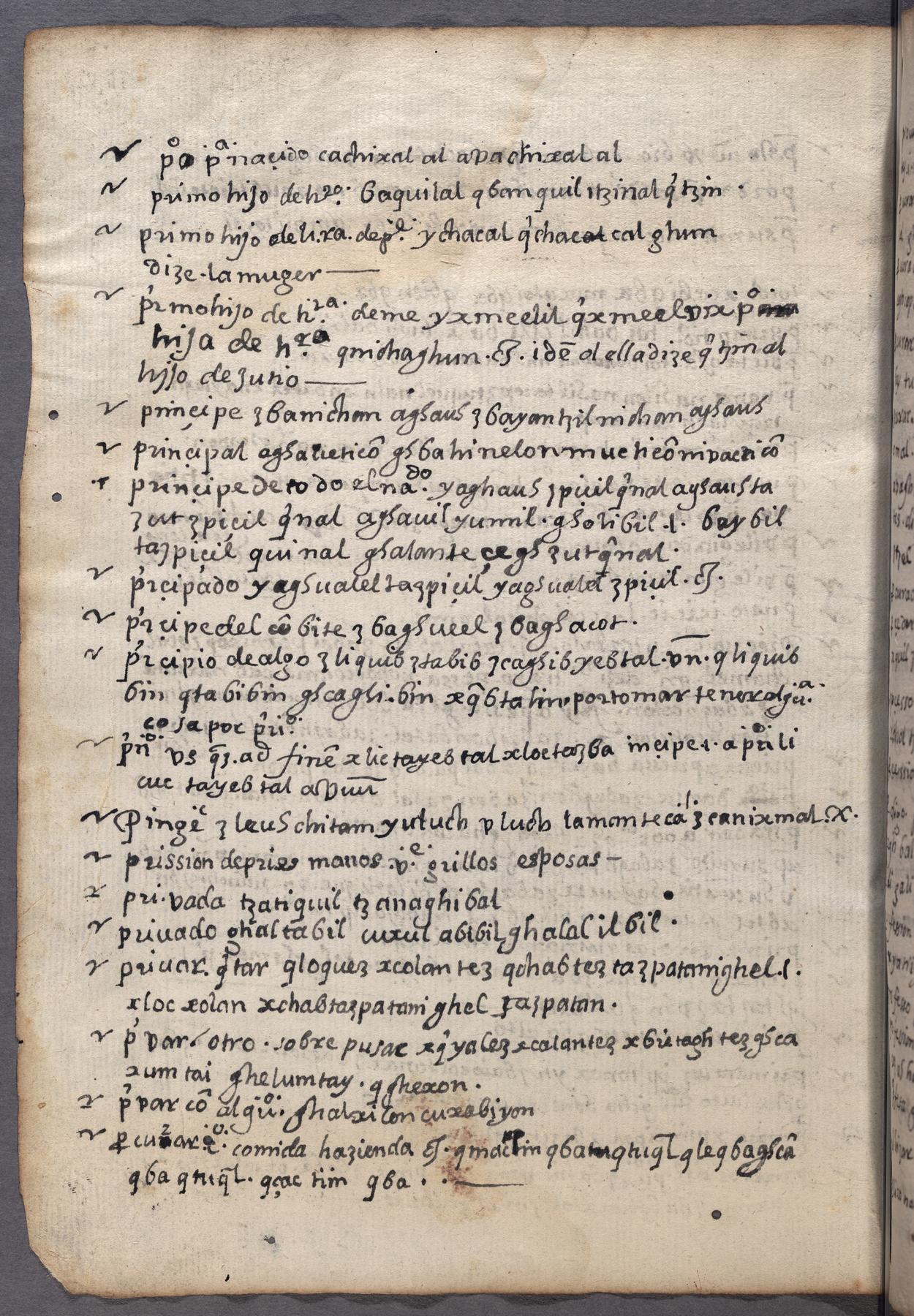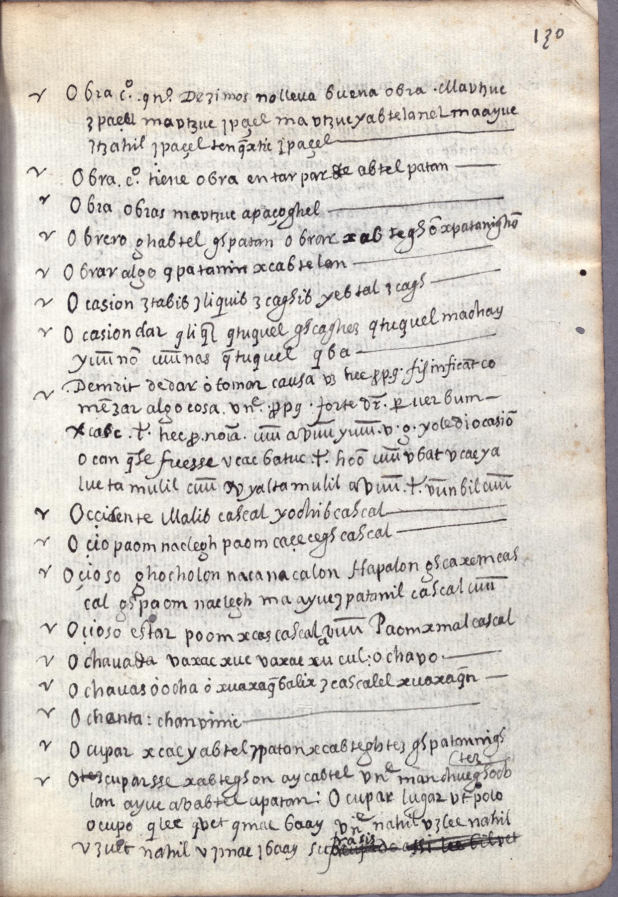 A copy, probably made in the 17th century, of an alphabetical list of Spanish names, words, and phrases, with translations in Tzeltal.