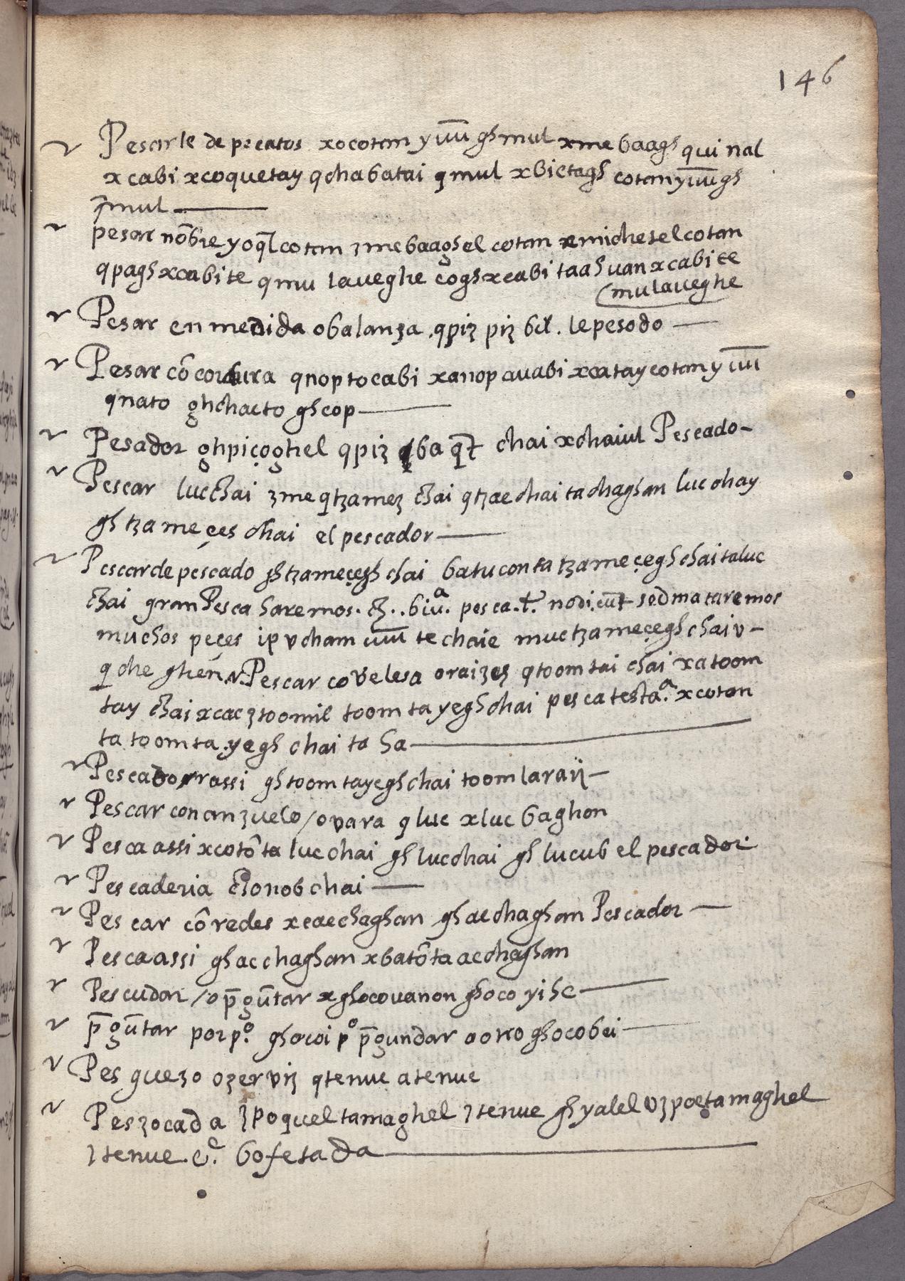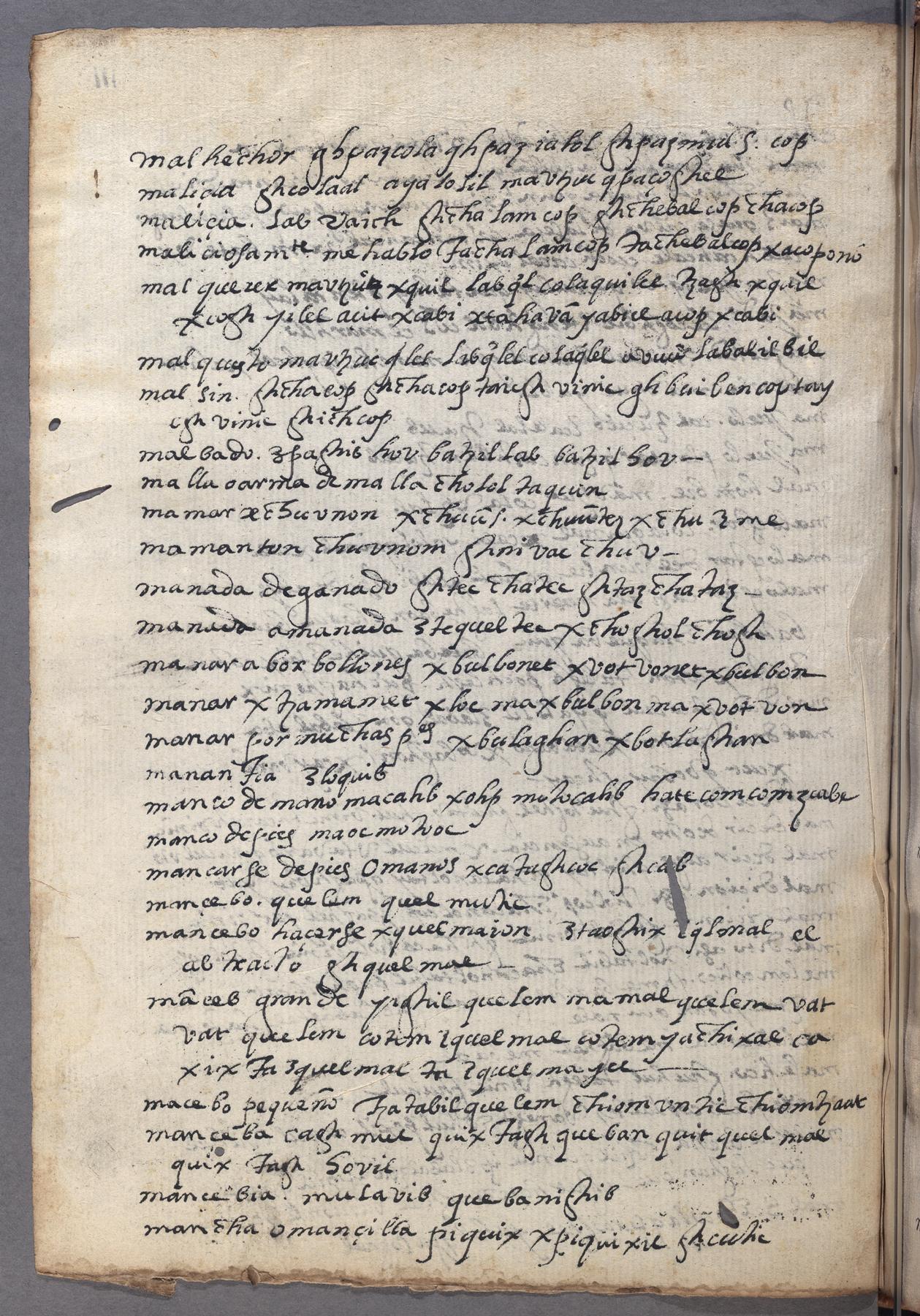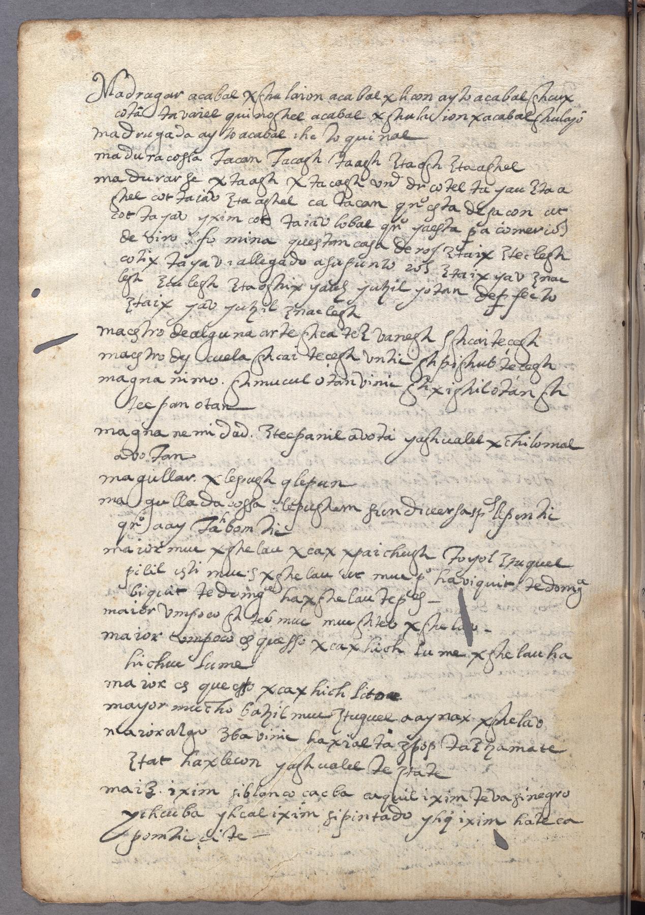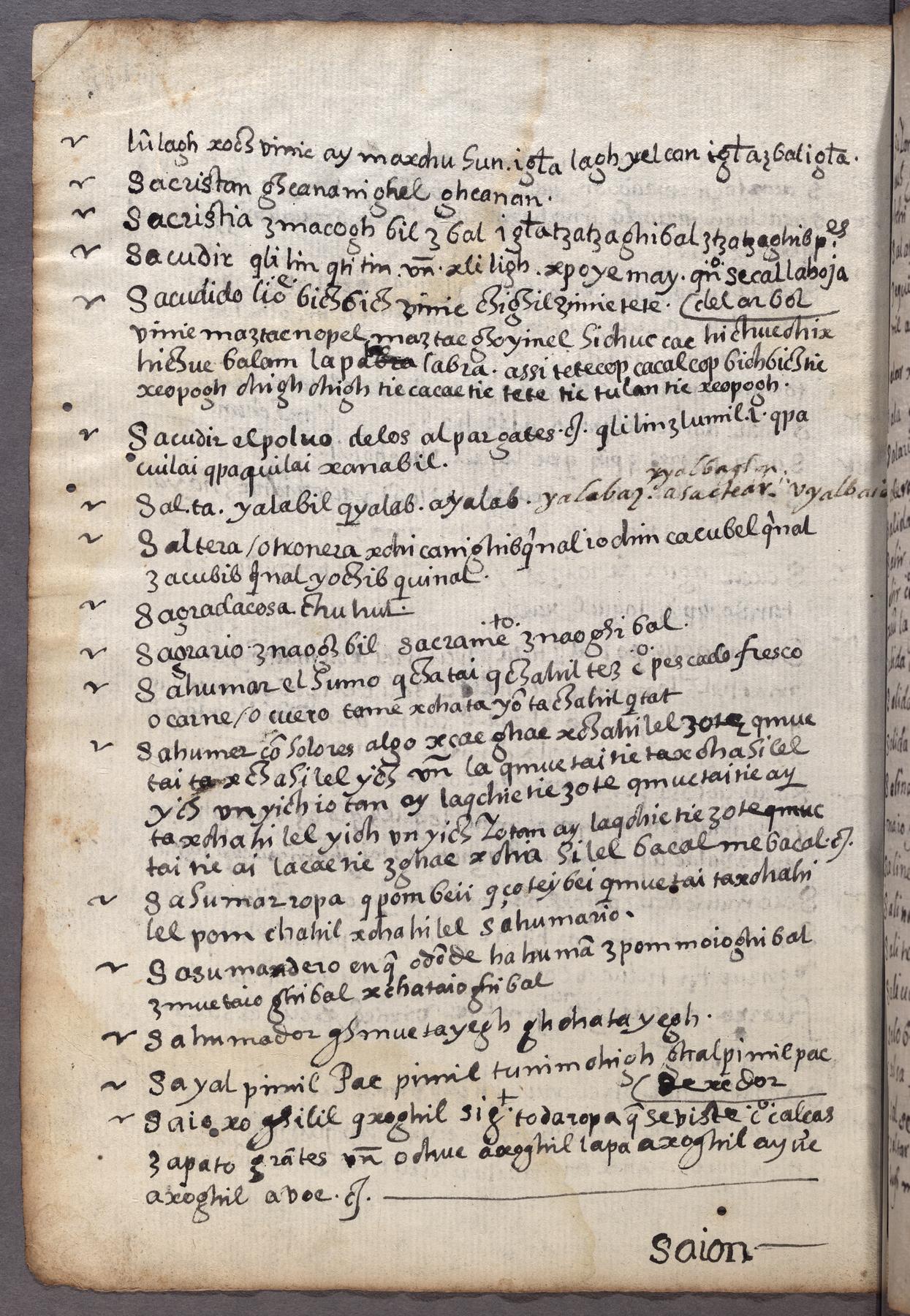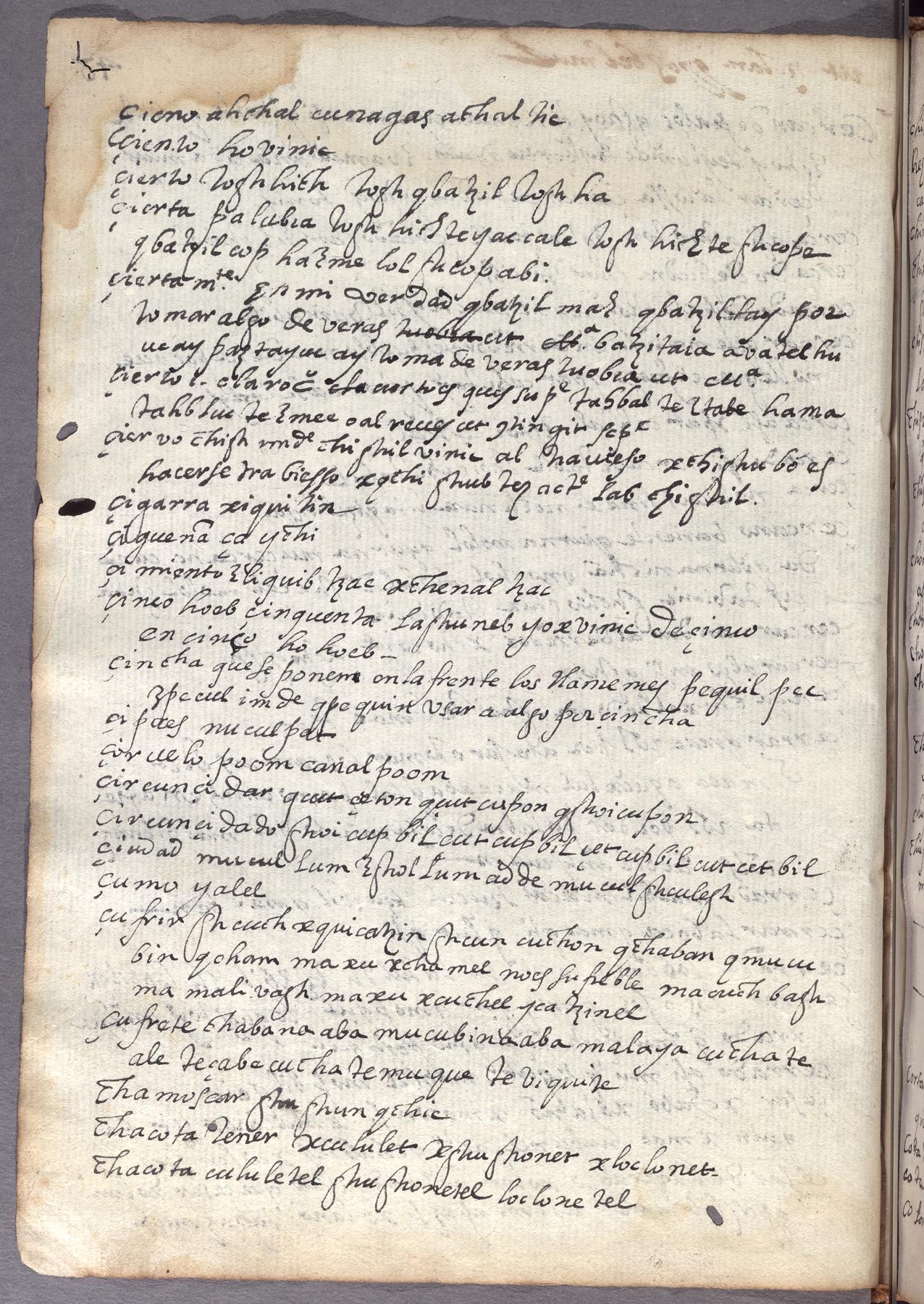 A copy, probably made in the 17th century, of an alphabetical list of Spanish names, words, and phrases, with translations in Tzeltal.