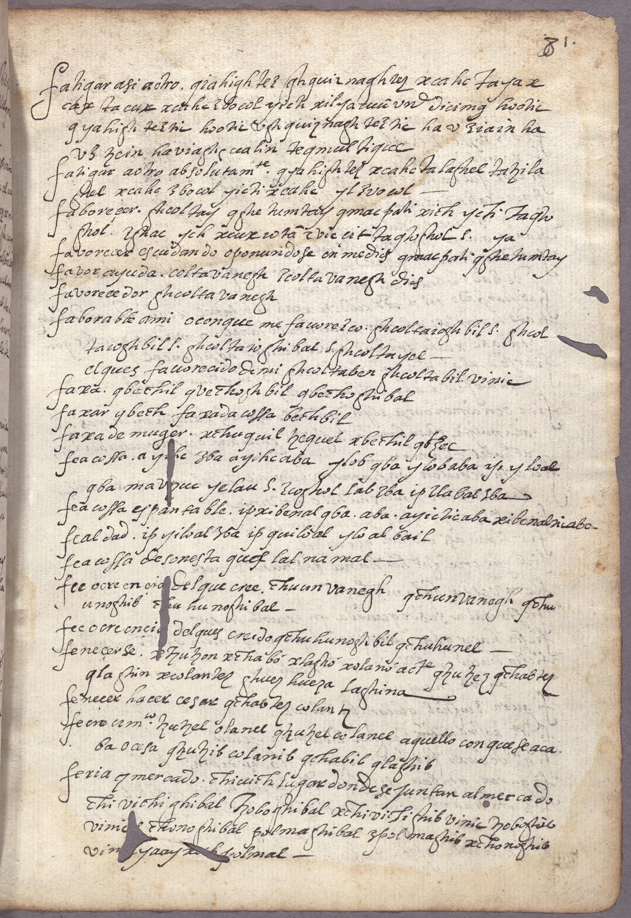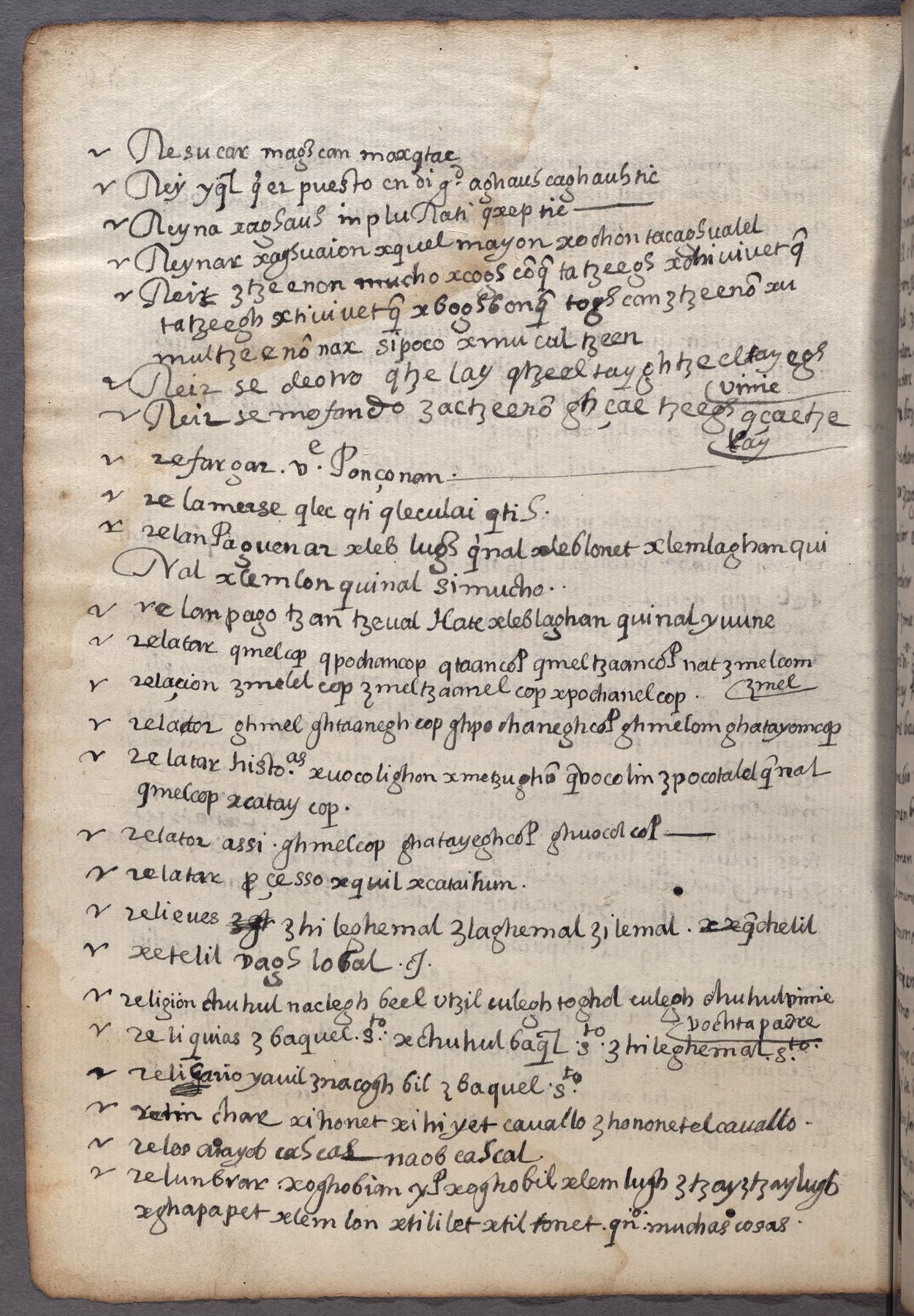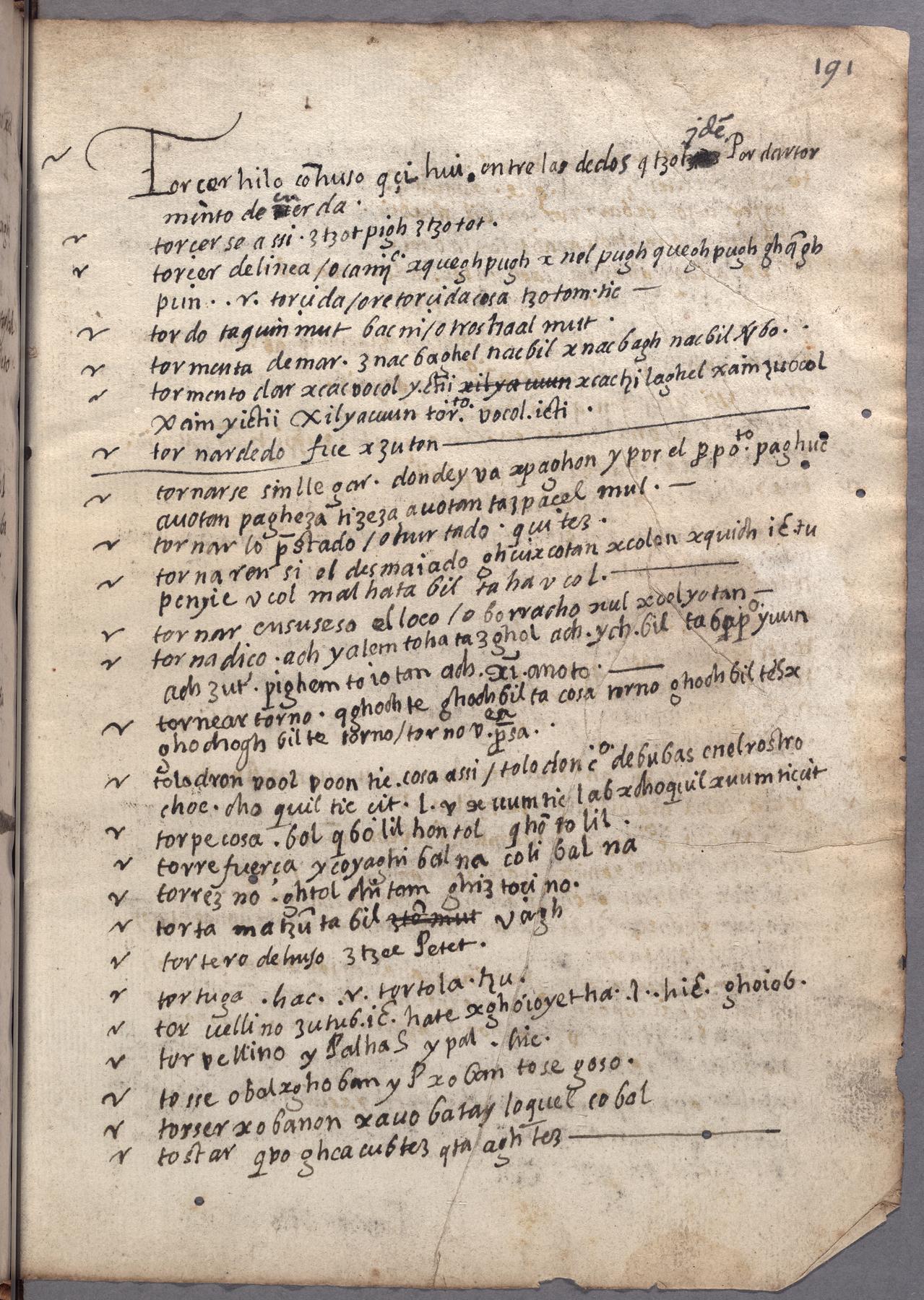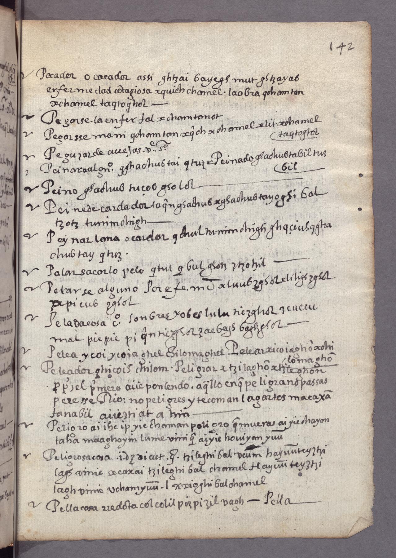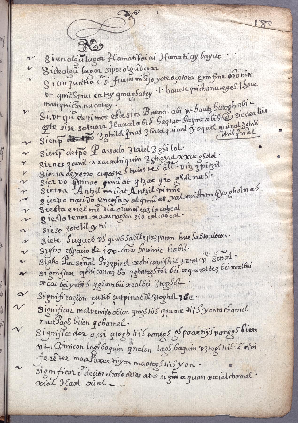 A copy, probably made in the 17th century, of an alphabetical list of Spanish names, words, and phrases, with translations in Tzeltal.