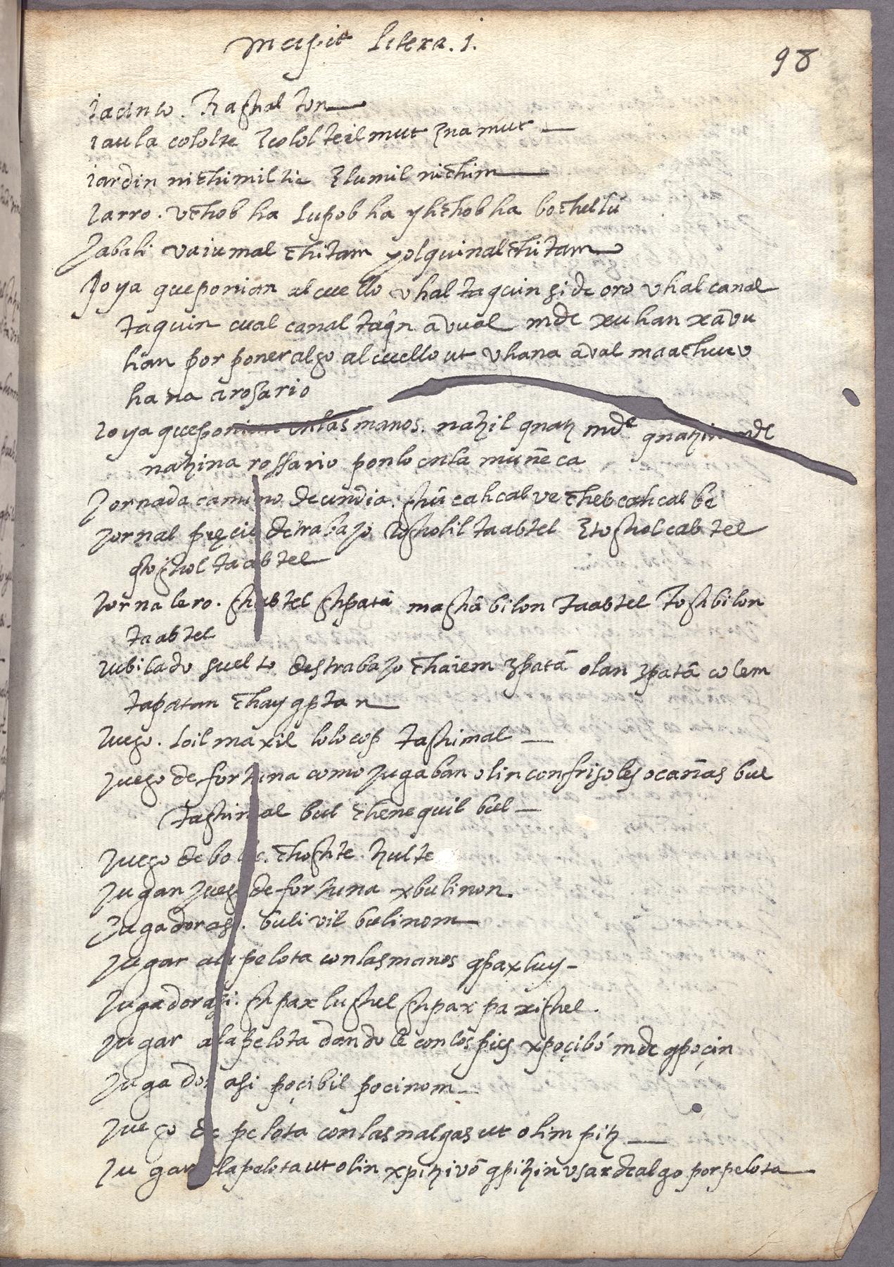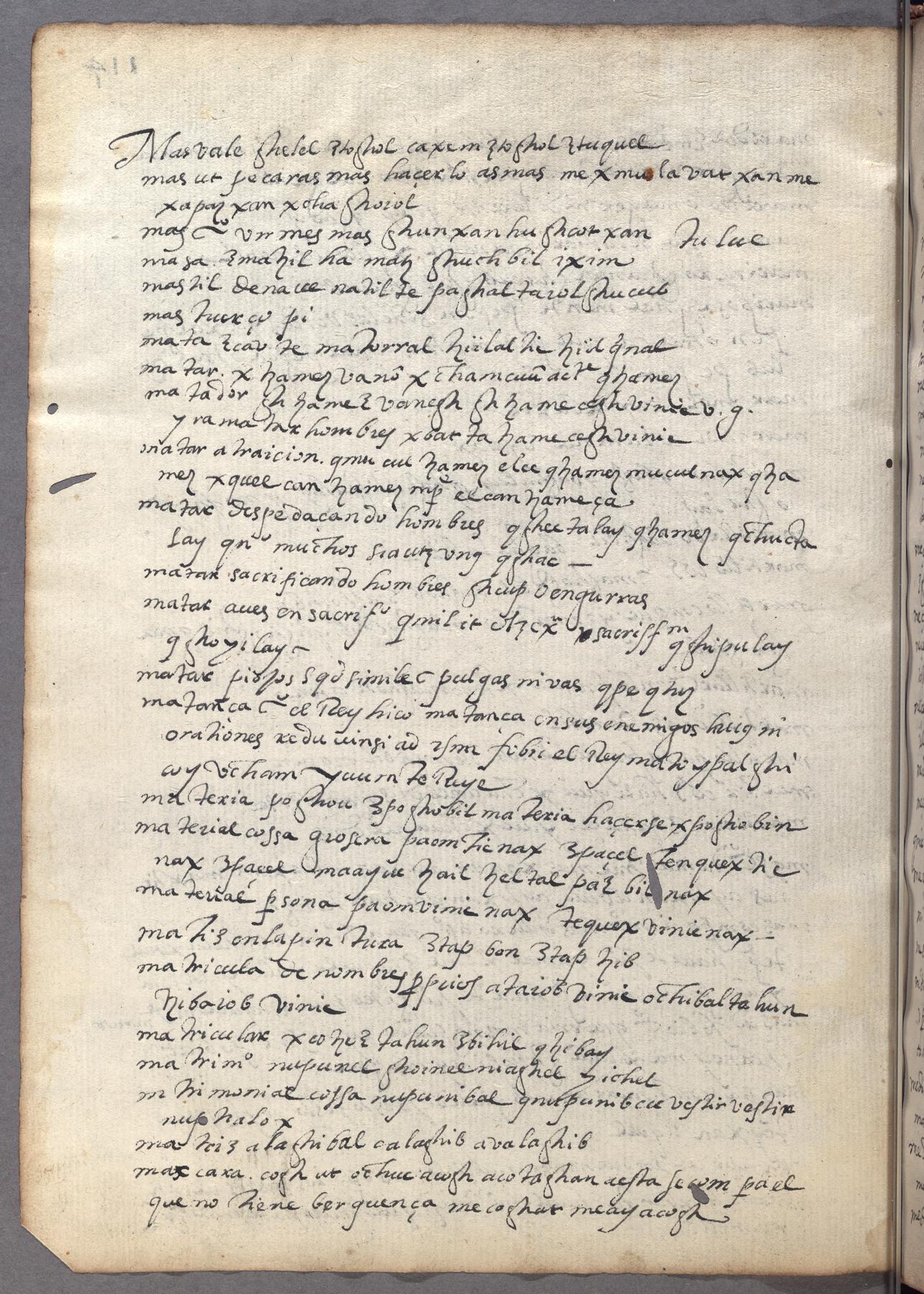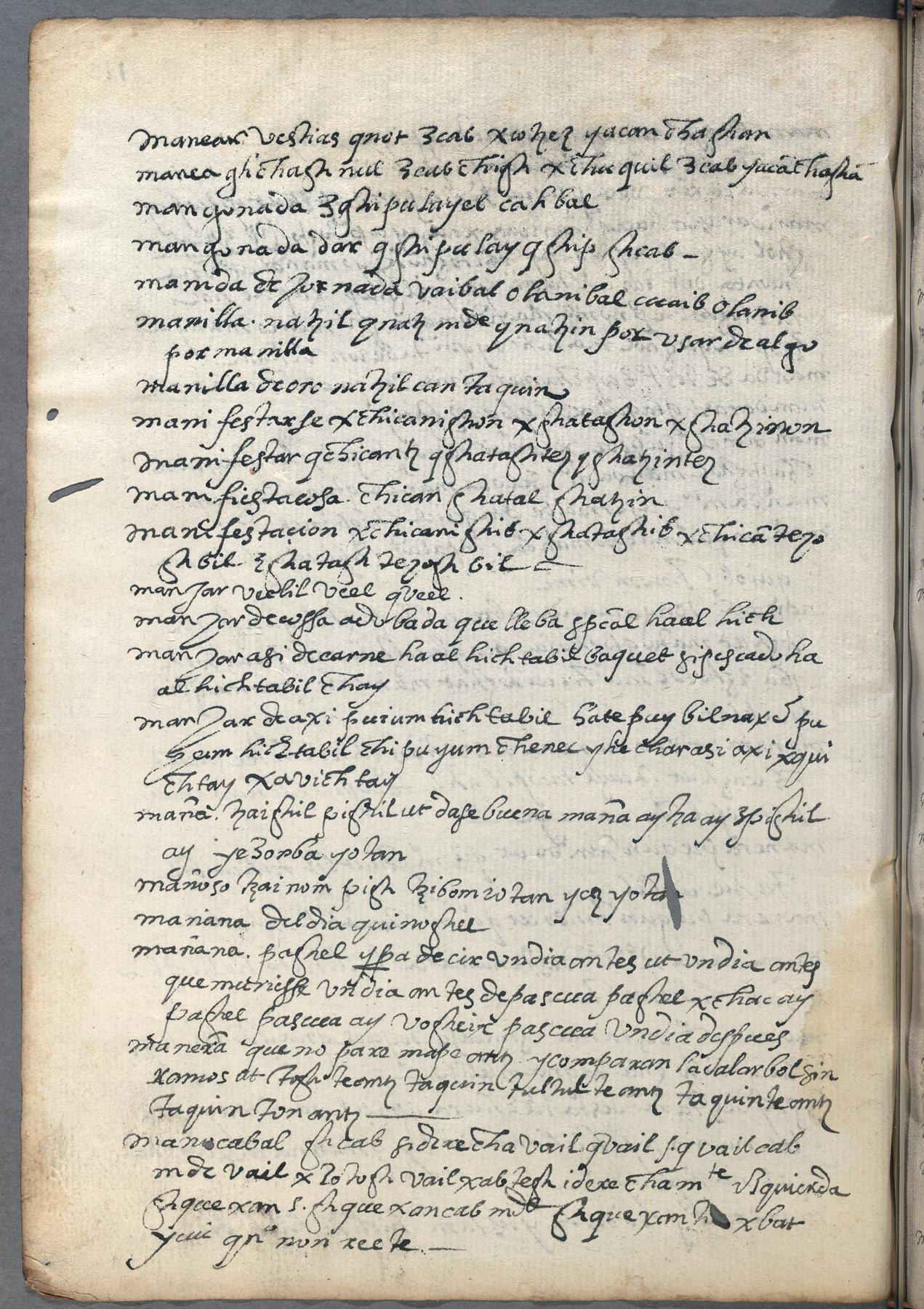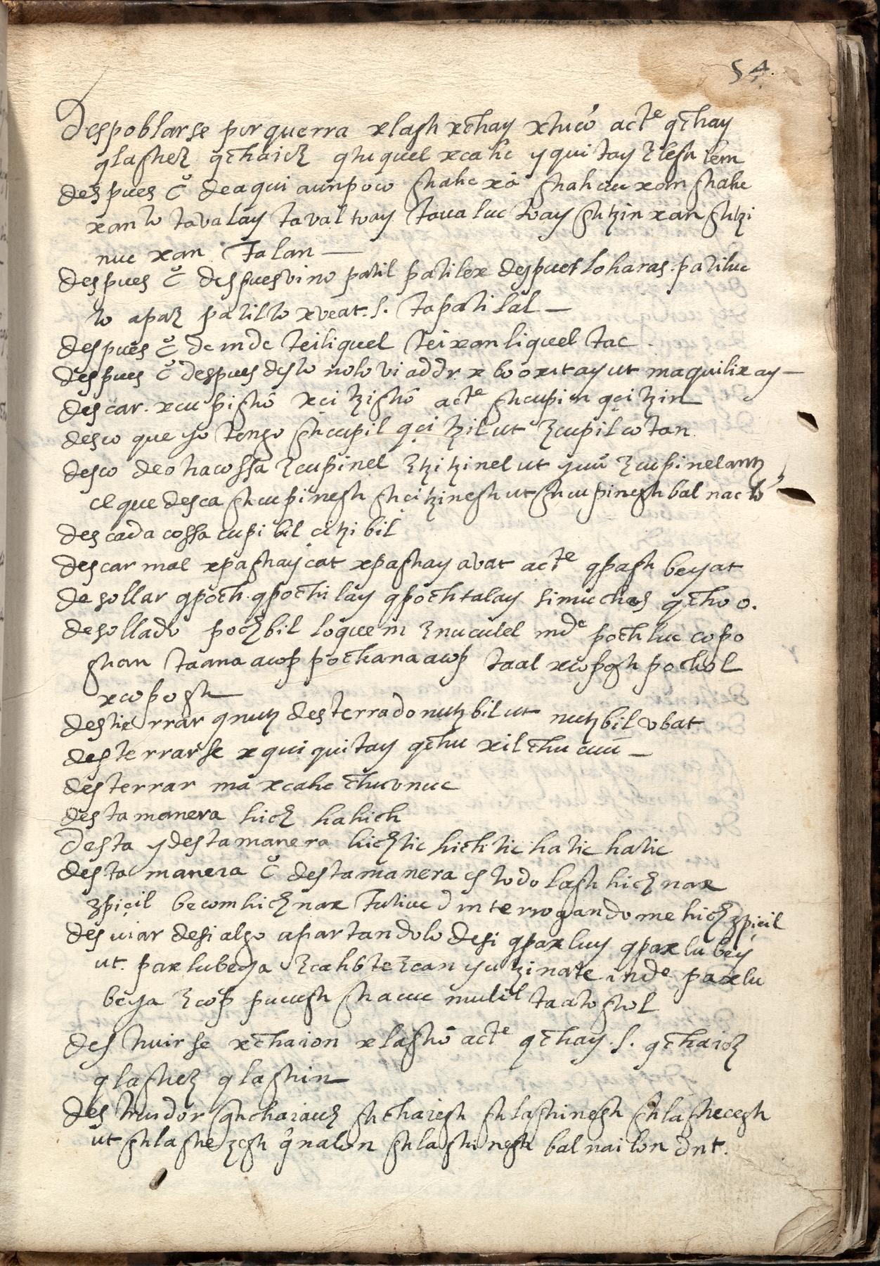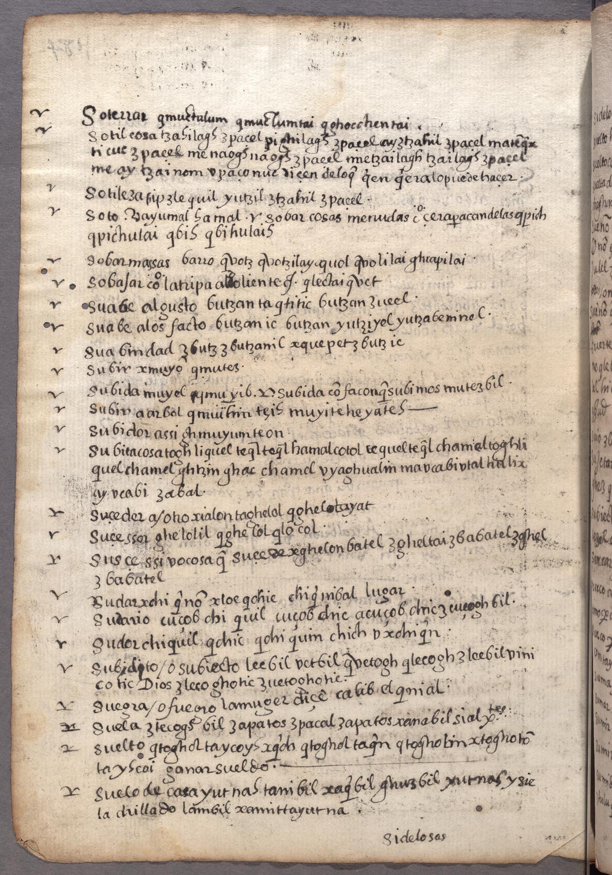 A copy, probably made in the 17th century, of an alphabetical list of Spanish names, words, and phrases, with translations in Tzeltal.