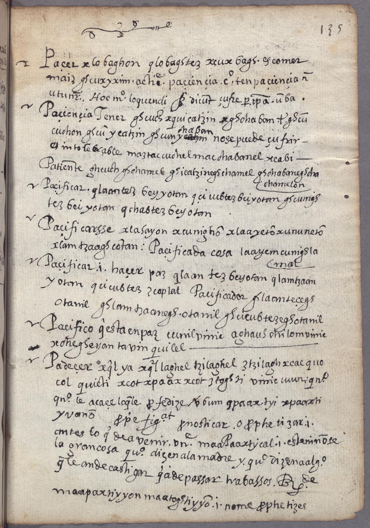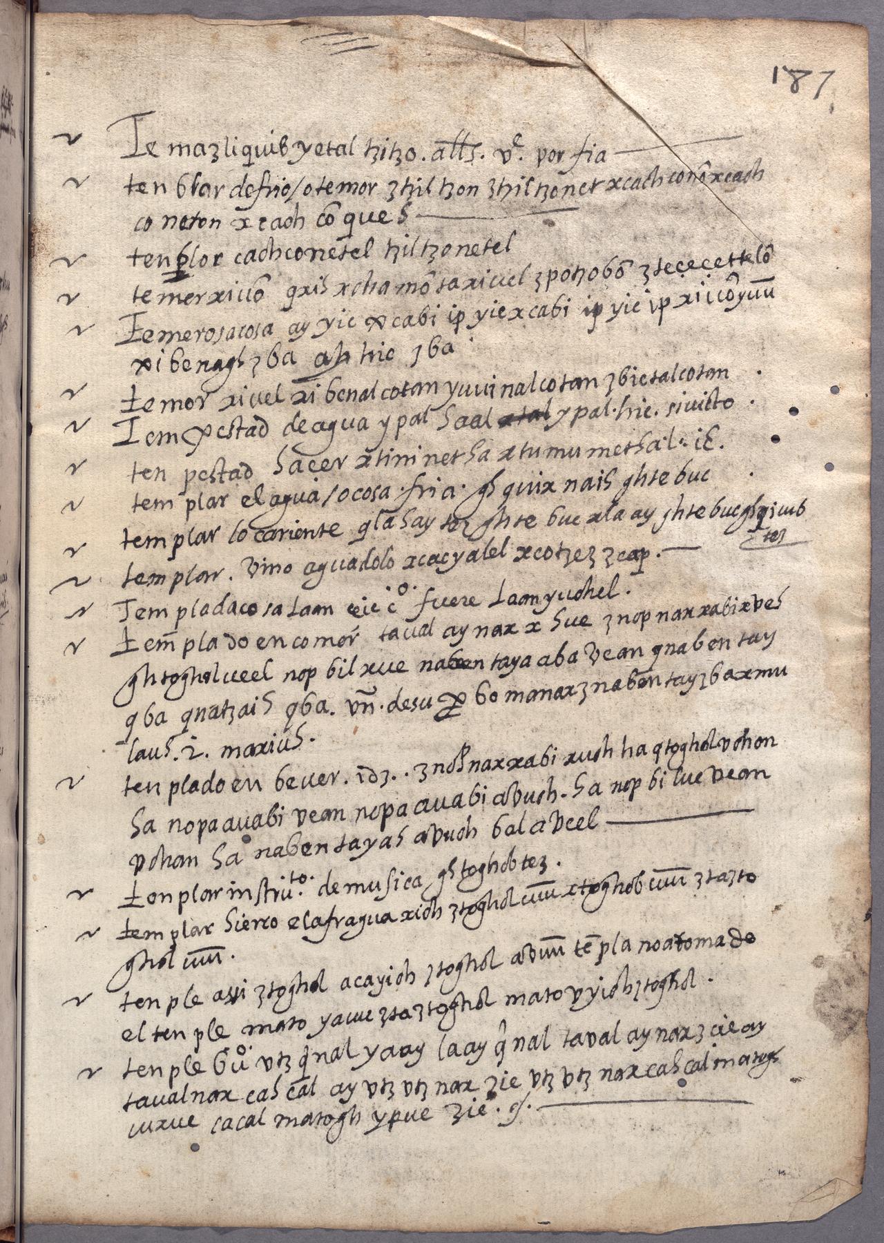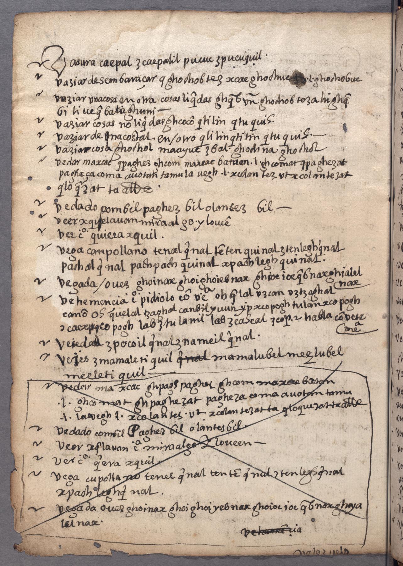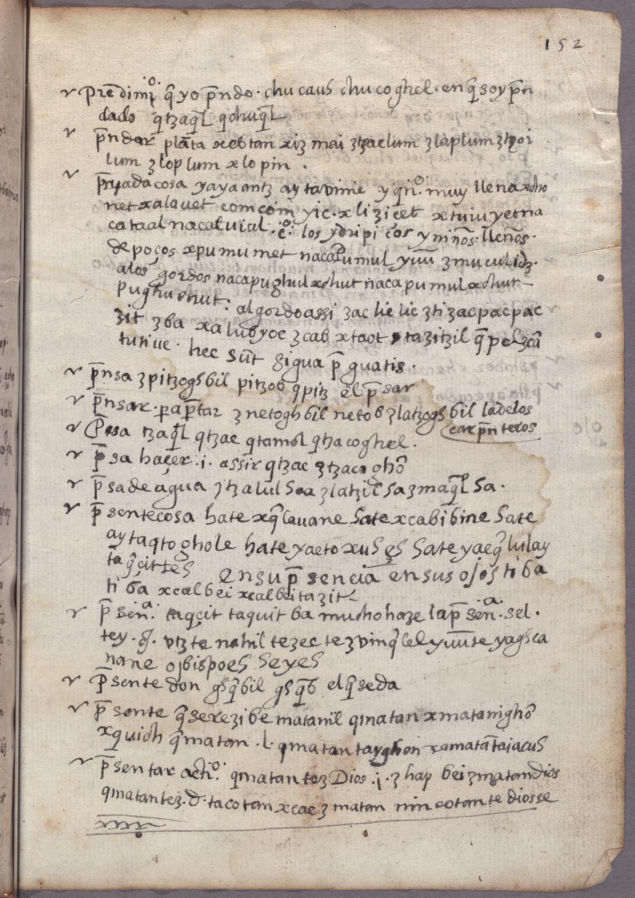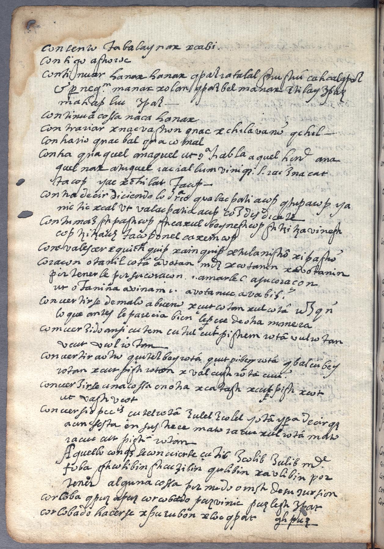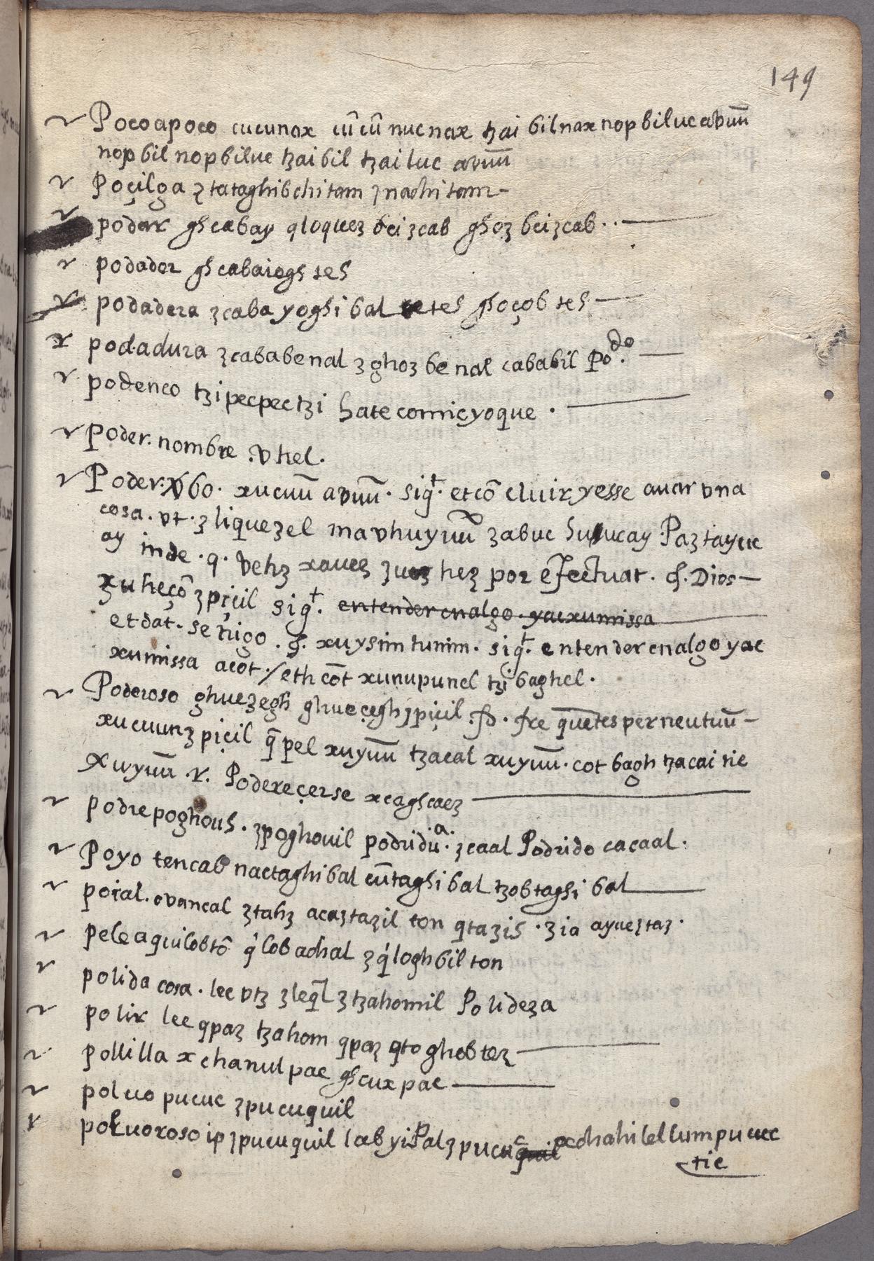 A copy, probably made in the 17th century, of an alphabetical list of Spanish names, words, and phrases, with translations in Tzeltal.