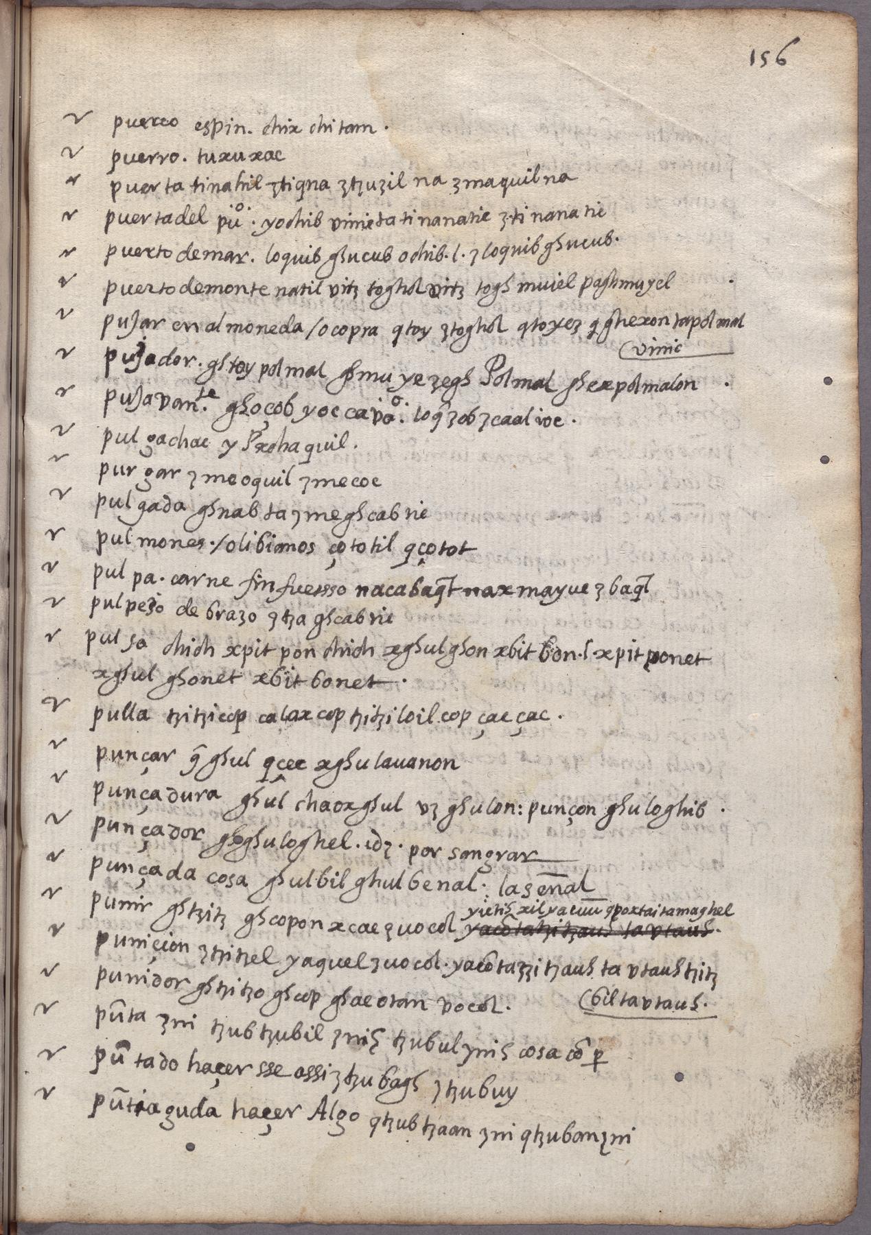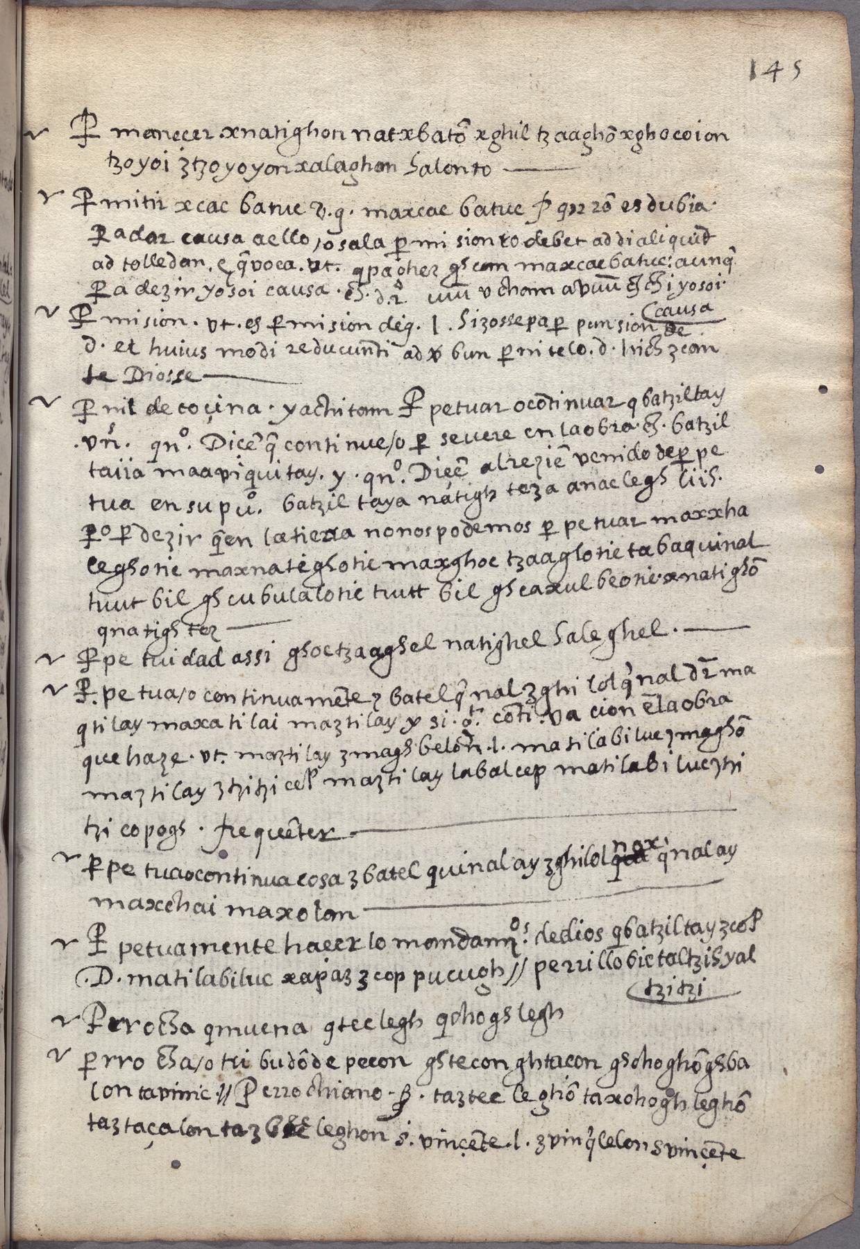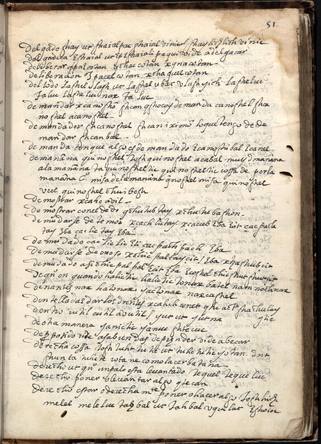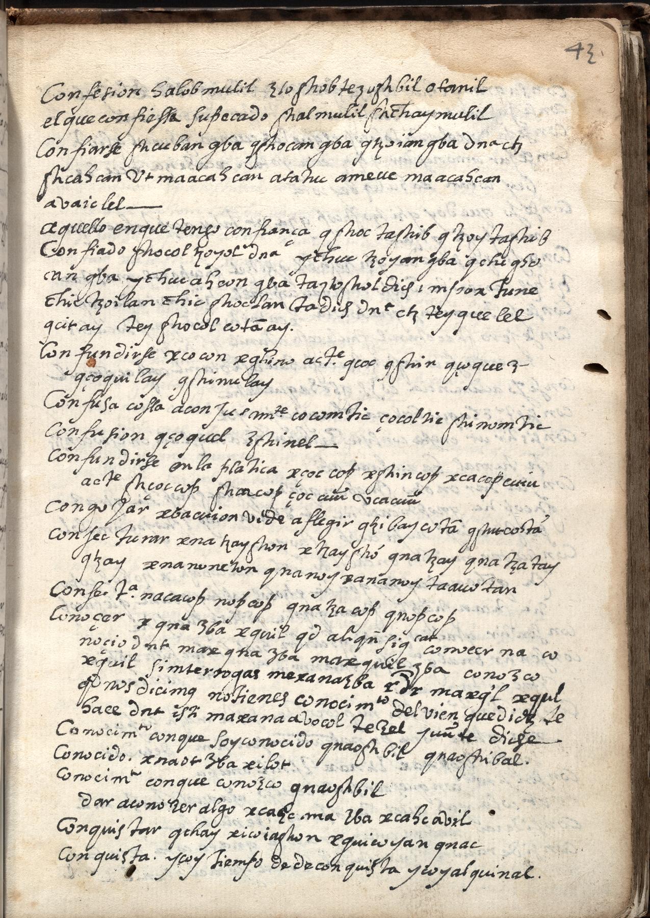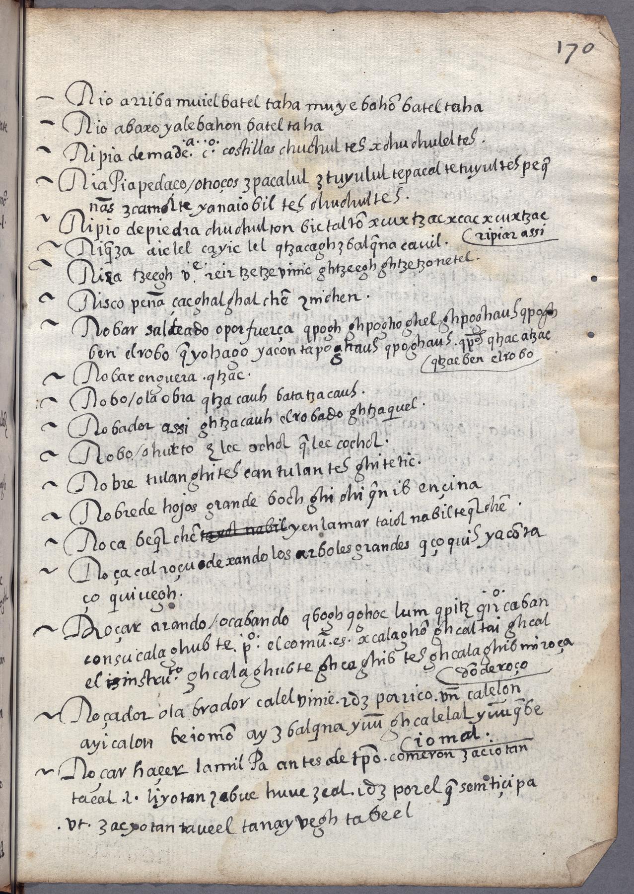 A copy, probably made in the 17th century, of an alphabetical list of Spanish names, words, and phrases, with translations in Tzeltal.