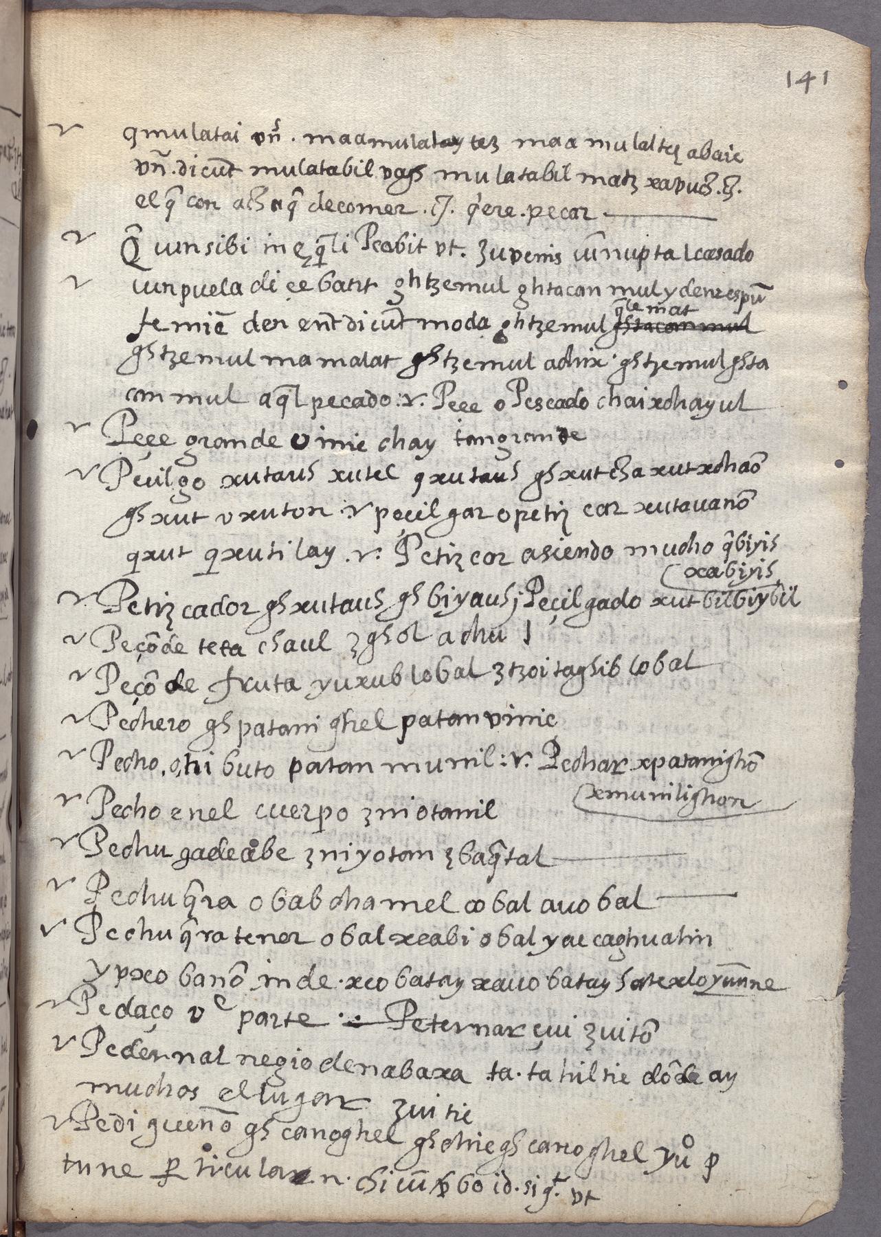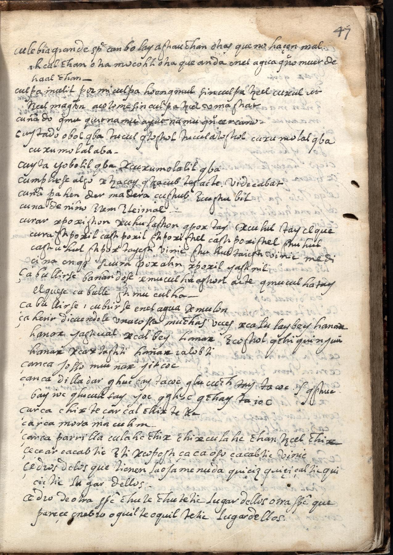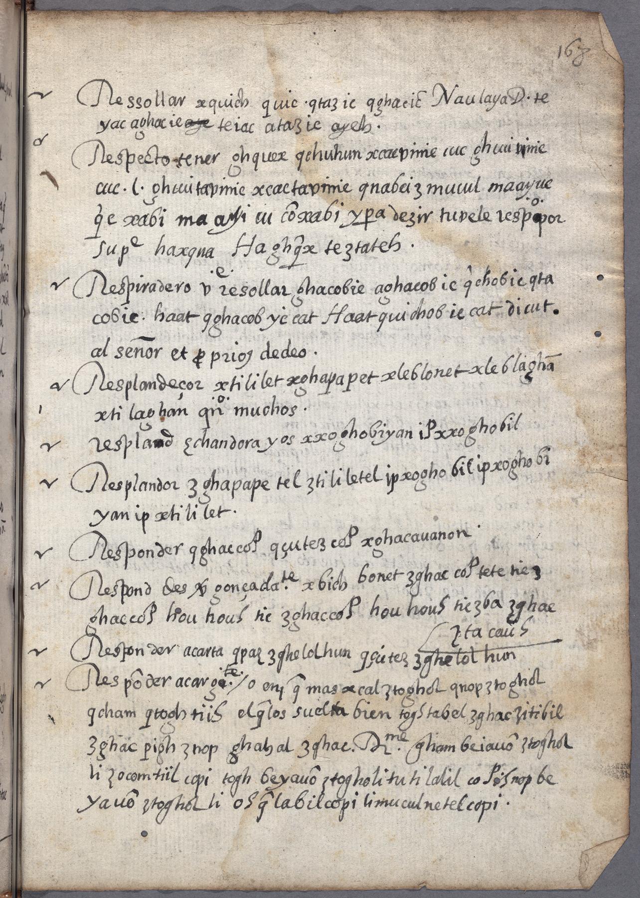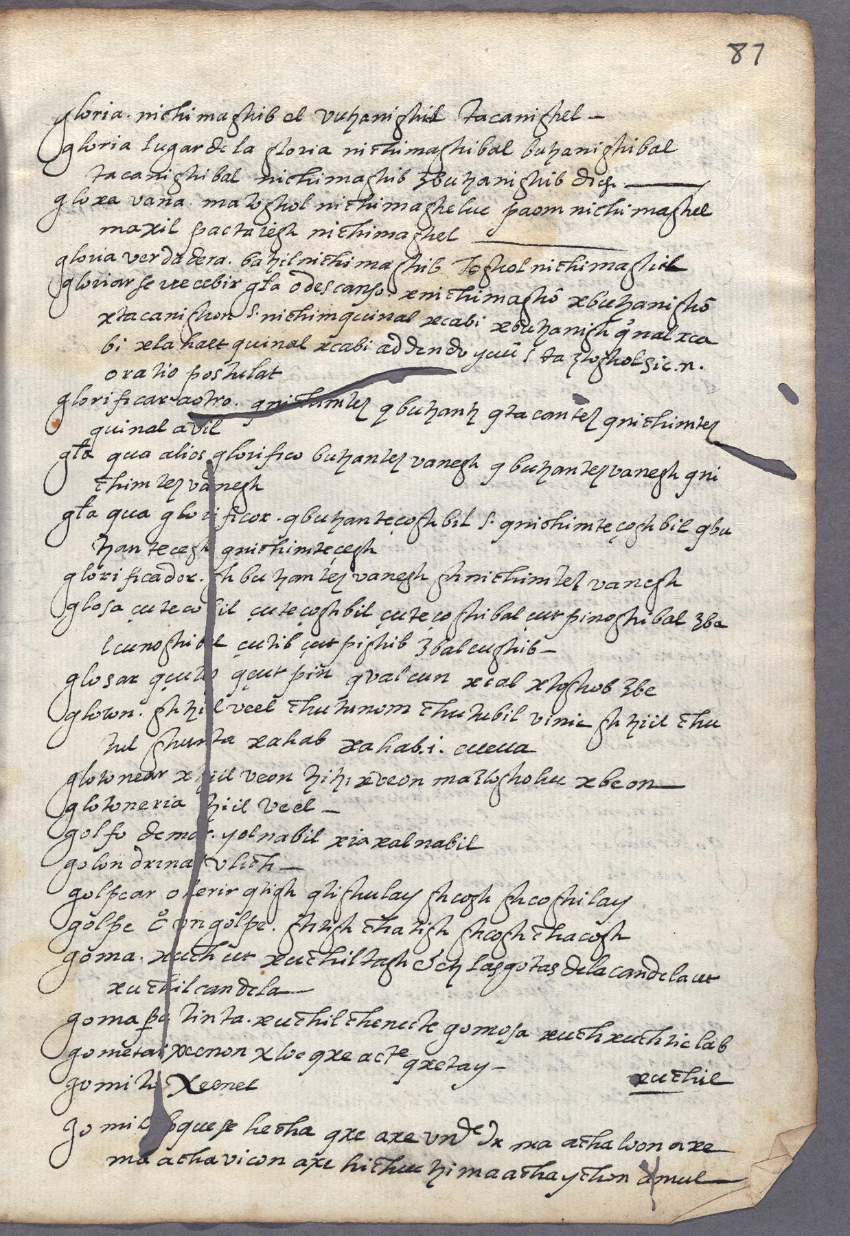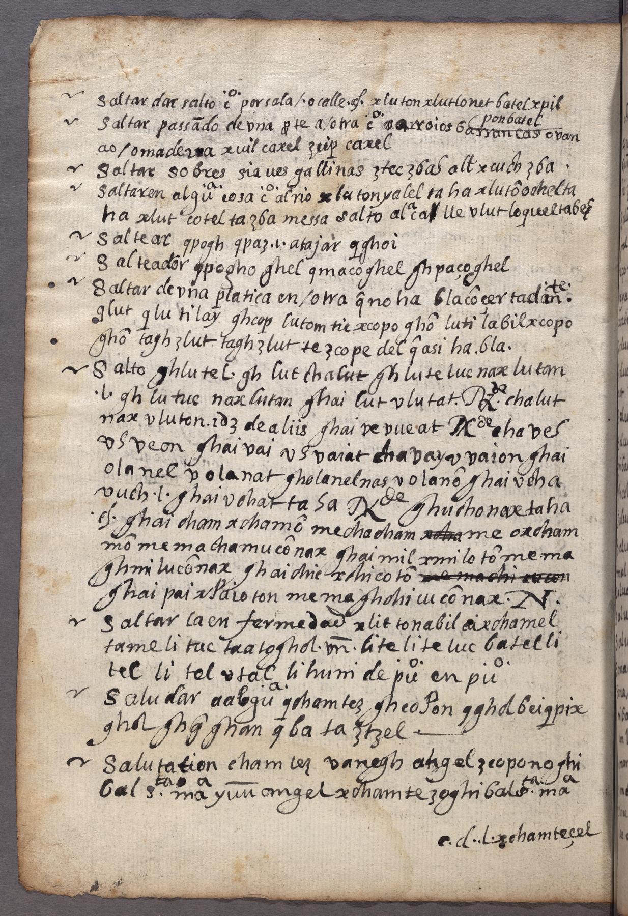 A copy, probably made in the 17th century, of an alphabetical list of Spanish names, words, and phrases, with translations in Tzeltal.