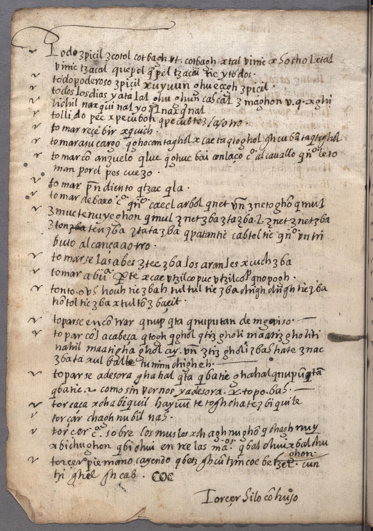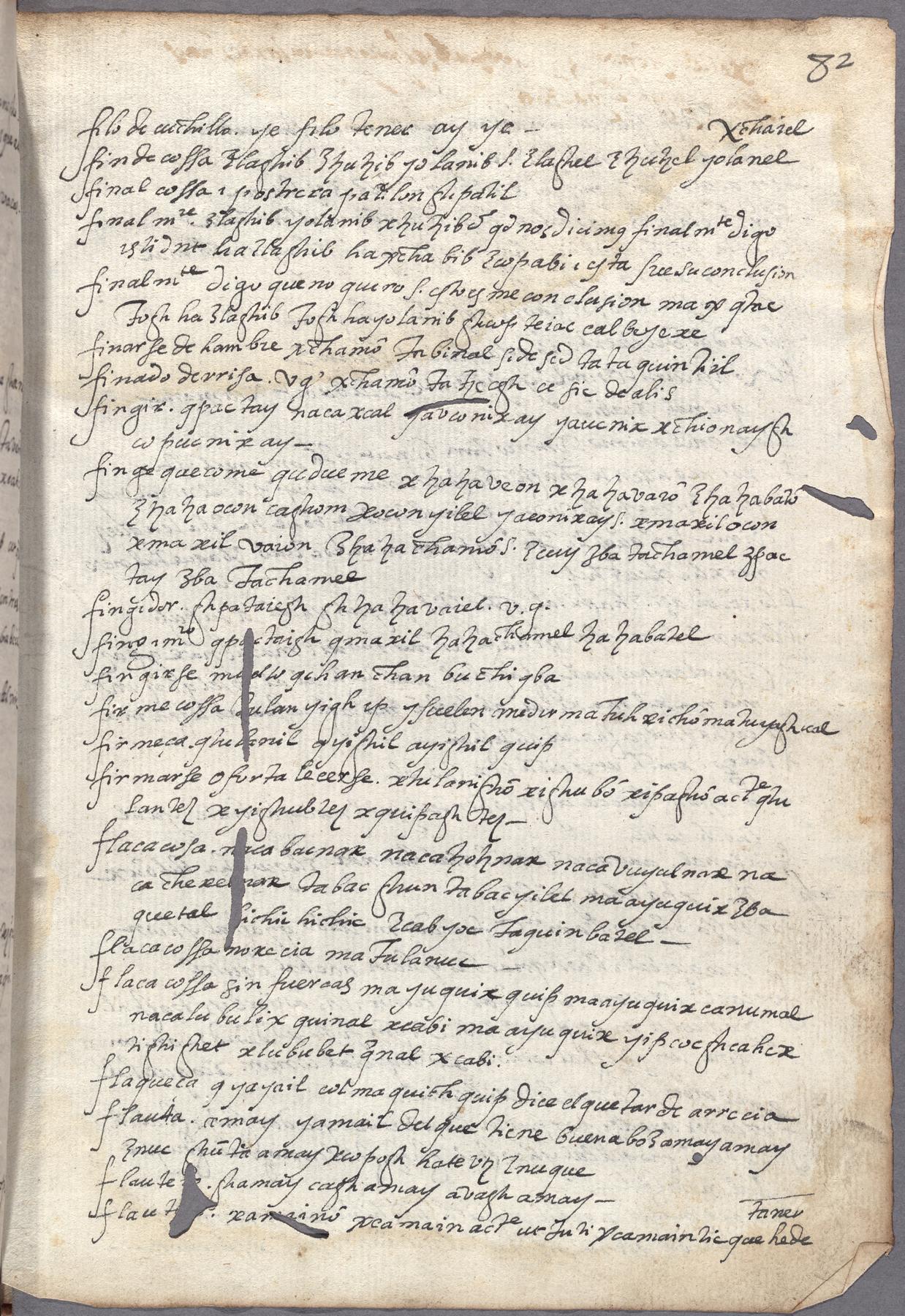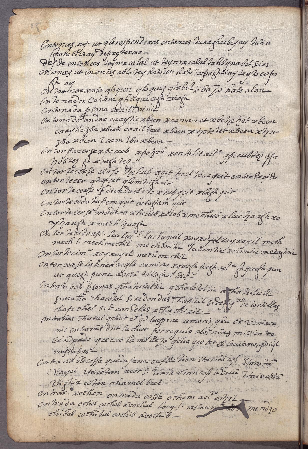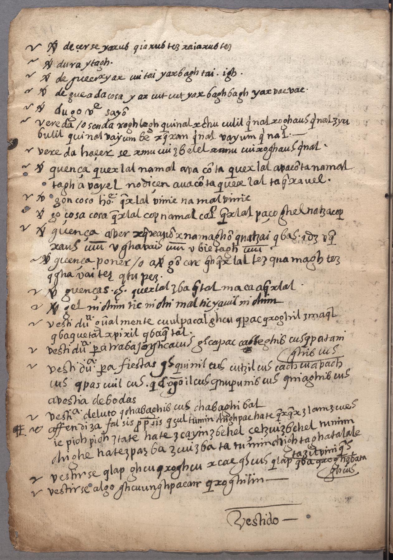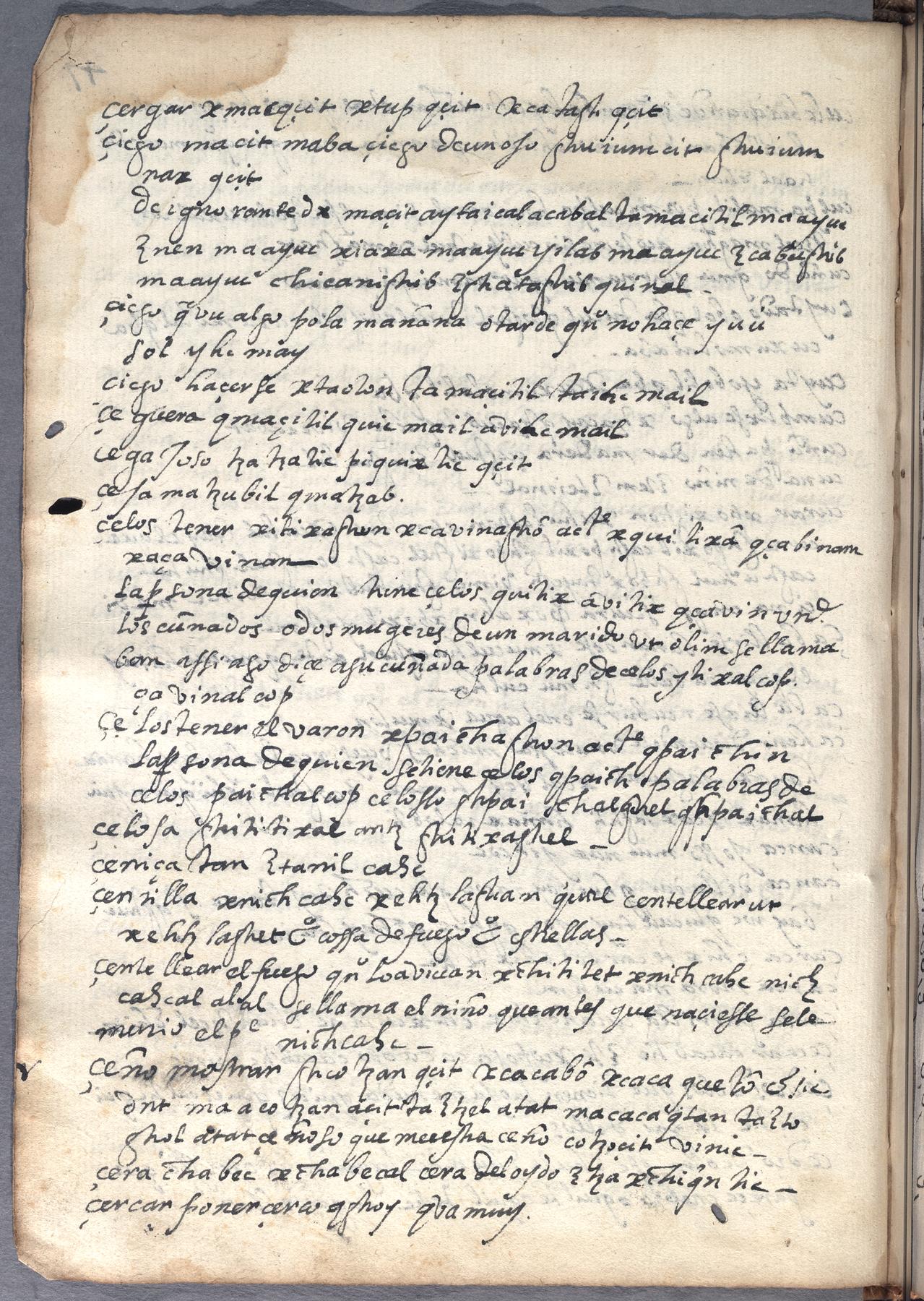 A copy, probably made in the 17th century, of an alphabetical list of Spanish names, words, and phrases, with translations in Tzeltal.