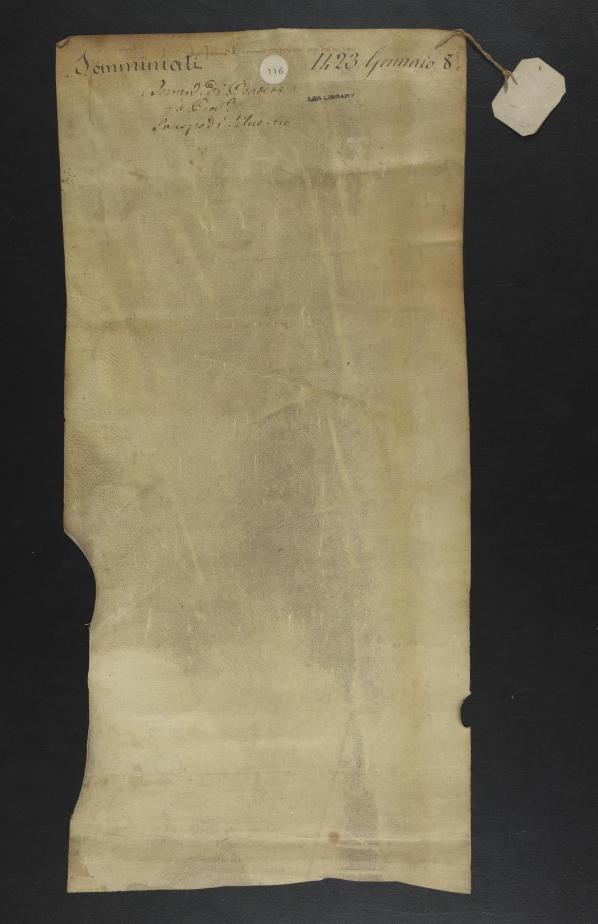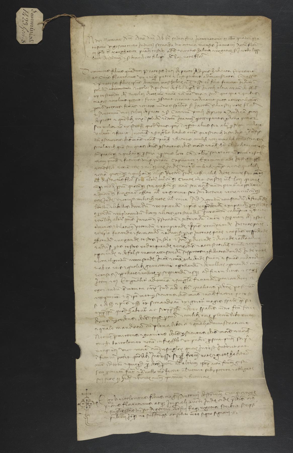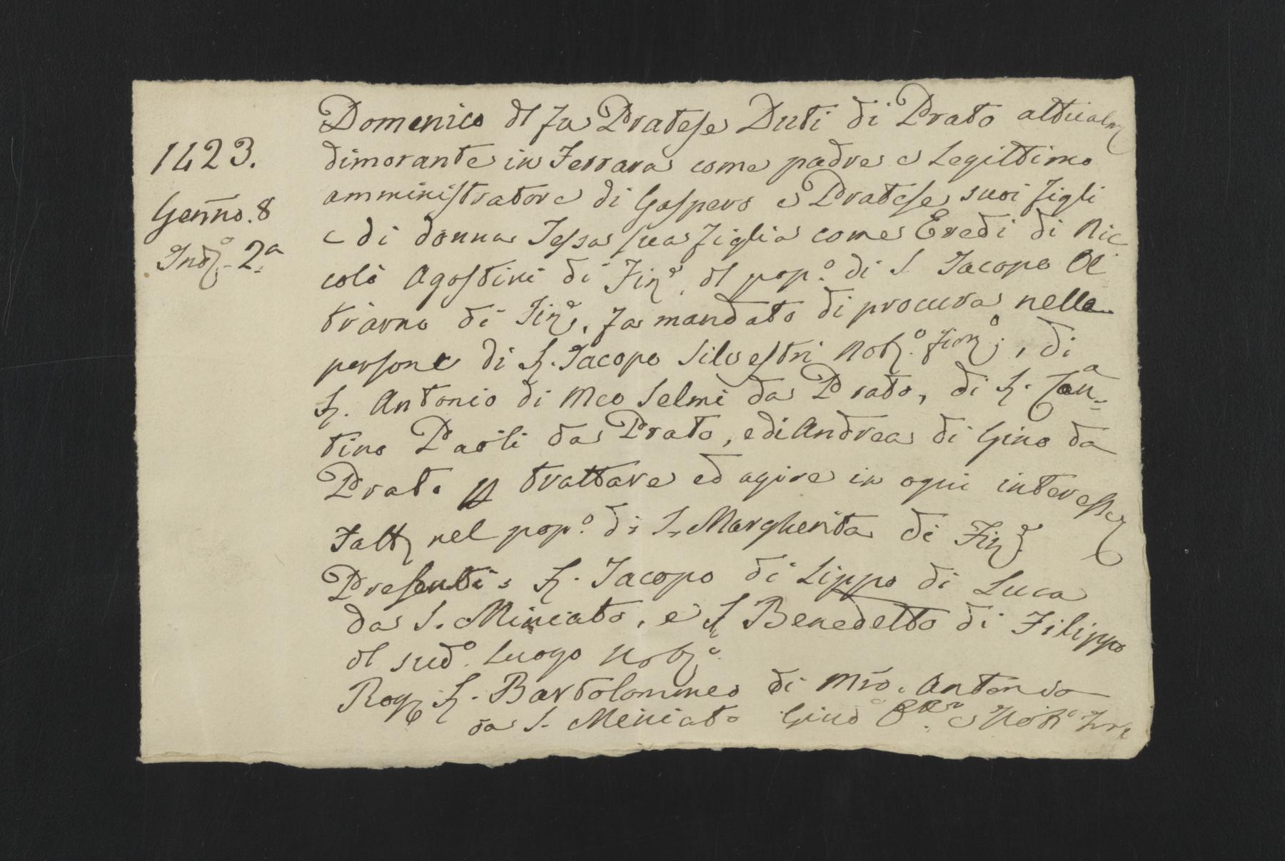Assignment of power of attorney by Domenico di Pratese Duti of Prato but living in Ferrara, father and guardian of Gaspare, Pratese, and Sessa and acting on their behalf, to Jacopo Silvestri, Antonio di Meo, Santino Paoli, and Andrea di Gino for the resolution of a complicated legal dispute concerning a large estate inherited by the three children. Notarized by Bartolomeo di Antonio di San Miniato on 8 January 1423, in the presence of the witnesses Jacopo di Lippo di Luca and Benedetto di Filippo. Filed with the document is a short, later summary written in Italian on paper.