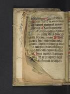 This small late-fifteenth-century Book of Hours, bound in two volumes at a much later date, displays the damage characteristic of parchment books that have been exposed to fire. This volume, which is the second volume, contains the Office of the Dead, followed by a section in a different hand (after fol. 24), likely from a different Book of Hours, which contains prayers to be said at Communion and Suffrages, with rubrics and some prayers in French, including lengthy explanations concerning the use of specific prayers.