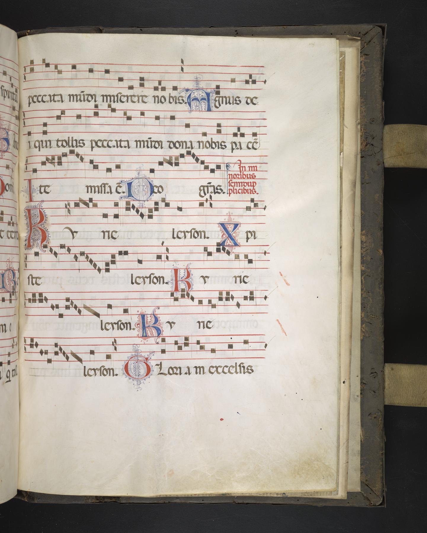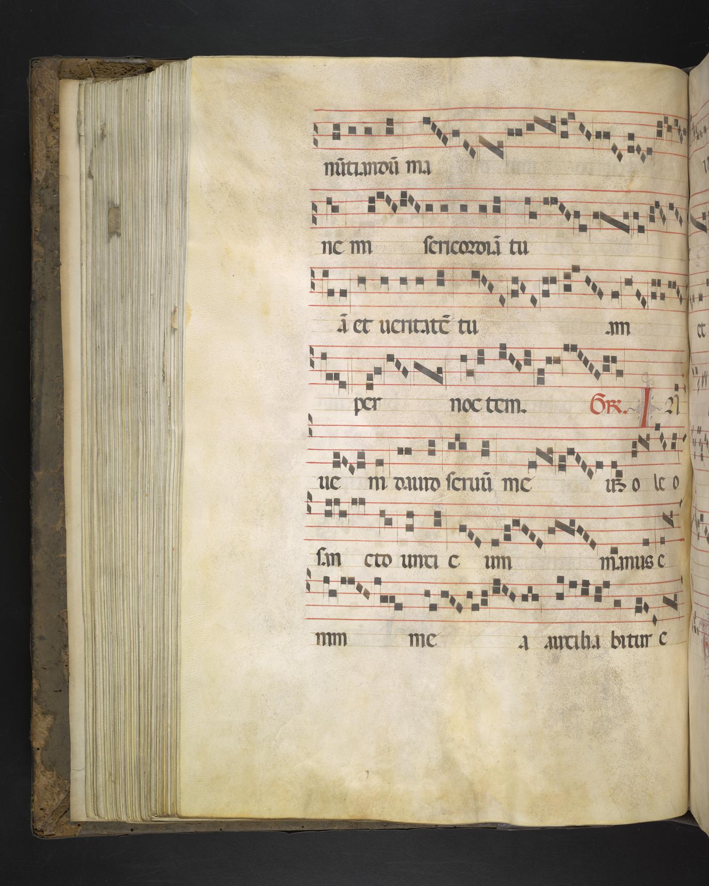 This large Antiphonal was produced around 1500 in Spain. It retains its original covers, complete with tooled leather, central and corner bosses, and corner pieces.