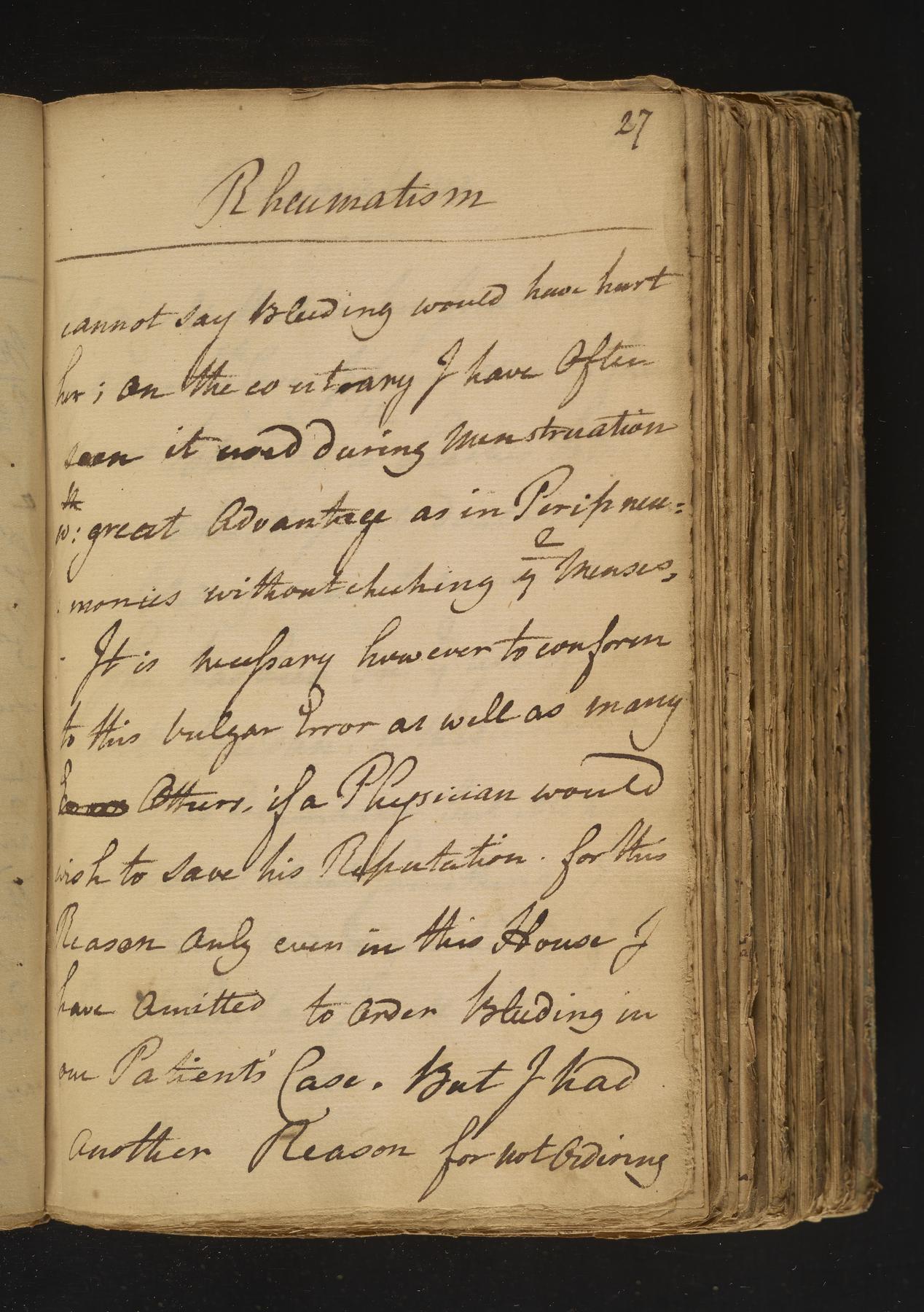 Rush MSS Vol. 100 (Yi2 7274.F.7) Notes by Benjamin Rush on Clinical lectures delivered in the Royal Infirmary of Edinburgh in 1768 by William Cullen, M.D.