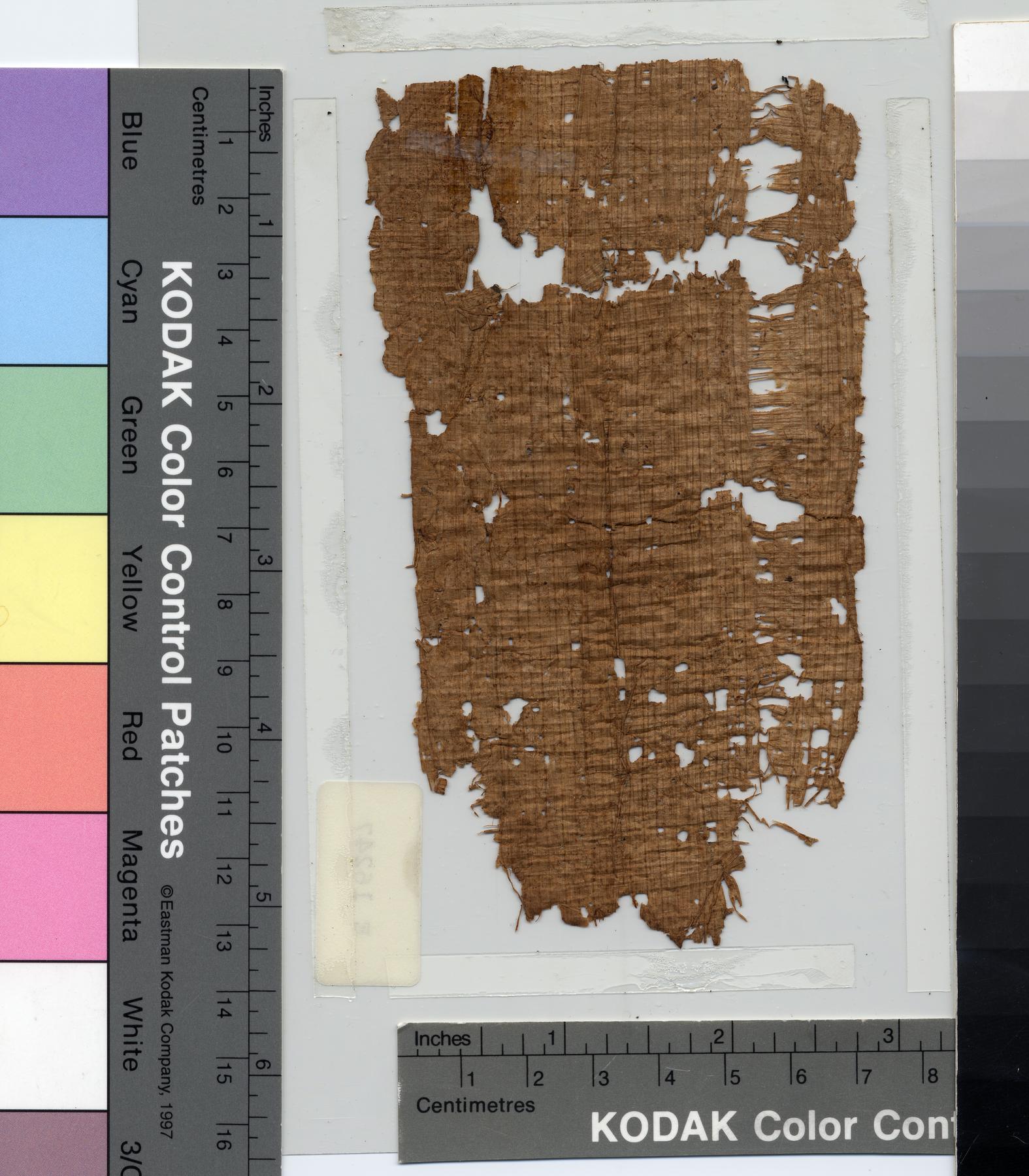 - Badly damaged fragment. Two large holes on the left of the fragment. The right edge is badly frayed and uneven.