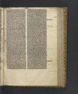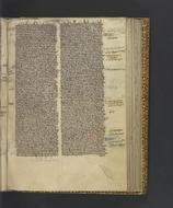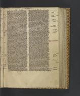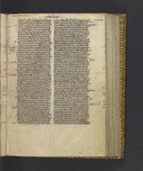 This manuscript is a thirteenth-century Vulgate Bible, written in England, lacking the Psalms and the prologue before Genesis. Many of the numerous brief marginal notes have been trimmed. The Bible is followed by the end of an incomplete Interpretation of Hebrew Names, starting in the letter S (fols. 249r-251r), and three pages of medieval notes (fols. 251v-252v). The published account of the first two articles (out of seven) agreed upon at a church synod that opened in London on 24 November 1584 is copied on a newer leaf at the end of the volume (fols. 253r-253v).