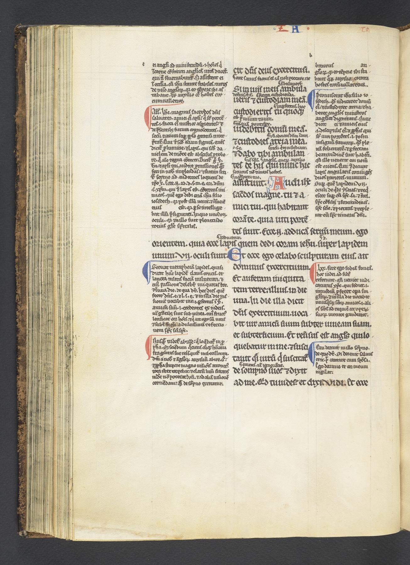This manuscript is a thirteenth-century copy of the books of the Minor Prophets, from Hosea to Malachi, with interlinear and marginal glosses. The end of Malachi is missing, with the text and gloss breaking off at Malachi 4:5. A historiated initial with a prophet portrait marks the beginning of each book. The text is arranged in three columns, with the Bible text written in larger script on every other line, mostly in the center column but sometimes extending into the left or right column. The marginal gloss is written in smaller script in the left and right columns. The text begins above the upper bounding line on each page. The manuscript was written and illuminated in Paris between approximately 1220 and 1230. The third front flyleaf is a fragment from a missal written in northern France in the second half of the thirteenth century, with readings for the fourth Sunday after Easter followed by the Epistle and Gospel readings for Wednesday after the Fourth Sunday, which also appear in the Bec Missal (also thirteenth century) but not later missals. The missal fragment is frame-ruled in ink (written area: 248 x 165 mm) and the text is written in two columns of twenty-eight lines, with the margins deeply trimmed, especially the inner margin.