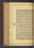 Rebound in red leather by St. Austin and Sons of Hertford with illustrated lacquered wooden boards. Spine is stamped KURʼĀN. Outside covers contain mandorla in black with two pendants along the vertical axis and cornerpieces; floriated designs in orange, red, yellow, black, and gold. Inside covers depict bouquet in green, red, yellow, and orange on black background with cornerpieces painted in red.Layout
