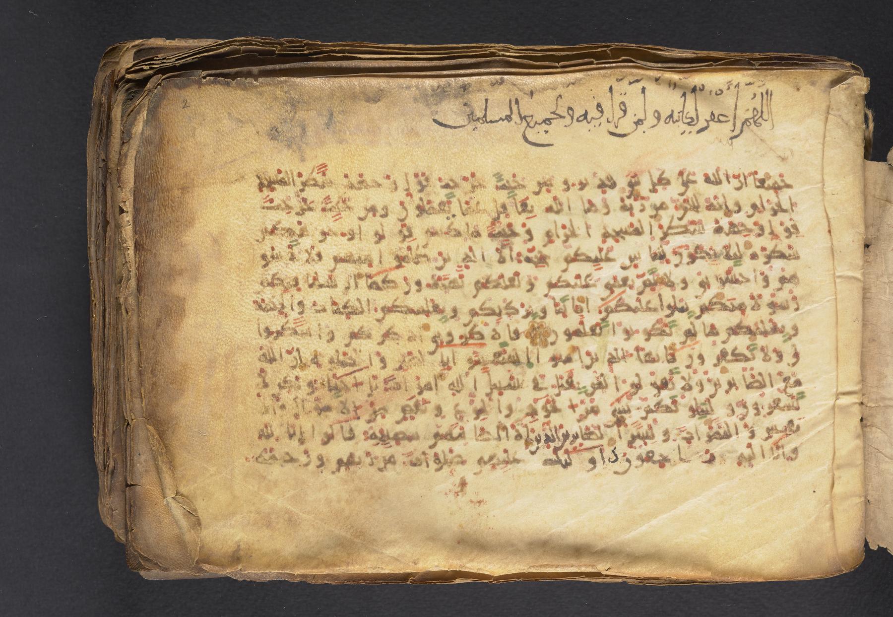 Incomplete copy of the Qurʼān containing verses 2:201-6:24. The parchment is curling, often brittle, and shows clear striations from preparation on a number of membranes (see f. 8 for example).