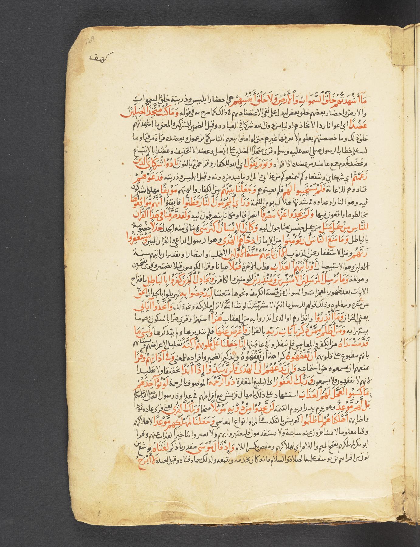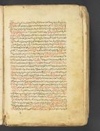 Autograph copy of the first volume of an abridgment of al-Bayḍāwī's Anwār al-tanzīl wa asrār al-taʼwīl, a commentary on the Qurʼān. The writer states that he wished he could have taken that book along with him on his trip to Mecca and so wrote a shorter version more conducive to travel (f. 1v). This copy contains through verse 110 of al-Kahf (18:110). The last leaf is adhered to the back board.