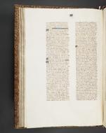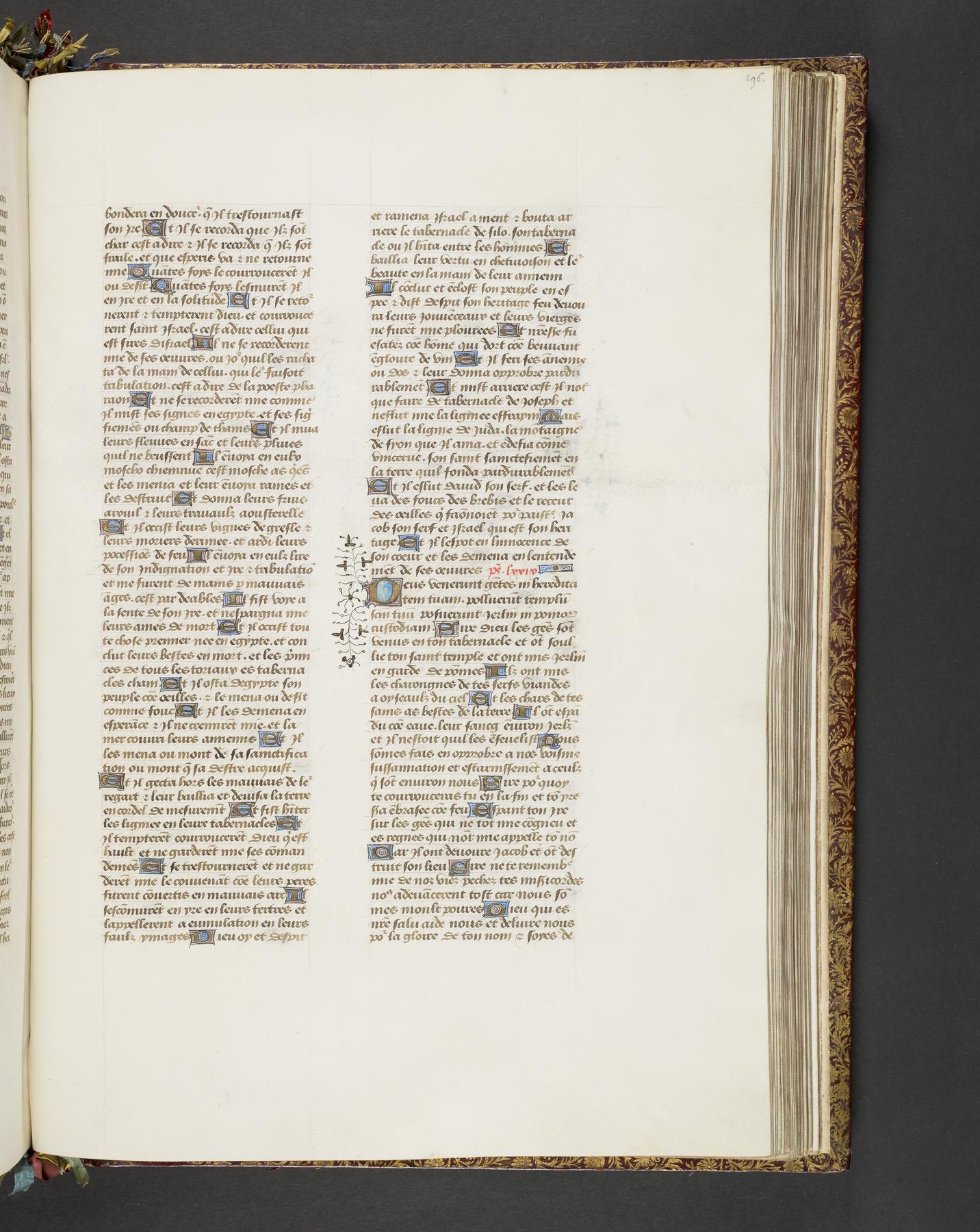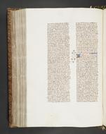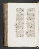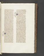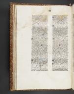 This large manuscript is a fifteenth-century copy on parchment of the first volume of the Bible historiale complétée (Genesis-Esther), which was taken from the Bible historiale of Guyart des Moulins, together with Job, Psalms, the Gospels from the second volume of the Bible historiale complétée and an otherwise unknown French translation of Revelation. The text of the French translation of the Vulgate Bible originated in the thirteenth century, and there are few extant manuscripts; this manuscript was produced in Rouen in the third quarter of the fifteenth century. It has text in two columns of bâtarde script, two large miniatures with full page borders at the Old and New Testament divisions, and thirty-three column miniatures with column borders at book divisions and divisions within the book of Psalms. The miniatures are the work of two different artists from the Workshop of the Master of the Échevinage de Rouen. In the early eighteenth-century, the manuscript was rebound by French bookbinder Jacques-Antoine Derome.