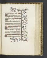 This manuscript is a Book of Hours made for the use of Paris in the early fifteenth century. While it is mostly written in Latin, its Calendar (fols. 1r-12v), triple graded in gold, red, and ultramarine, is written in French, as are the accessory prayers (fols. 240r-248v). The book opens with a calendar, in French (fols. 1r-12v), followed by the Gospel Lessons (fols. 13r-18v) and the Hours of the Virgin for the Use of Paris (fols. 19r-93v, lacking its first page with a miniature), Penitential Psalms, Litany, and Prayers (fols. 94r-115v), Hours of the Cross (fols. 116r-125v), Hours of the Holy Spirit (fols. 126r-132v, lacking its first page with a miniature), and Office of the Dead (fols. 133r-183v). Further sections consist of the O intemerata (fols. 184r-187v) and Obsecro te (fols. 188r-191v) prayers, Suffrages (fols. 192r-225r), and Masses of the Holy Spirit, Virgin, Trinity, and Dead (fols. 225v-239v), all of which are unillustrated. A discrete final section contains three prayers in French: the Fifteen Joys of the Virgin (fols. 240r-244r), the Seven Requests to Our Lord (fols. 244v-246v), and a prayer to the True Cross (fols. 247r-248v). The twelve large miniatures that accompany the beginning of most major sections are related to the work of the Boucicaut Master. They represent the Visitation (fol. 45r), Nativity (fol. 57v), Annunciation to the Shepherds (fol. 64v), Adoration of the Magi (fol. 70r), Presentation in the Temple (fol. 75r), Flight into Egypt (fol. 80r), Coronation of the Virgin (fol. 88r), Maiestas Domini/Christ Blessing Chalice and Host (fol. 94r), Crucifixion (fol. 116r), Funeral Service (fol. 133r), Virgin and Child (fol. 240r), and Christ in Judgment (f. 245v). They are accompanied by lavishly illuminated foliate borders as well as illuminated initials and some marginal figures and drolleries, such as in the case of folio 94r, where two Jews are depicted holding banderoles with text written in Latin.