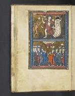 This manuscript is a thirteenth century Psalter-Hours made in northern France, likely Amiens. It features twelve full-page miniatures constituting a prefatory cycle of the life of Christ, in addition to seventeen historiated initials. The prefatory cycle (fols. 1v-12r) comprises two miniatures per page. At least one bifolium containing illustrations of the culmination of Christ's Passion is missing. The calendar (fols. 13r-18v) is decorated with two roundels per page showing the Sign of the Zodiac and Labor of the Month respectively. The Psalter and canticles (fols. 19v-195r) are illustrated with historiated initials. The litany (fols. 195v-199v) is illustrated with a historiated initial showing a Procession of relics (fol. 195v). The Office of the Dead (fols. 200r-206r) begins with an initial showing a funeral bier in a church (fol. 200r). The Hours of the Virgin (fols. 208r-234v) contains eight historiated initials showing the canonical iconographies for this cycle. The Penitential Psalms (fols. 235r-242r) are introduced with an historiated initial showing David at an altar, with God raising his hand in blessing (fol. 235r). The illuminations have been attributed to two artists; the illuminator of the prefatory cycle and psalter illuminated another psalter formerly in the collection of the Comte de Boisrouvray as well as a manuscript of Chretien de Troyes's work held at Princeton University, Garrett 125, and MS W. 86 held at the Walters Art Museum. Two other manuscripts are attributed to the Psalter-Hours's second artist: Le Mans, BM, MS 354, and Paris, BnF, MS Fr. 342.