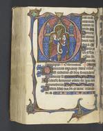Decoration: Large historiated initial B, David Playing the Harp, above, and David Defeating Goliath, below