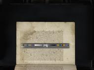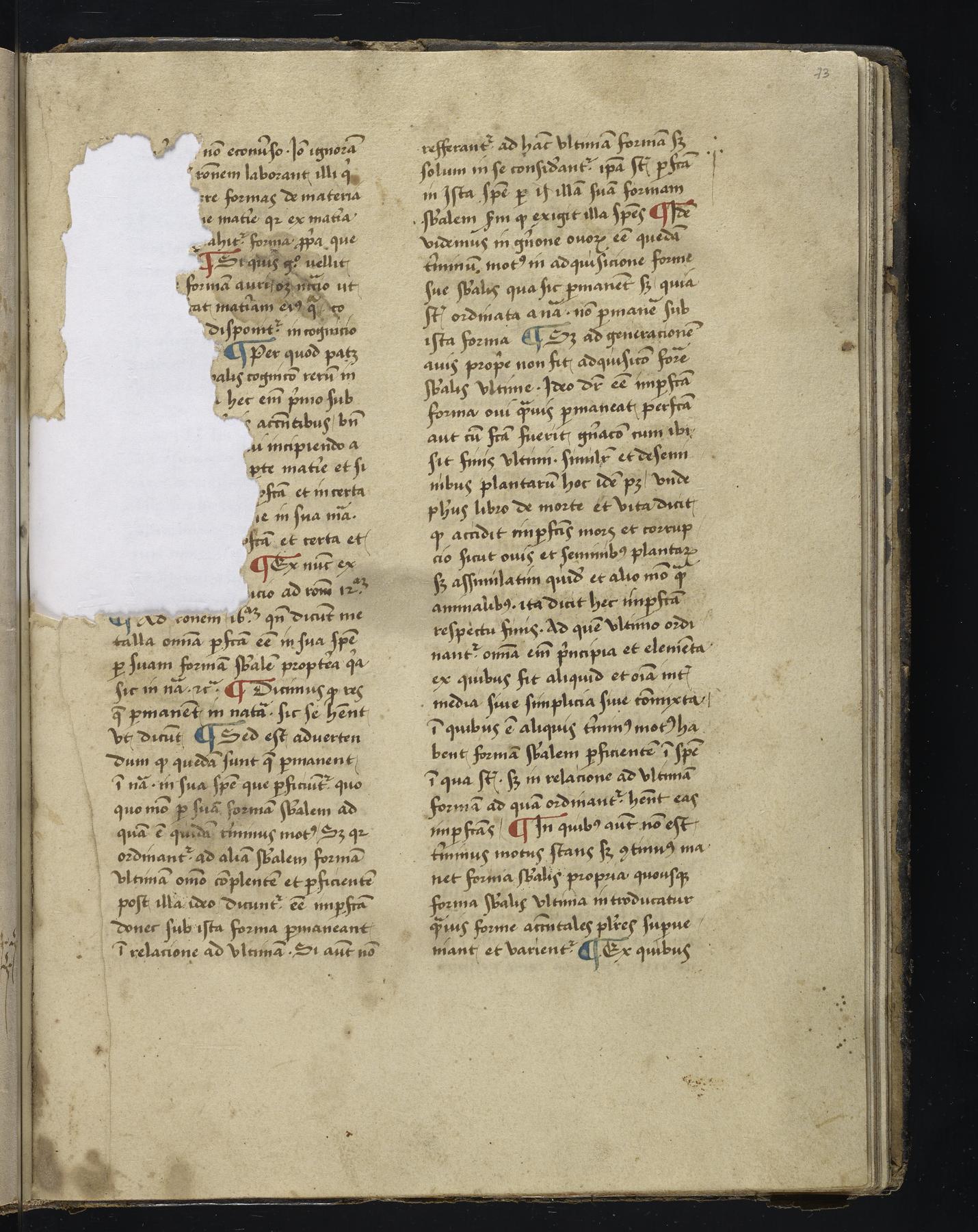 - Fol. 73, large hole in the top inner portion of the leaf (loss of text), fol. 24, small hole top margin, fol. 1, initial damaged, water stains upper margins and top lines of text; Quire 8 leaves 9 through 12 are cancelled with no loss of text