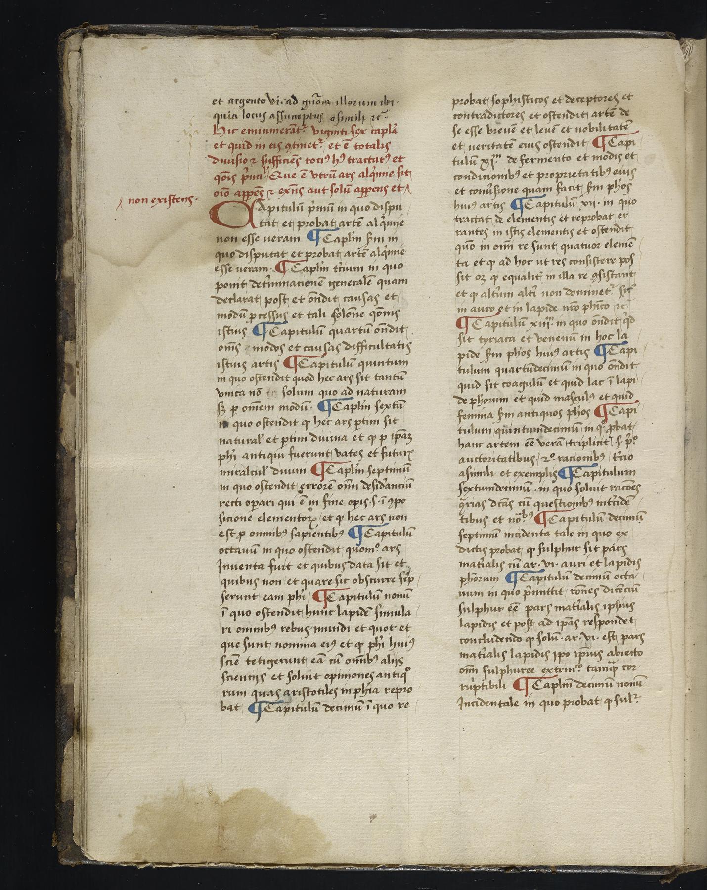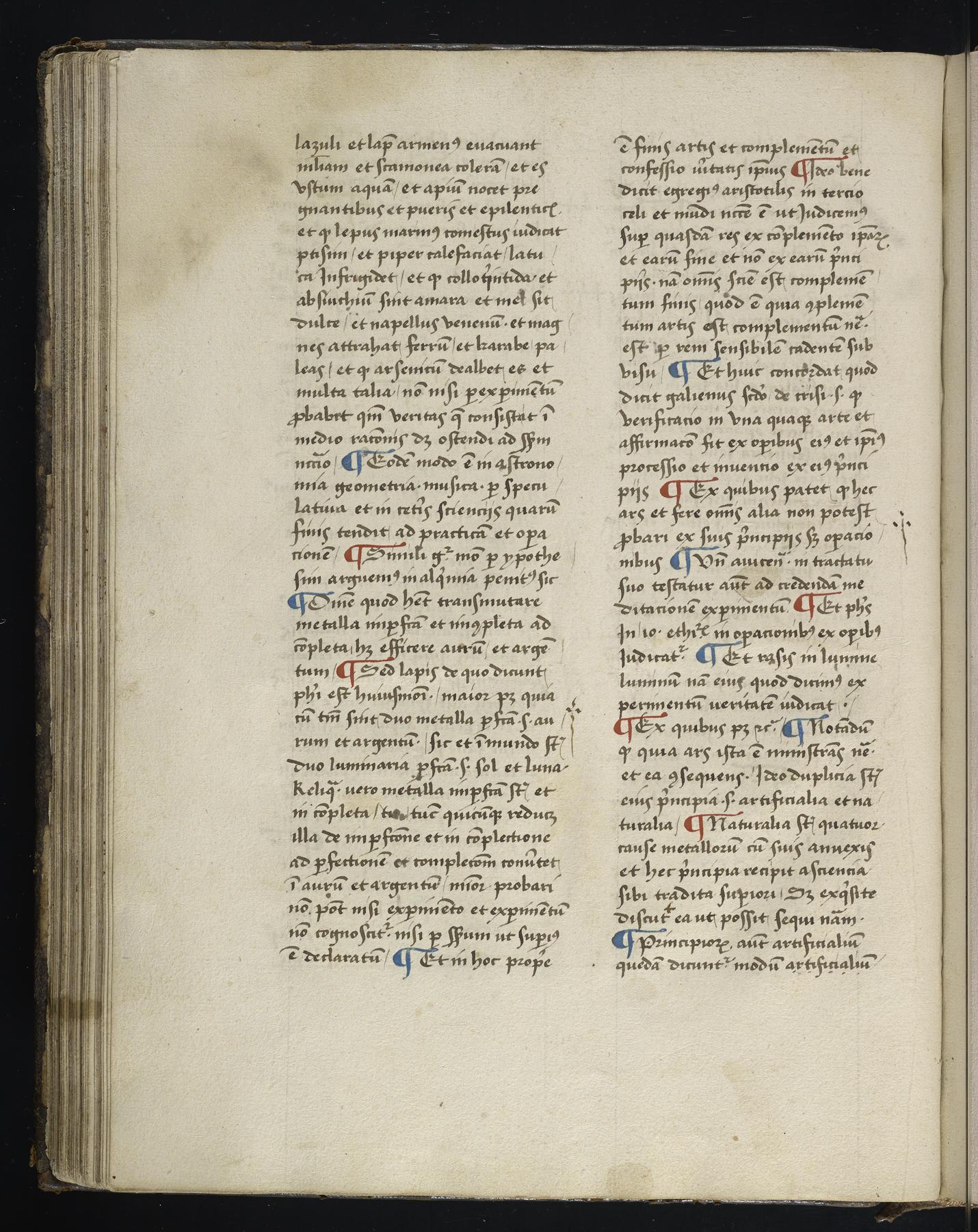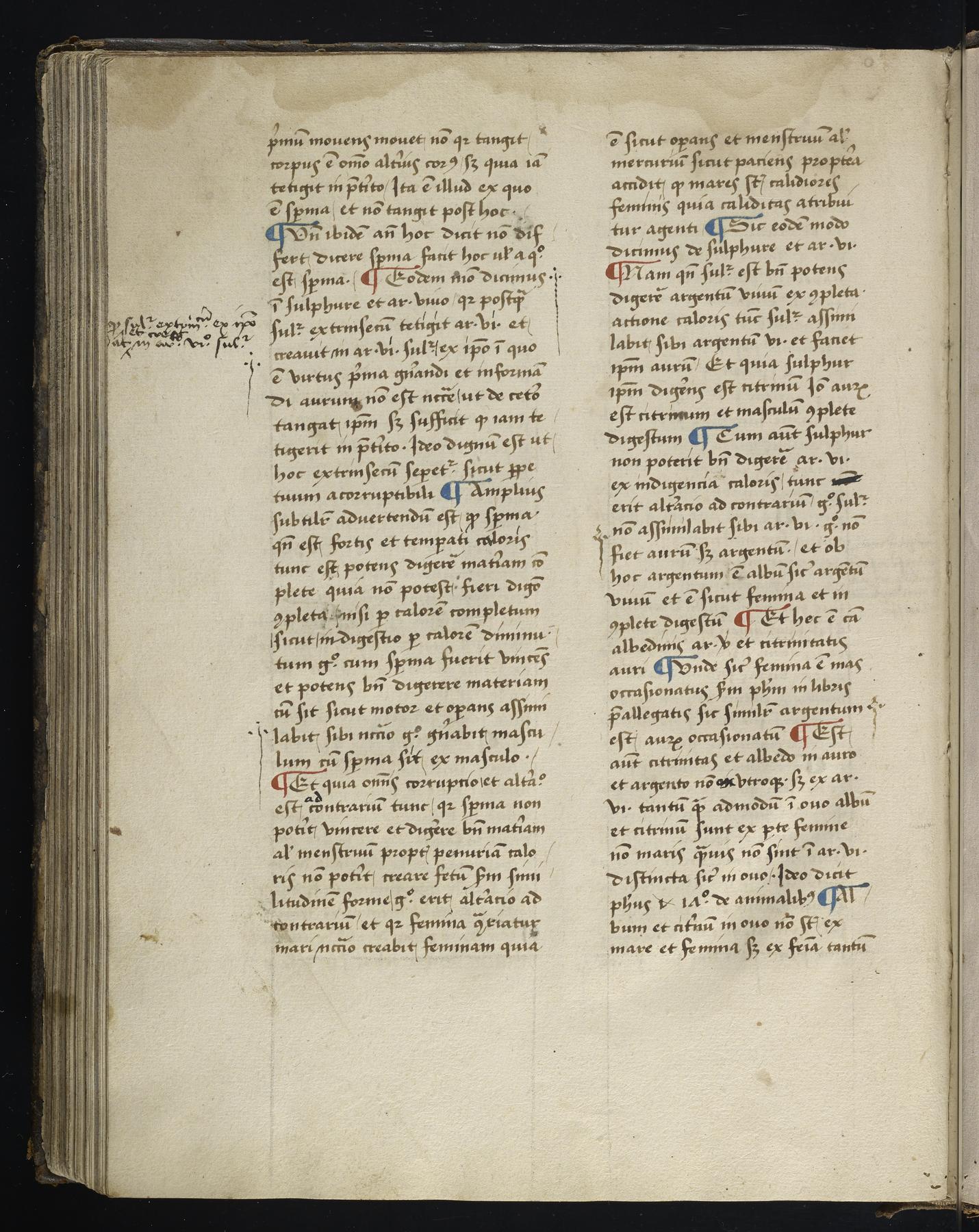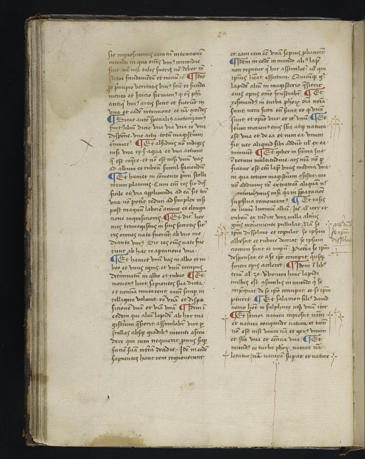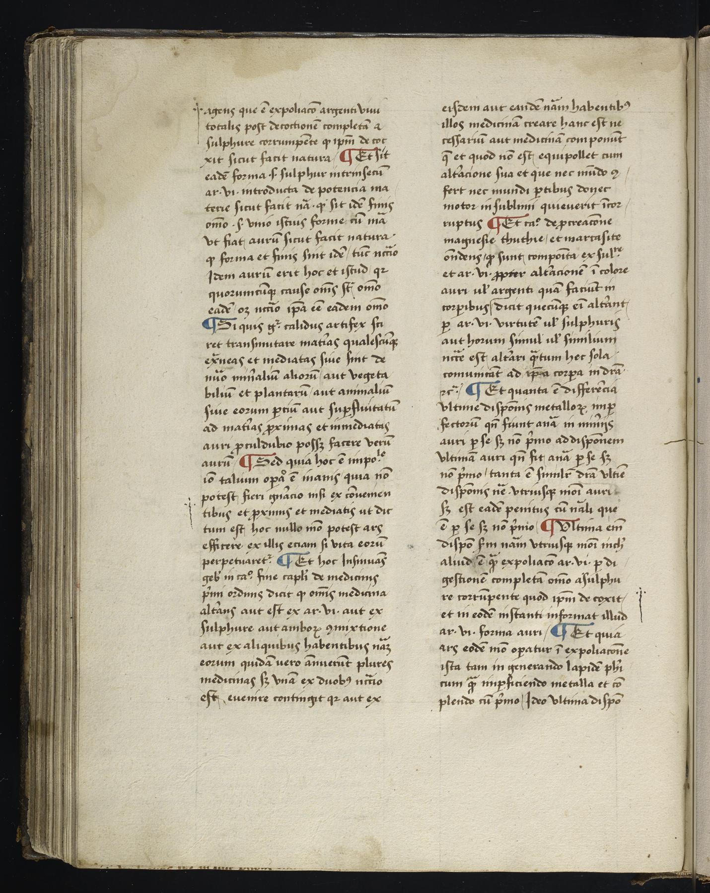 This manuscript contains a copy of a fourteenth-century alchemical treatise discussing the arguments for and against alchemy.