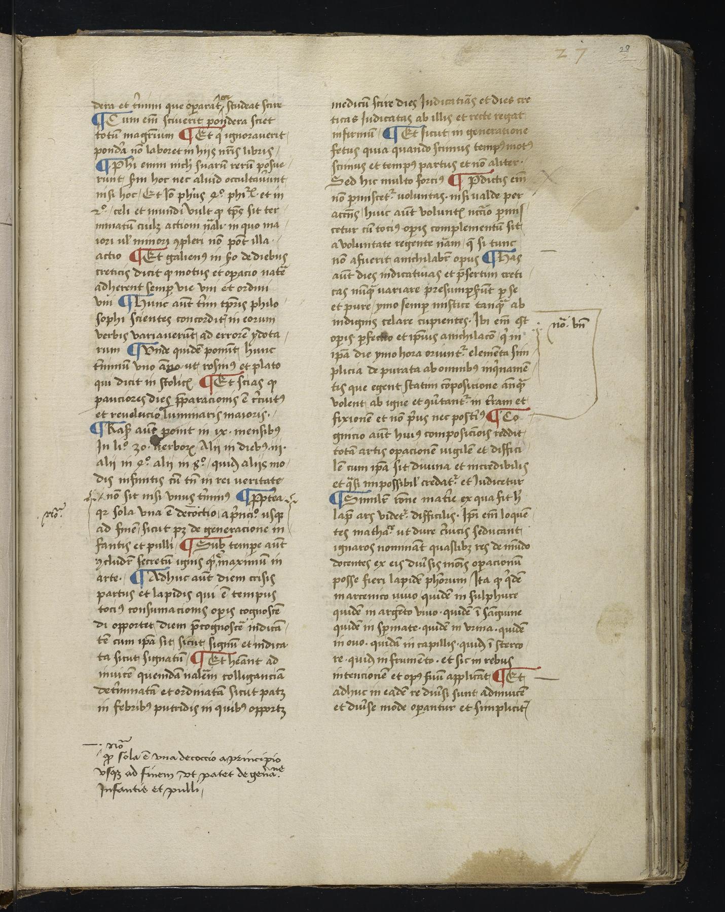 Red rubrics, alternately red and blue paragraph marks and red or blue two-line initials, large three-line initial (fol. 1r) darkened silver on a notched ground that follows the shape of the initial (color damaged, yellow?) with a short spray of leaves and small flowers with black ink sprays extending from the initial into the inner margin; added notes in at least two hands with manicules and nota (e.g., fol. 68)