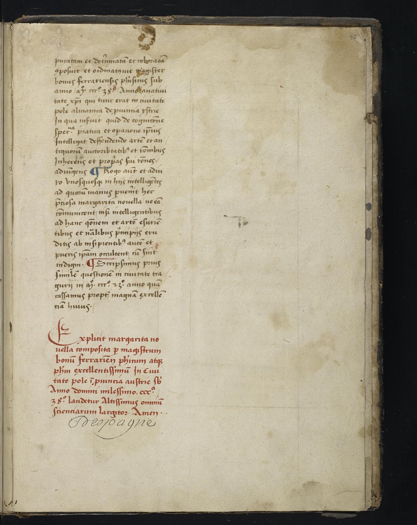 - Owned in 1532 by Johan Laborya de Mossach (or Mossacs[?] or Mossacis[?]) who states that he lodged with Anthony Laurens "de la dita vila de P<?>essis (inscription in Catalan, verso last leaf); Signatures, "Despagne," top margin fol. 1r, and at the end of the text, fol. 92r, in black ink, the suggestion that this may be identified with Jean d'Espagnet (1564-c. 1637), French lawyer and politician, and author of works on alchemy including the Arcanum Hermeticae philosophiae (1623), needs further research; The manuscript was in France in the seventeenth century; inside front cover, note in ink, dated 1668: "Le 7 Septembre 1668 antoine velloun a eté la queste avec le <r?> anselme et on luy donné 4 livres pour trente jours ouvriers sans compter le festes. Le couvent se lui doit rien jusques du jour present 27 Septembre." Lengthy handwritten description in German laid-in, early twentieth-century (?) (signed with the initials, A<R?>"; Belonged to Joost R. Ritman (b. 1941), the Dutch businessman and collector of art and books, who acquired it around 1982; Bibliothecha Philosophia Hermetica MS 18 ("Philosophia Hermetica"; bookplate inside front cover); briefly described in Medieval Manuscripts in Dutch Collections (Online Resources), in Gumbert, 1987, no. 21, as BPH MS 18, and in Gentile, 1999, no. 34, pp. 216-219