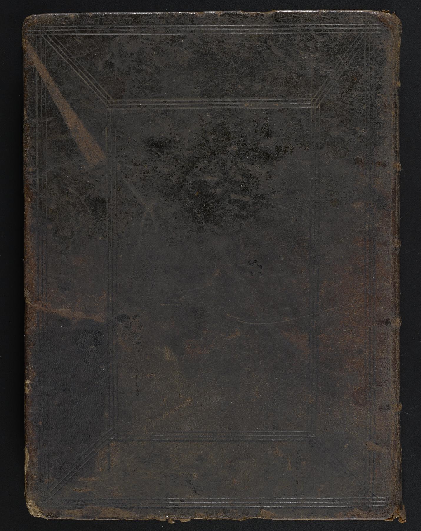 Bound in Spain in sixteenth-century dark leather (sheepskin?) over pasteboard, tooled in blind with two sets of triple rules forming a broad border, rounded spine with five raised bands and simple rules in blindLayout