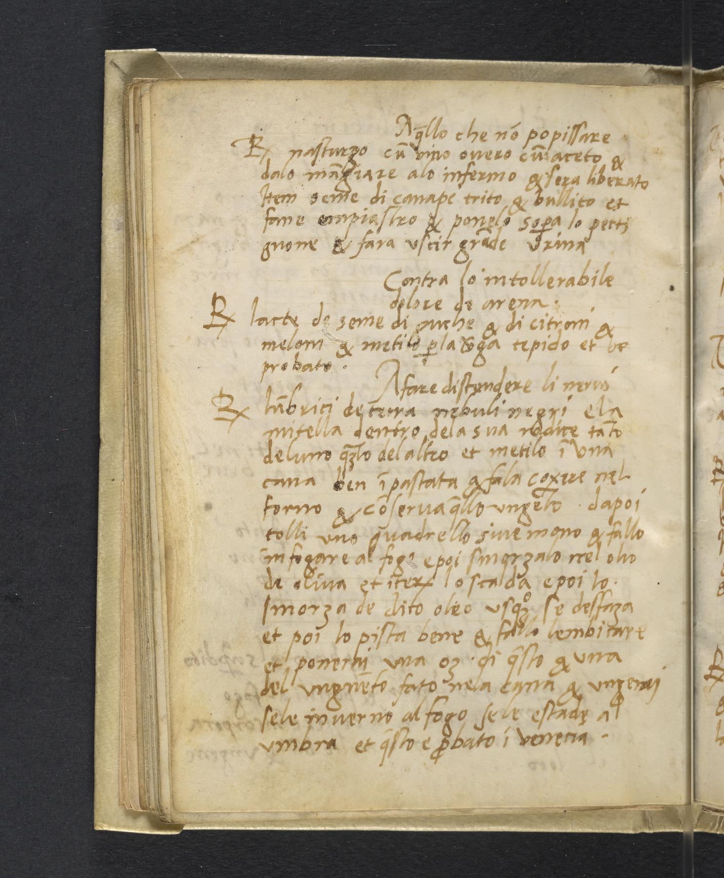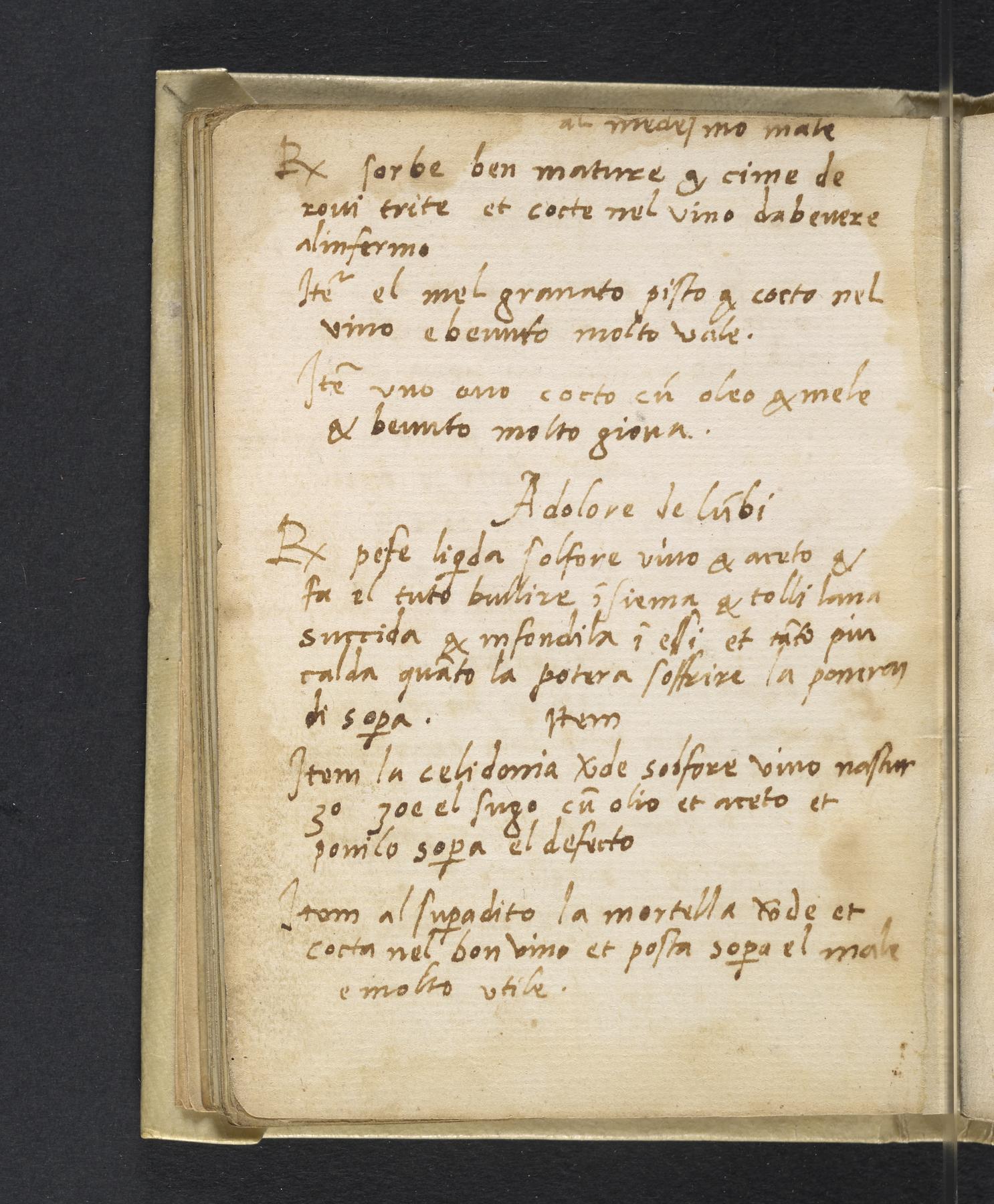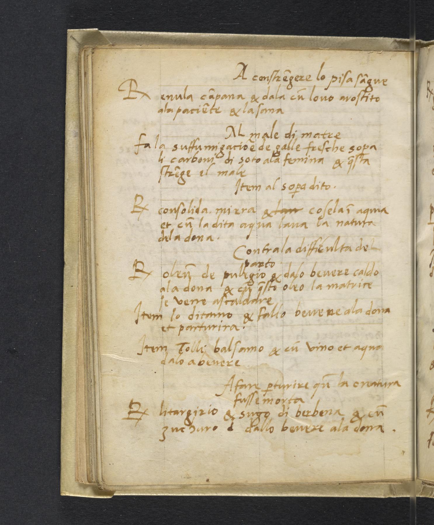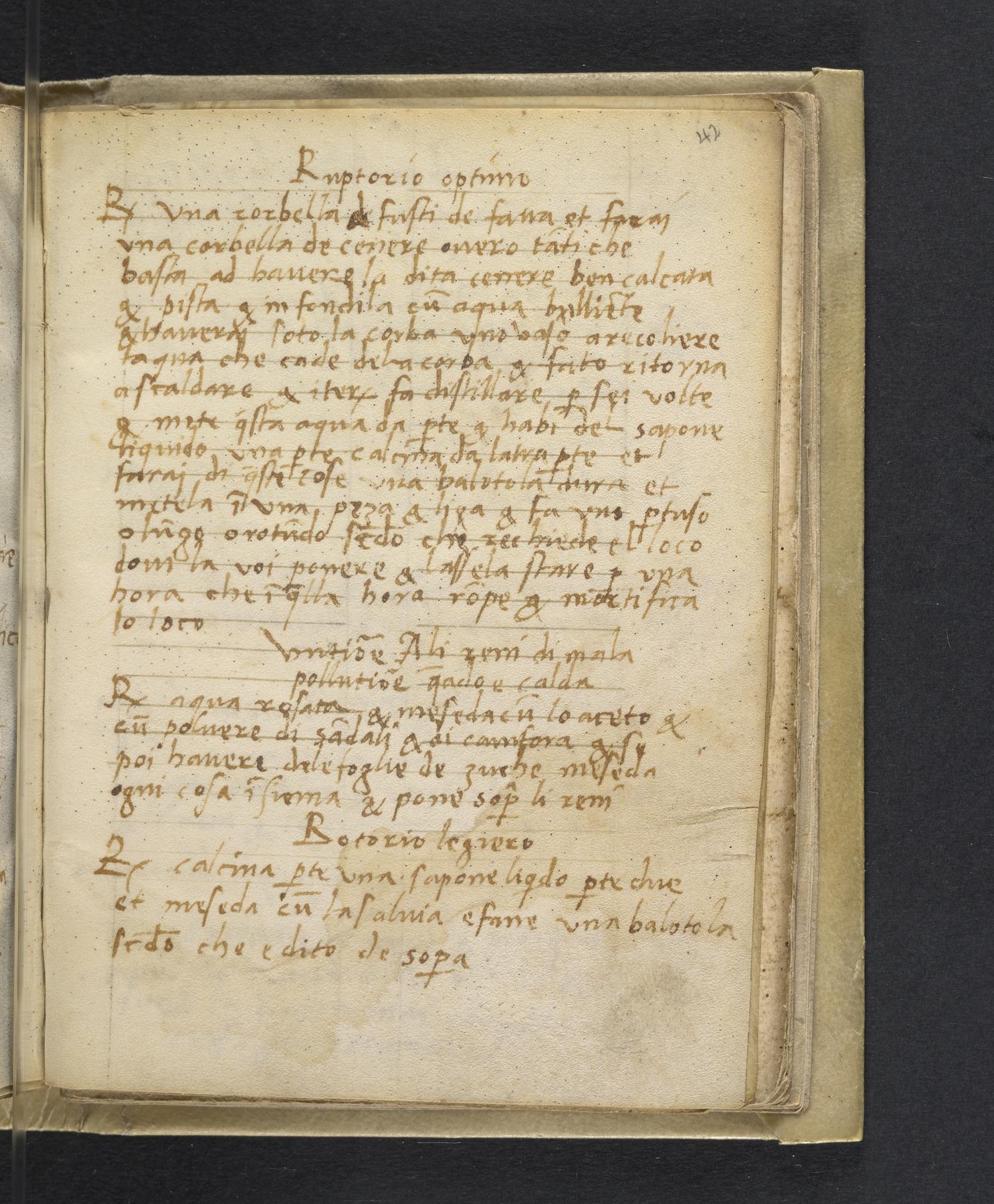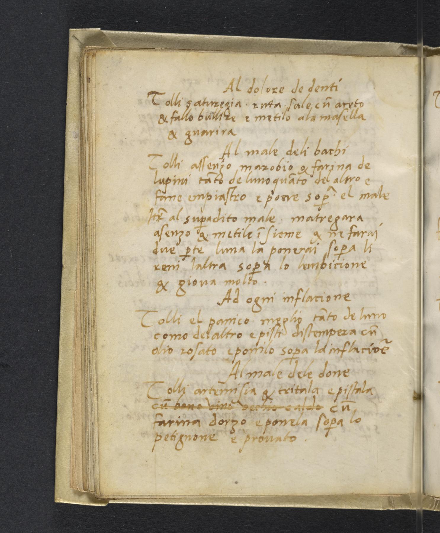 This manuscript is a compilation of remedies for various ills chiefly using wine, recipes for pills, for purifying metals, recipes and instructions for making colors for painting, enameling. The first half of the manuscript (fols. 1-32) is 15th century on parchment. Additional remedies in a 16th century hand, for inflamed testicles, menstrual distress, toothache, headache, leprosy, and recipes for birth control and various hair dyes. Folios 1-46 are parchment (1st gathering water-damaged); folios 47-61 are paper. Some marginalia, including multiple signatures of Dom[ina] Maria Barbani di Corticelle, one dated Oct. 1506.