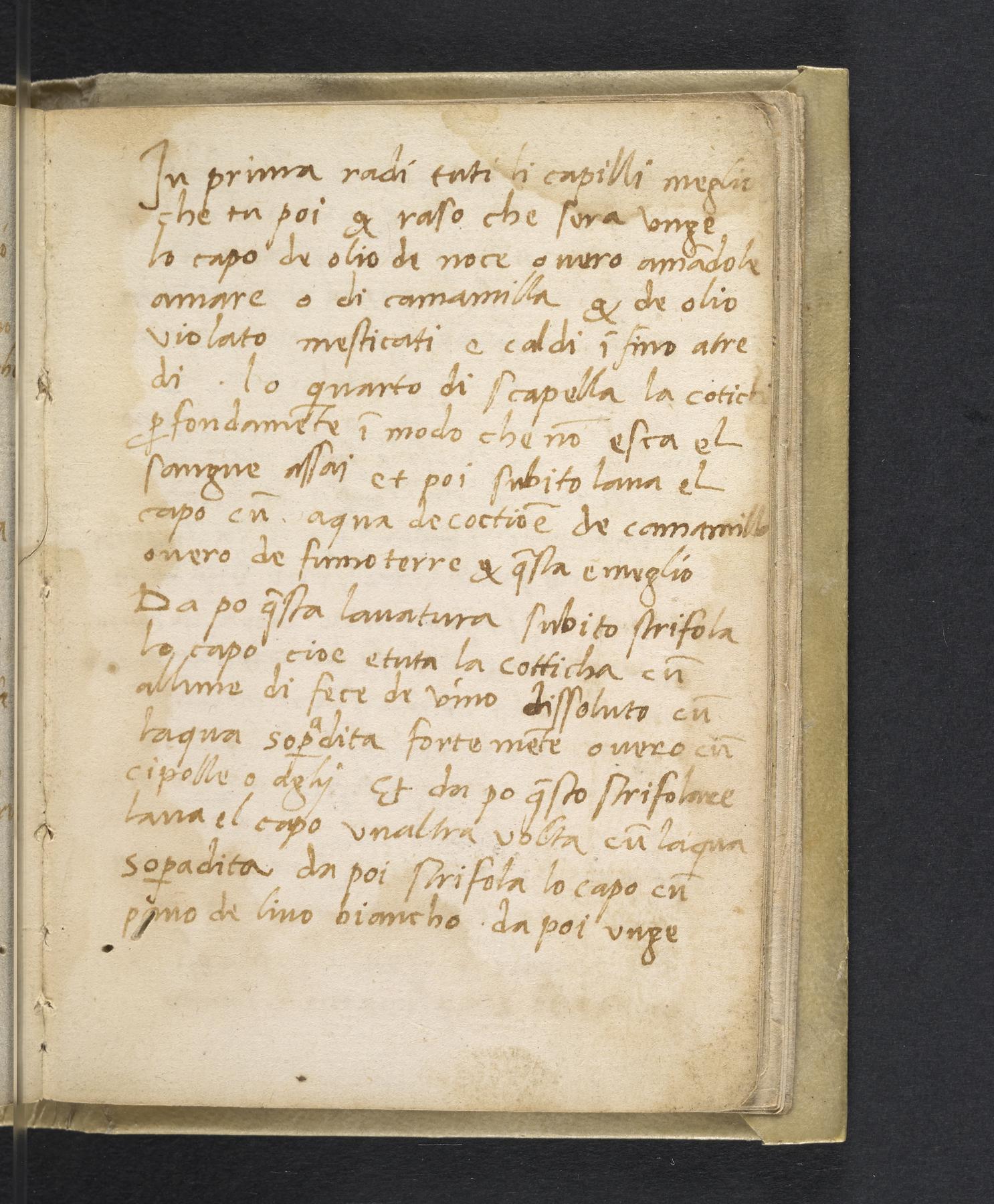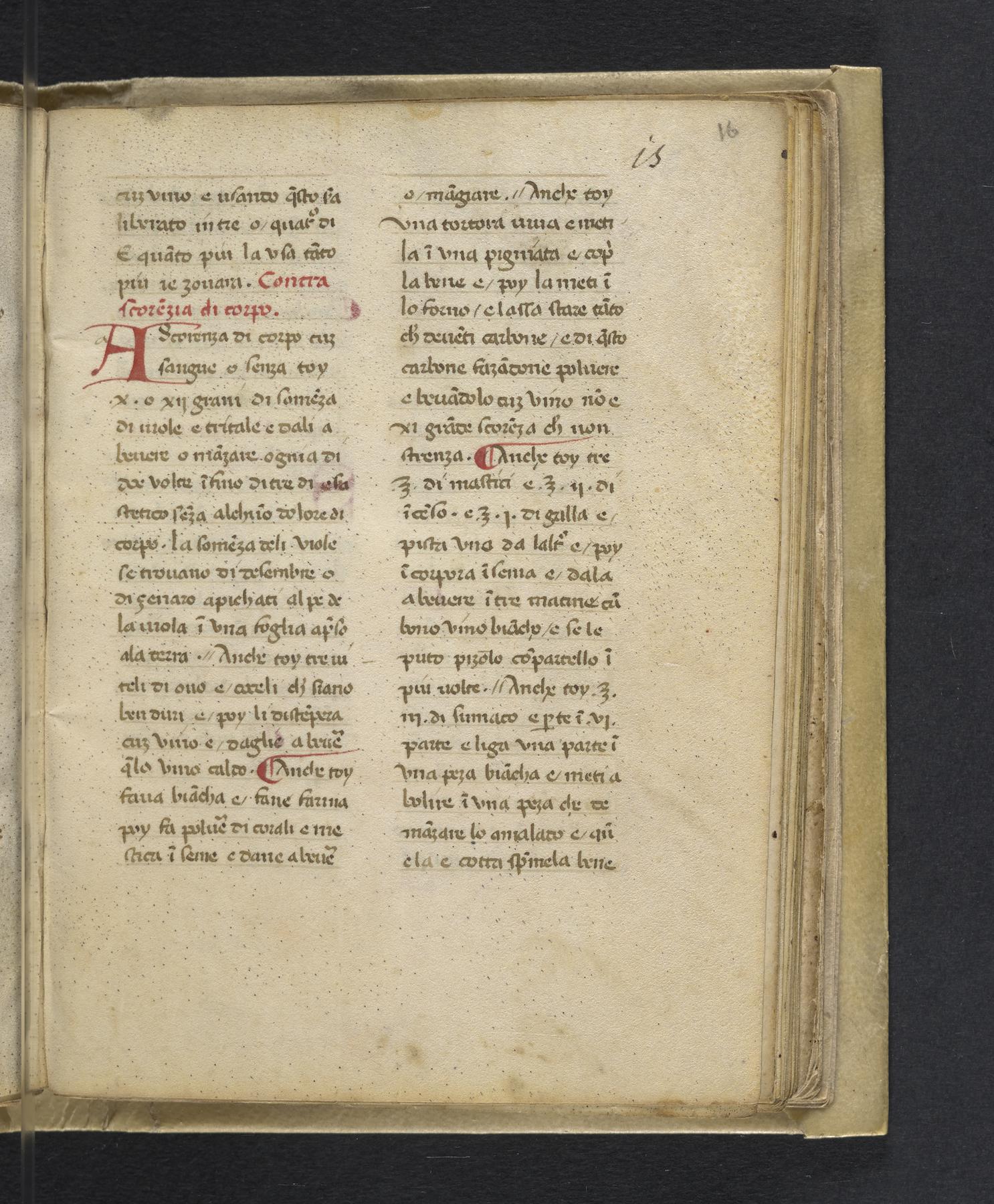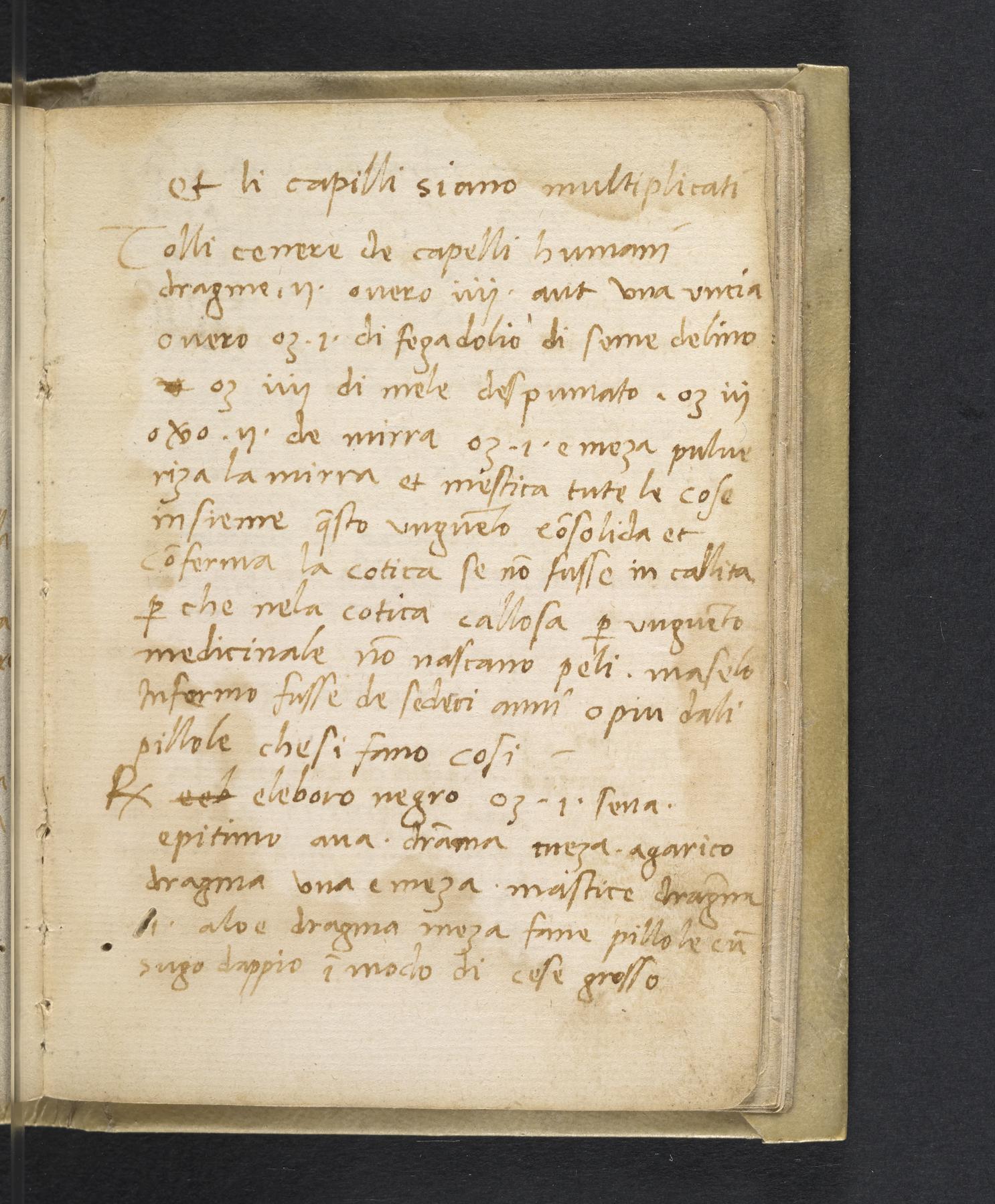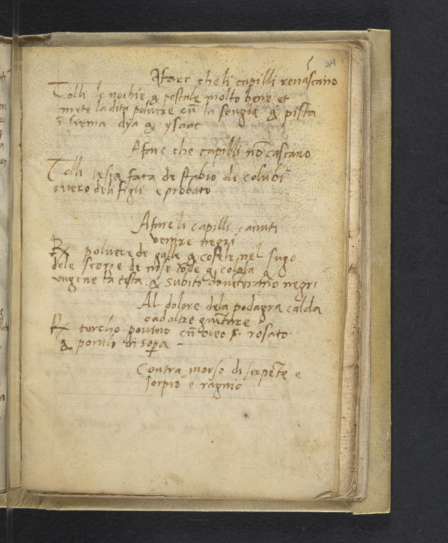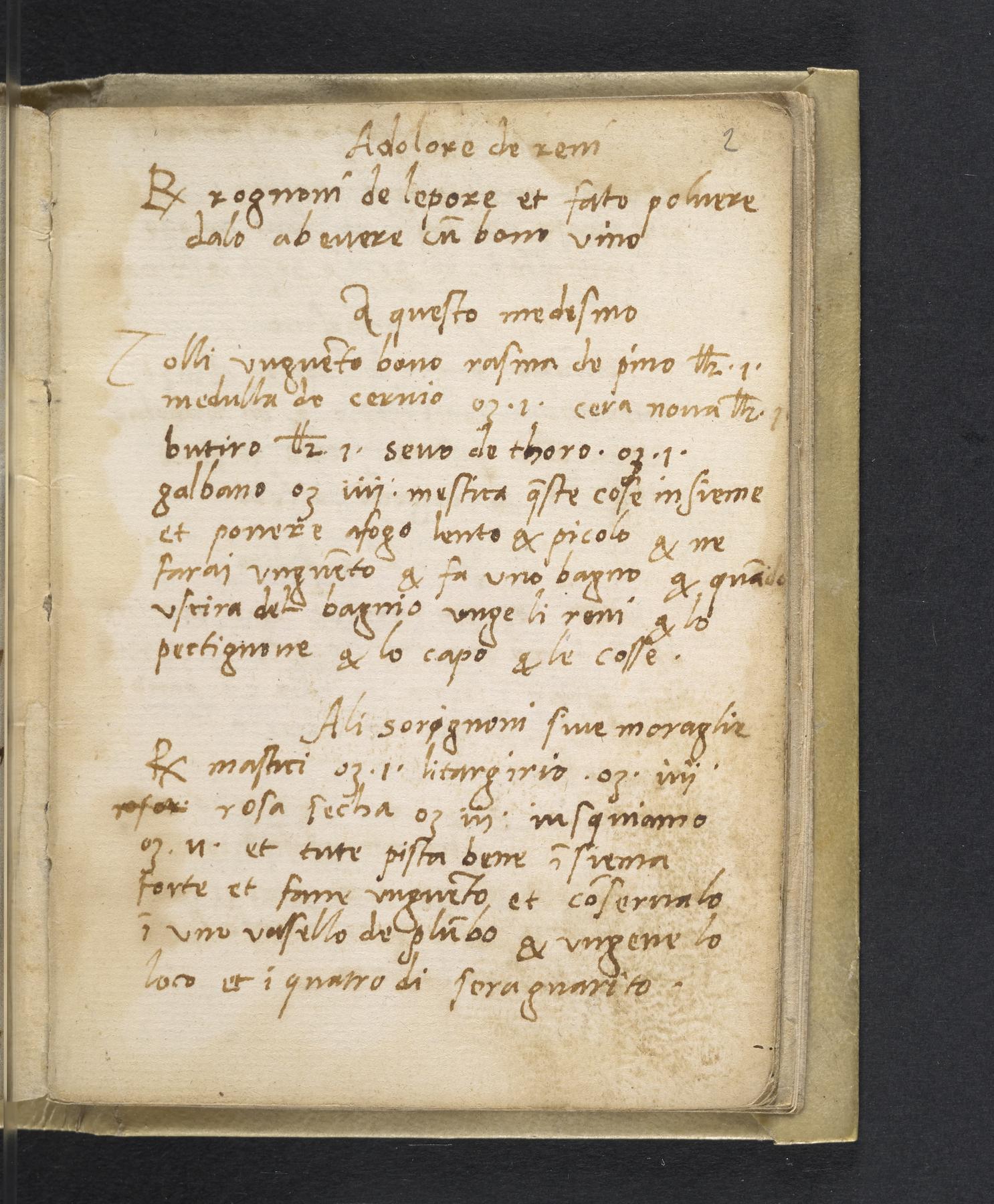This manuscript is a compilation of remedies for various ills chiefly using wine, recipes for pills, for purifying metals, recipes and instructions for making colors for painting, enameling. The first half of the manuscript (fols. 1-32) is 15th century on parchment. Additional remedies in a 16th century hand, for inflamed testicles, menstrual distress, toothache, headache, leprosy, and recipes for birth control and various hair dyes. Folios 1-46 are parchment (1st gathering water-damaged); folios 47-61 are paper. Some marginalia, including multiple signatures of Dom[ina] Maria Barbani di Corticelle, one dated Oct. 1506.