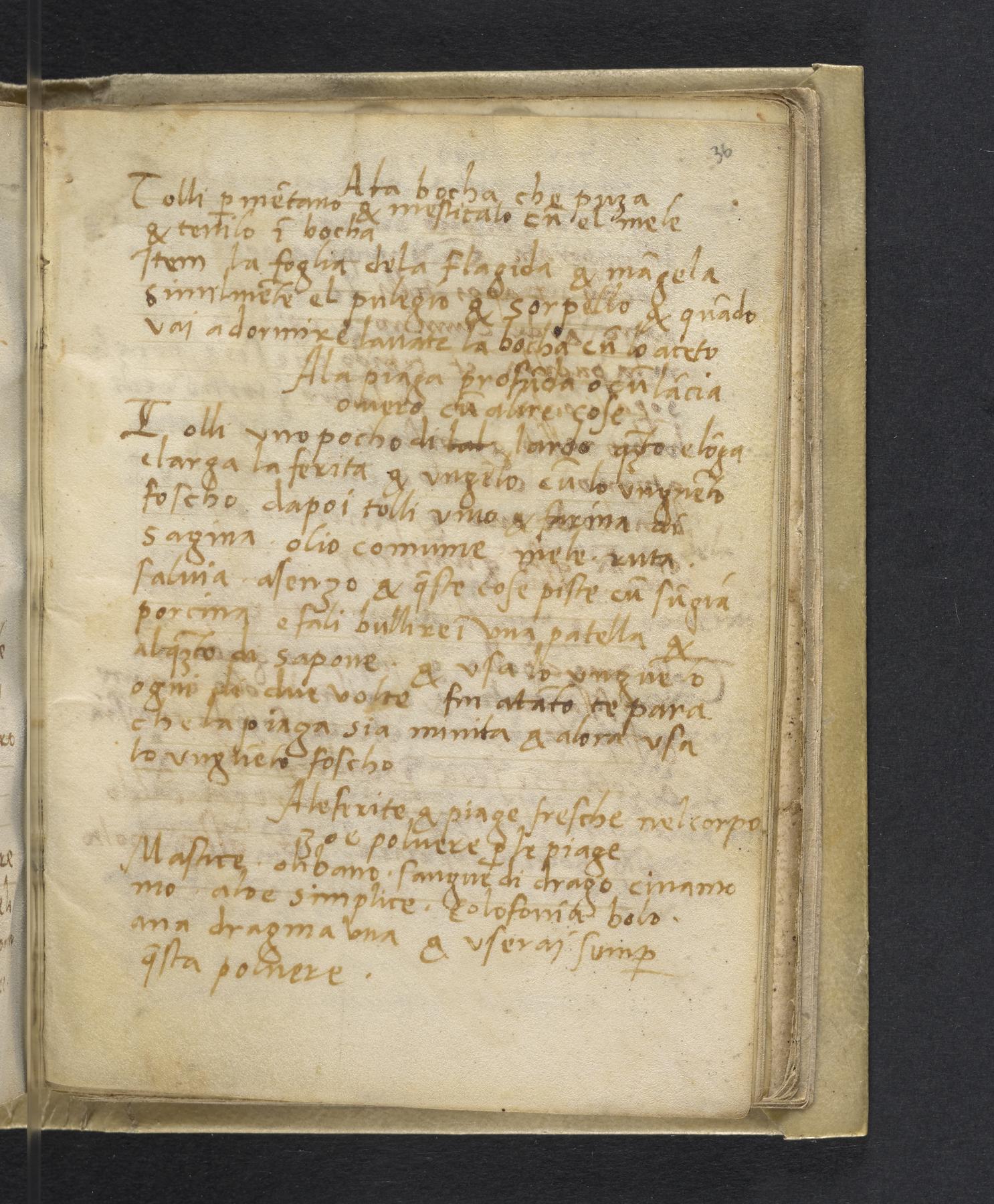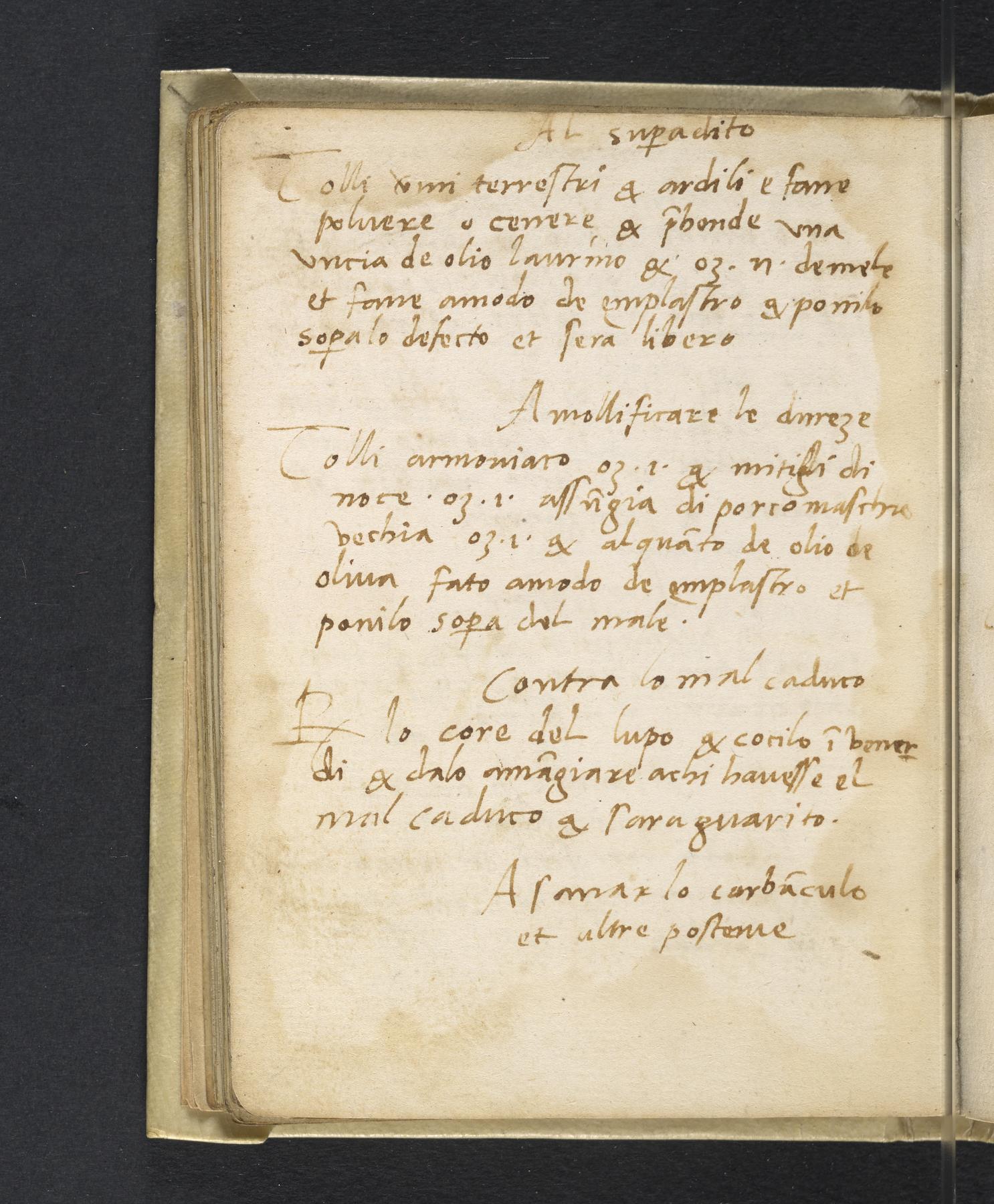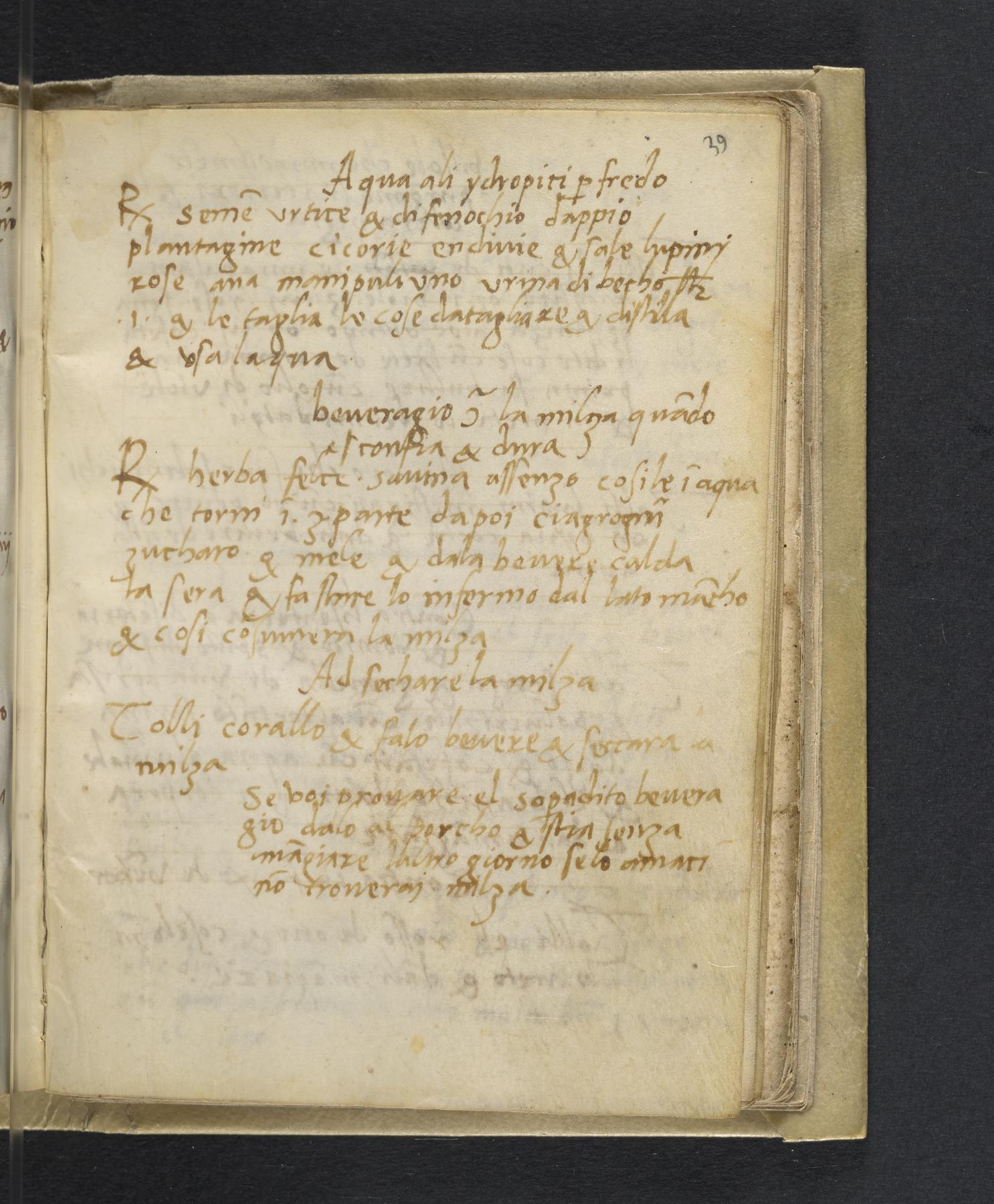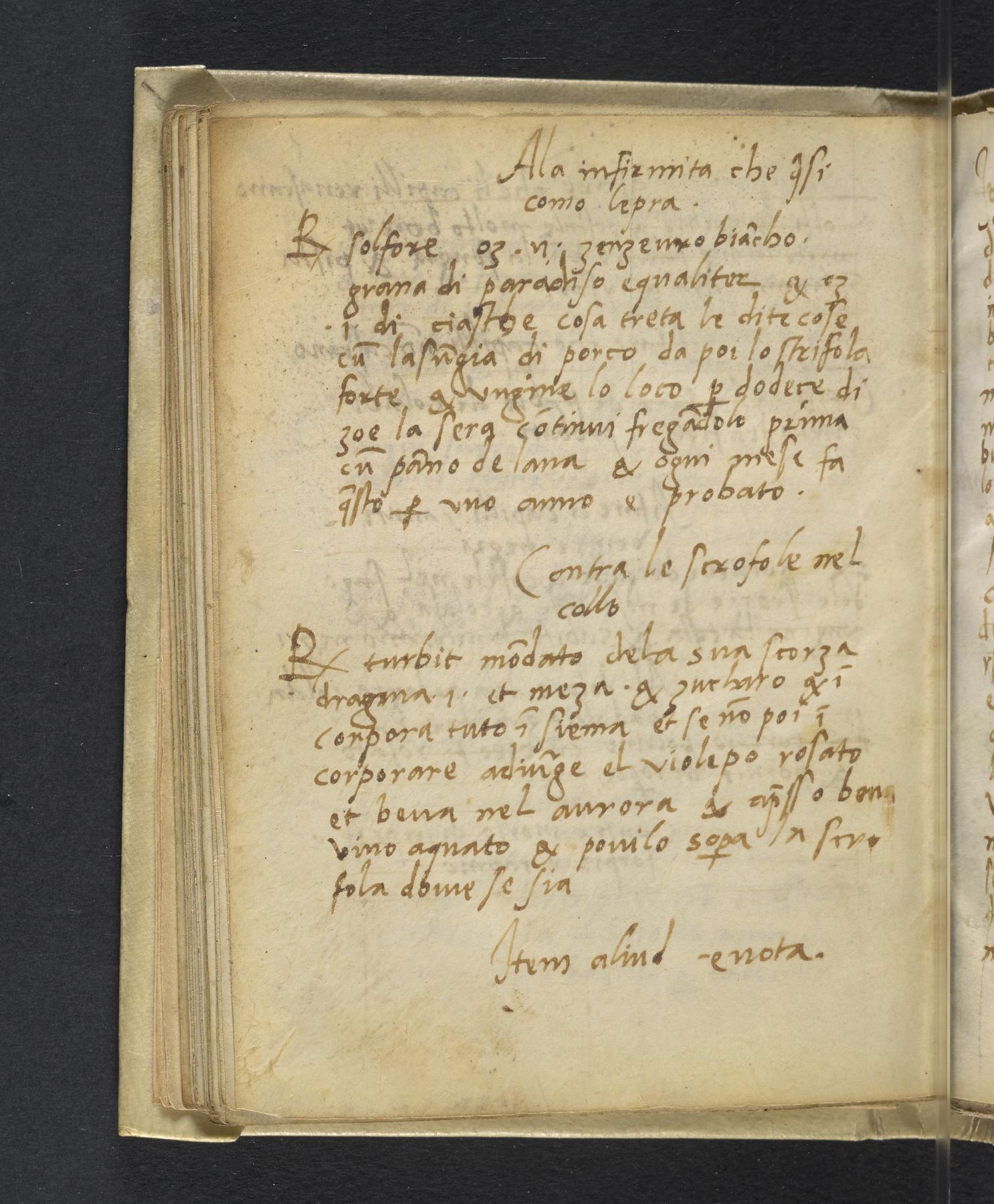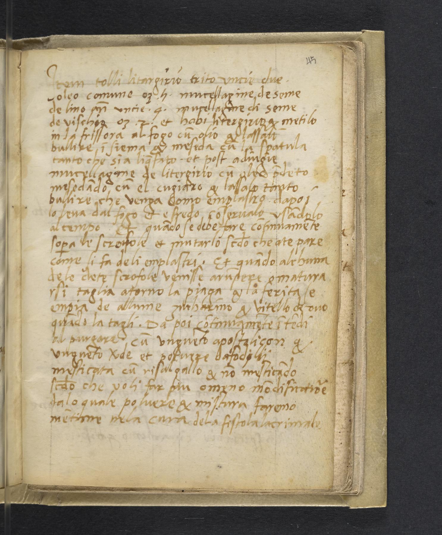 This manuscript is a compilation of remedies for various ills chiefly using wine, recipes for pills, for purifying metals, recipes and instructions for making colors for painting, enameling. The first half of the manuscript (fols. 1-32) is 15th century on parchment. Additional remedies in a 16th century hand, for inflamed testicles, menstrual distress, toothache, headache, leprosy, and recipes for birth control and various hair dyes. Folios 1-46 are parchment (1st gathering water-damaged); folios 47-61 are paper. Some marginalia, including multiple signatures of Dom[ina] Maria Barbani di Corticelle, one dated Oct. 1506.