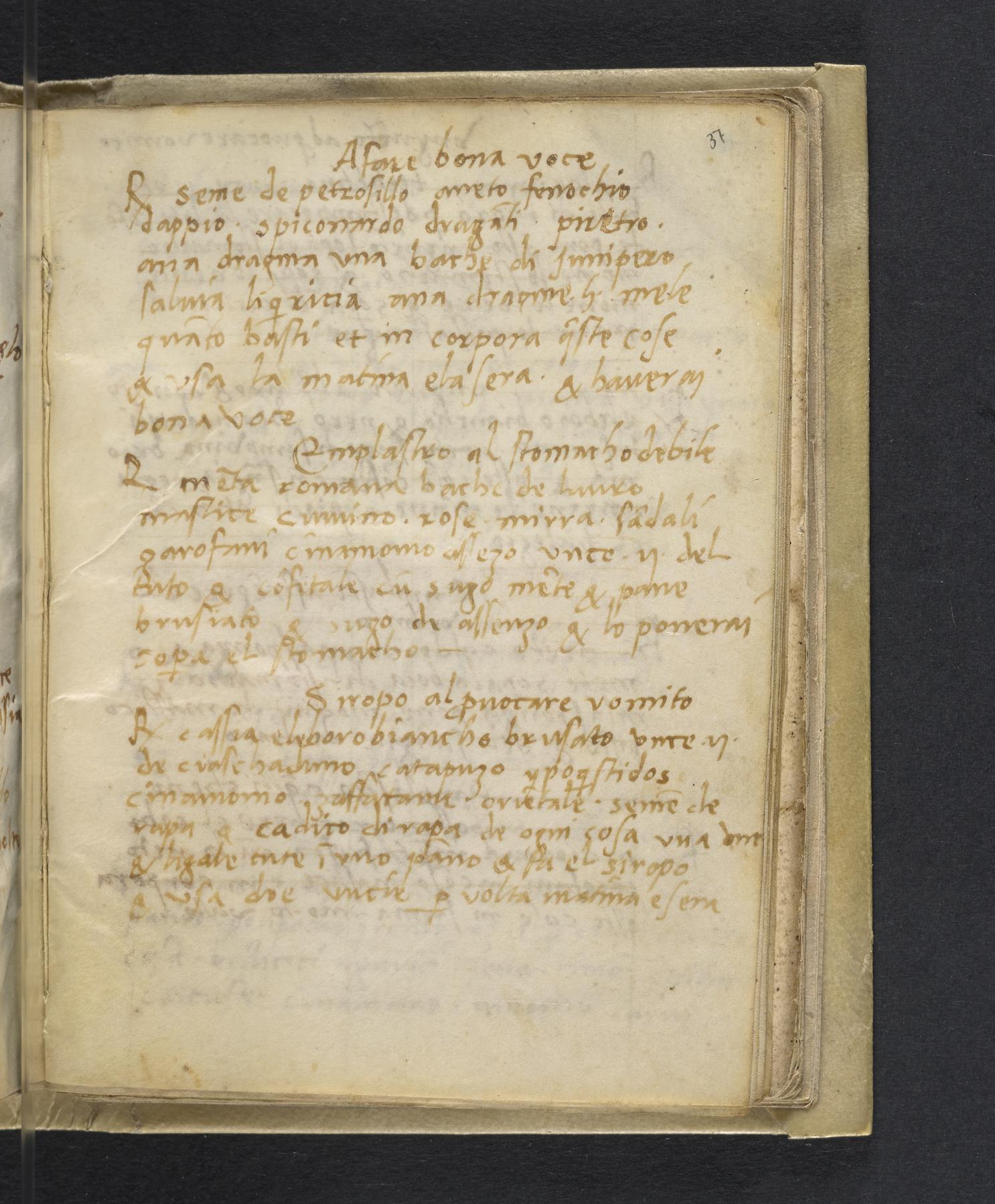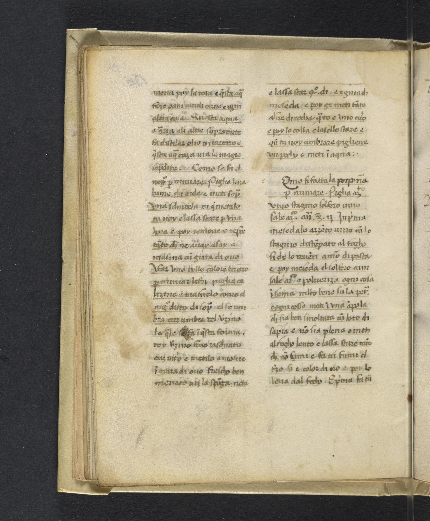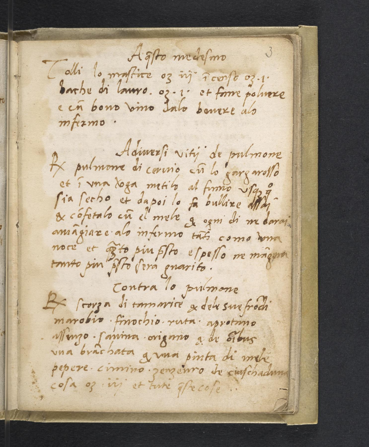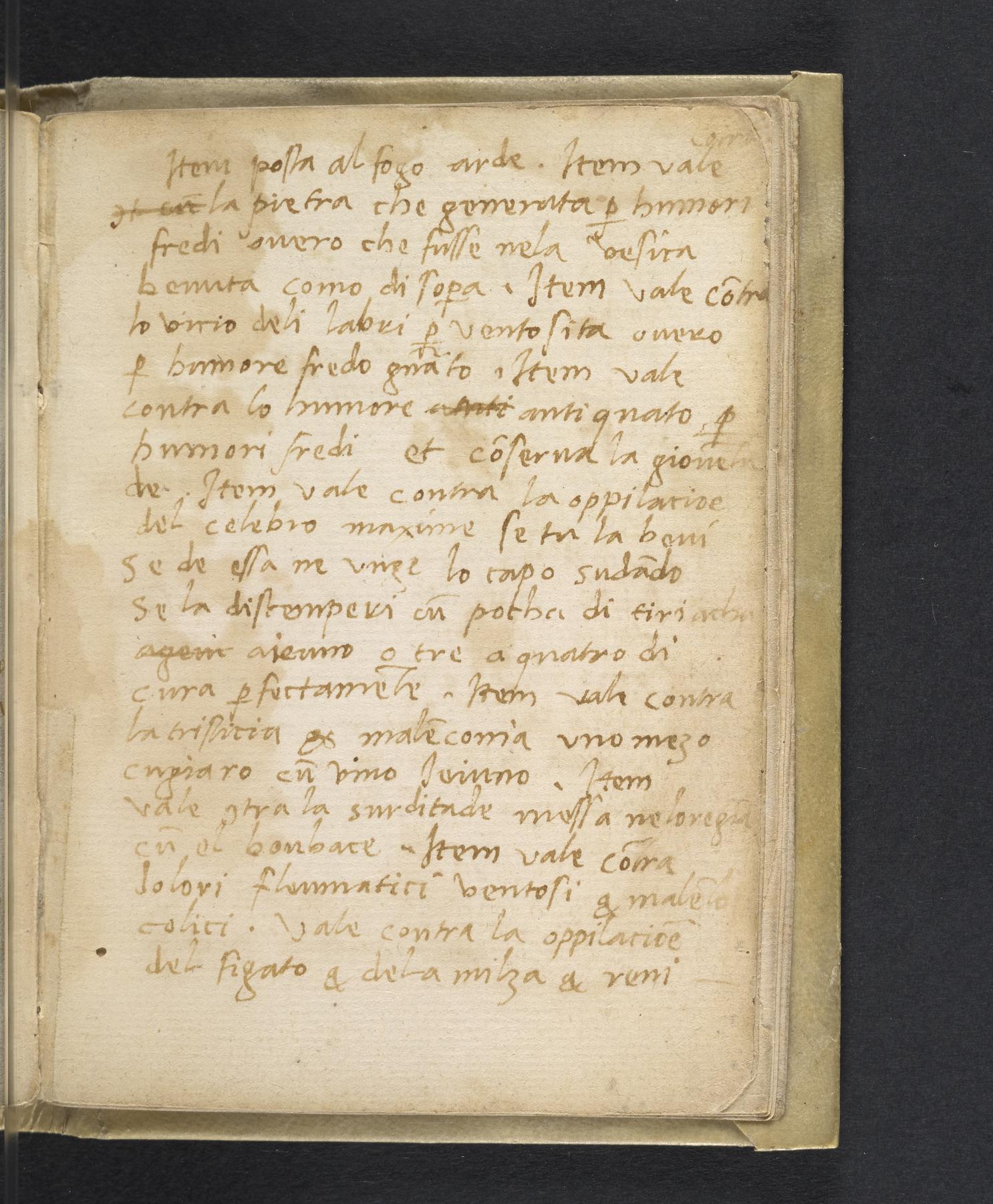 This manuscript is a compilation of remedies for various ills chiefly using wine, recipes for pills, for purifying metals, recipes and instructions for making colors for painting, enameling. The first half of the manuscript (fols. 1-32) is 15th century on parchment. Additional remedies in a 16th century hand, for inflamed testicles, menstrual distress, toothache, headache, leprosy, and recipes for birth control and various hair dyes. Folios 1-46 are parchment (1st gathering water-damaged); folios 47-61 are paper. Some marginalia, including multiple signatures of Dom[ina] Maria Barbani di Corticelle, one dated Oct. 1506.