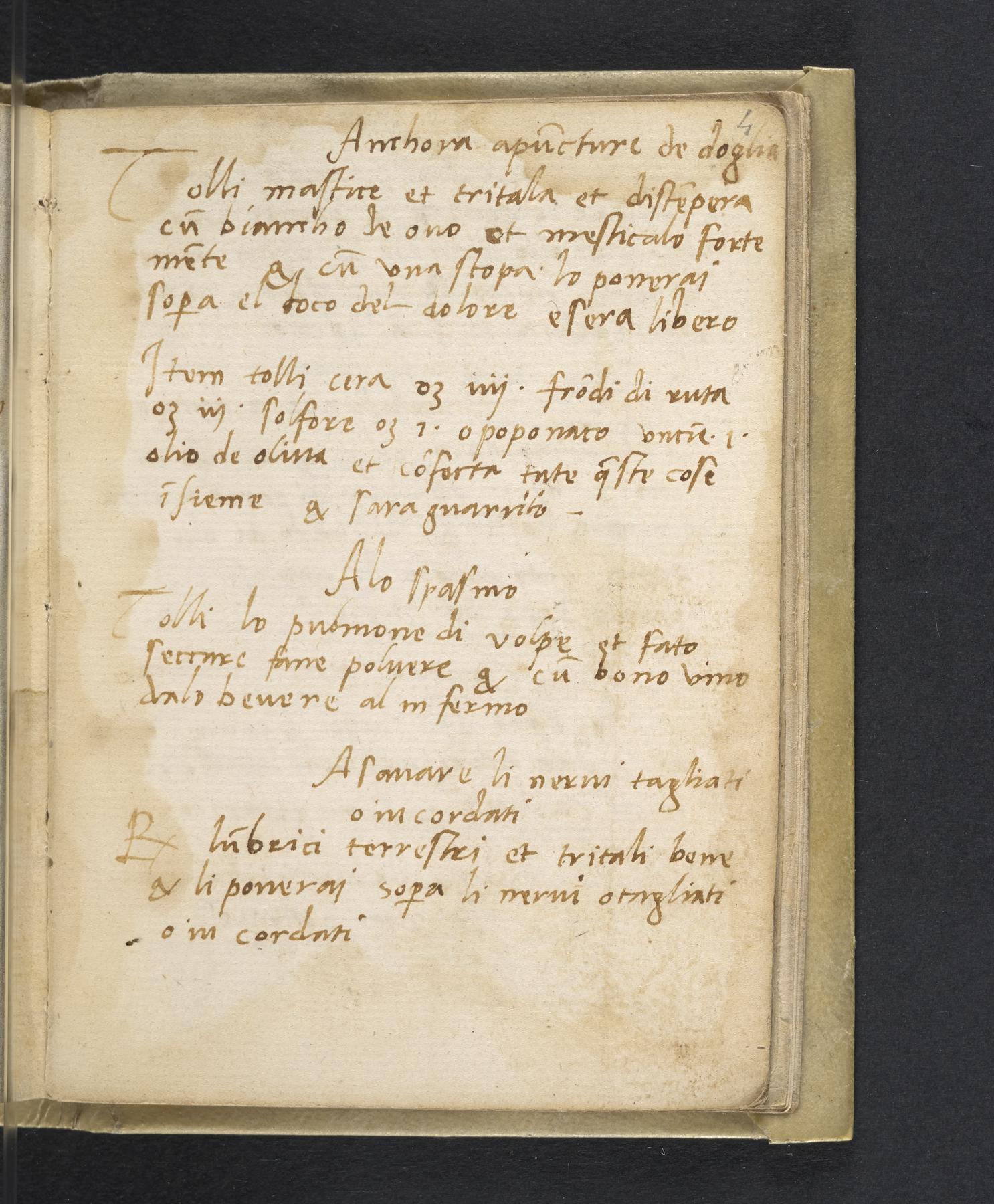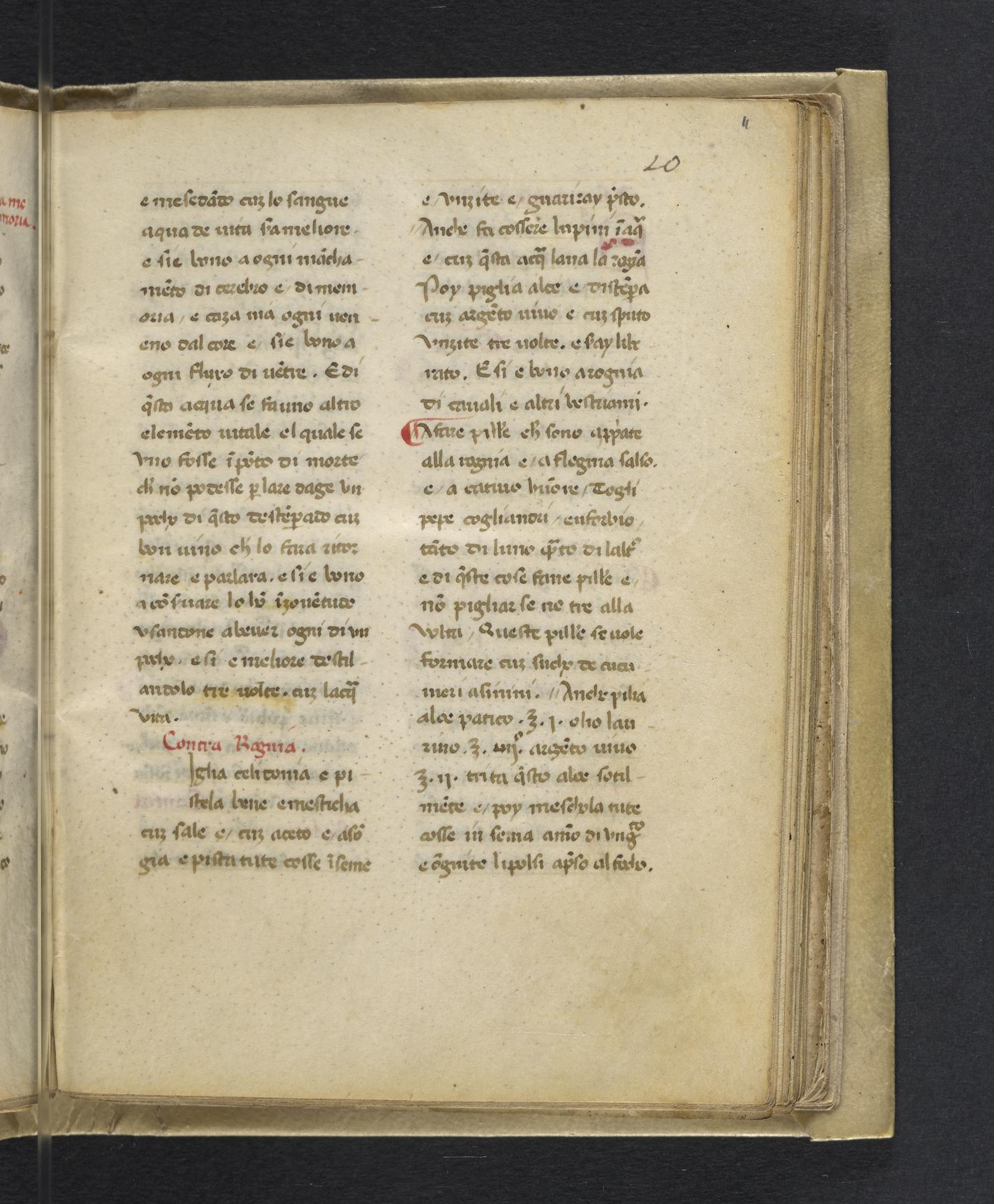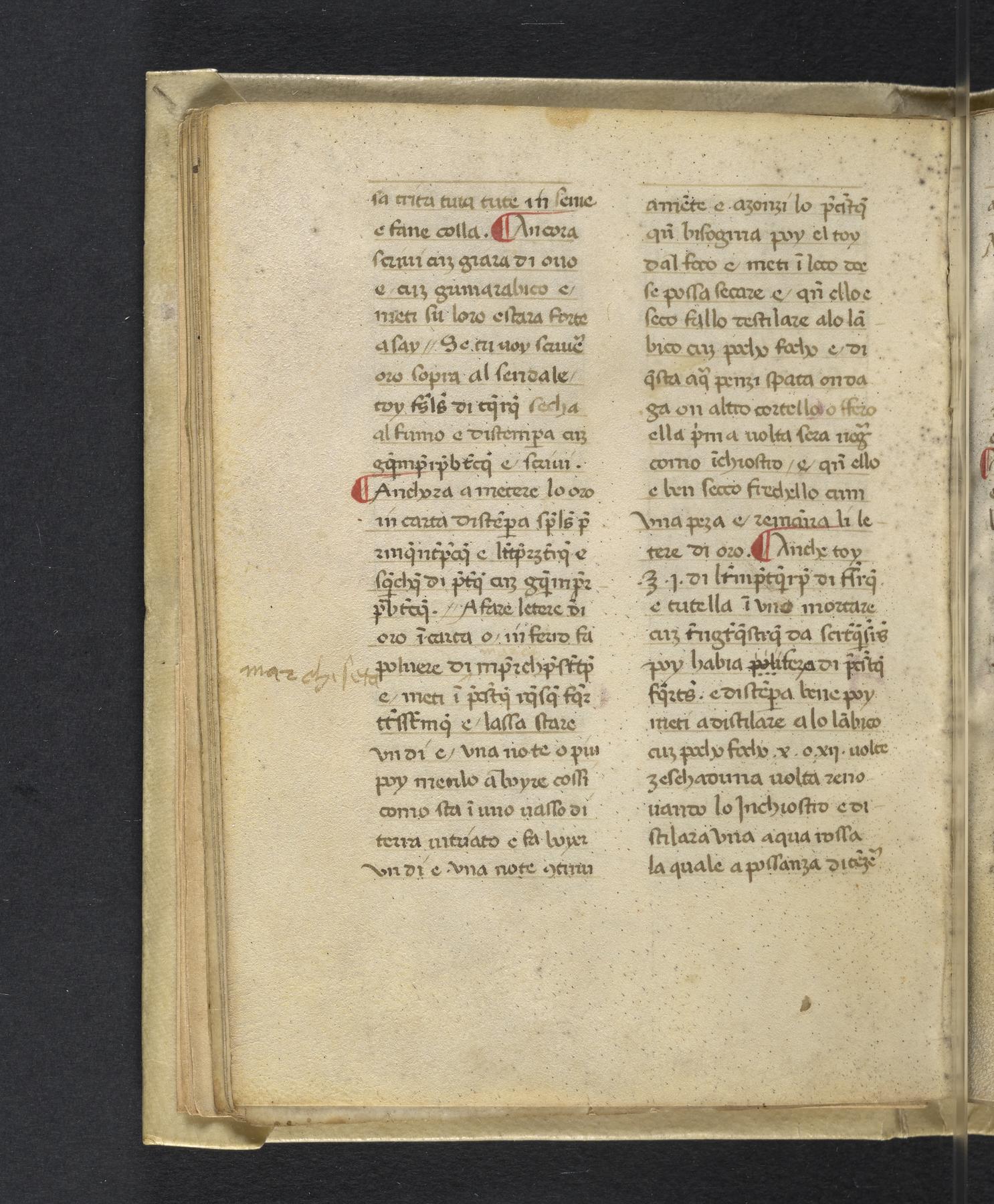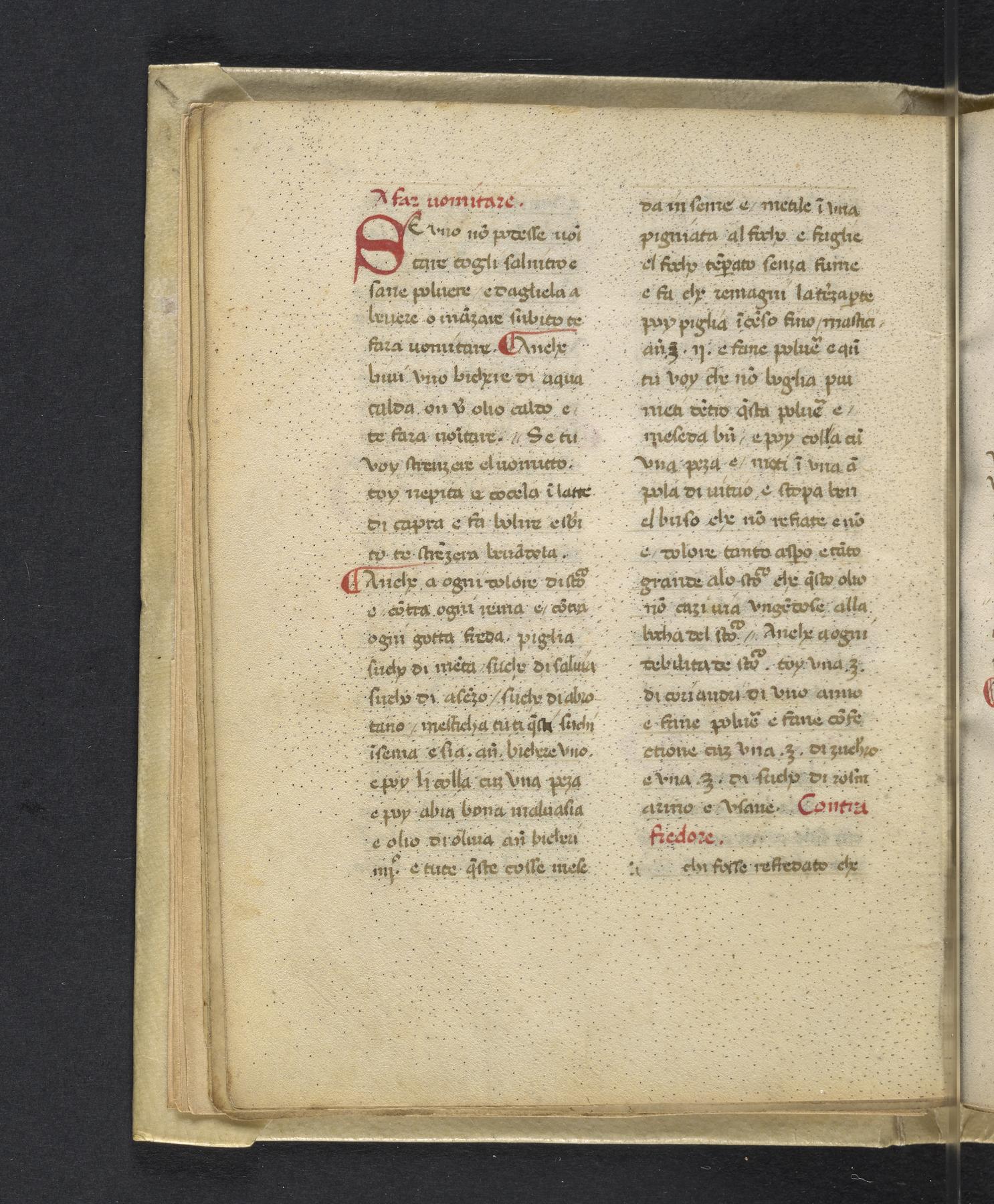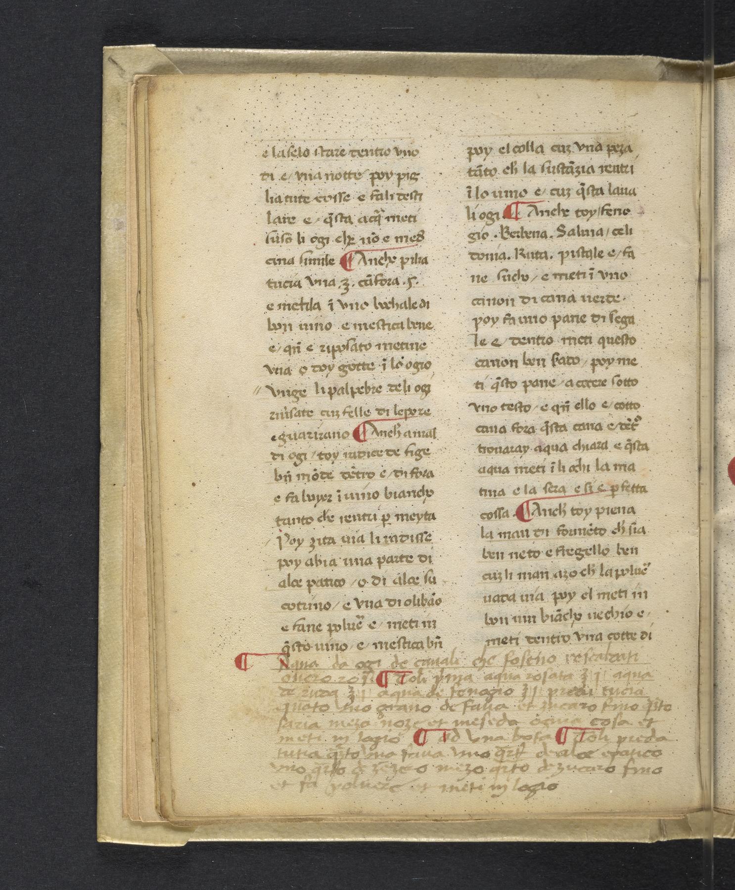 This manuscript is a compilation of remedies for various ills chiefly using wine, recipes for pills, for purifying metals, recipes and instructions for making colors for painting, enameling. The first half of the manuscript (fols. 1-32) is 15th century on parchment. Additional remedies in a 16th century hand, for inflamed testicles, menstrual distress, toothache, headache, leprosy, and recipes for birth control and various hair dyes. Folios 1-46 are parchment (1st gathering water-damaged); folios 47-61 are paper. Some marginalia, including multiple signatures of Dom[ina] Maria Barbani di Corticelle, one dated Oct. 1506.