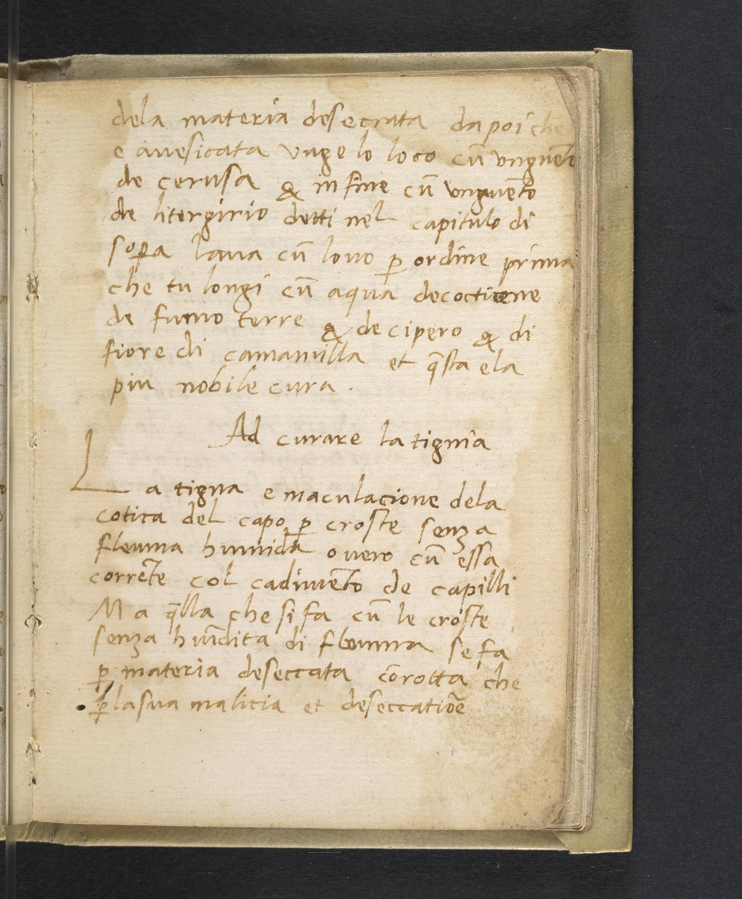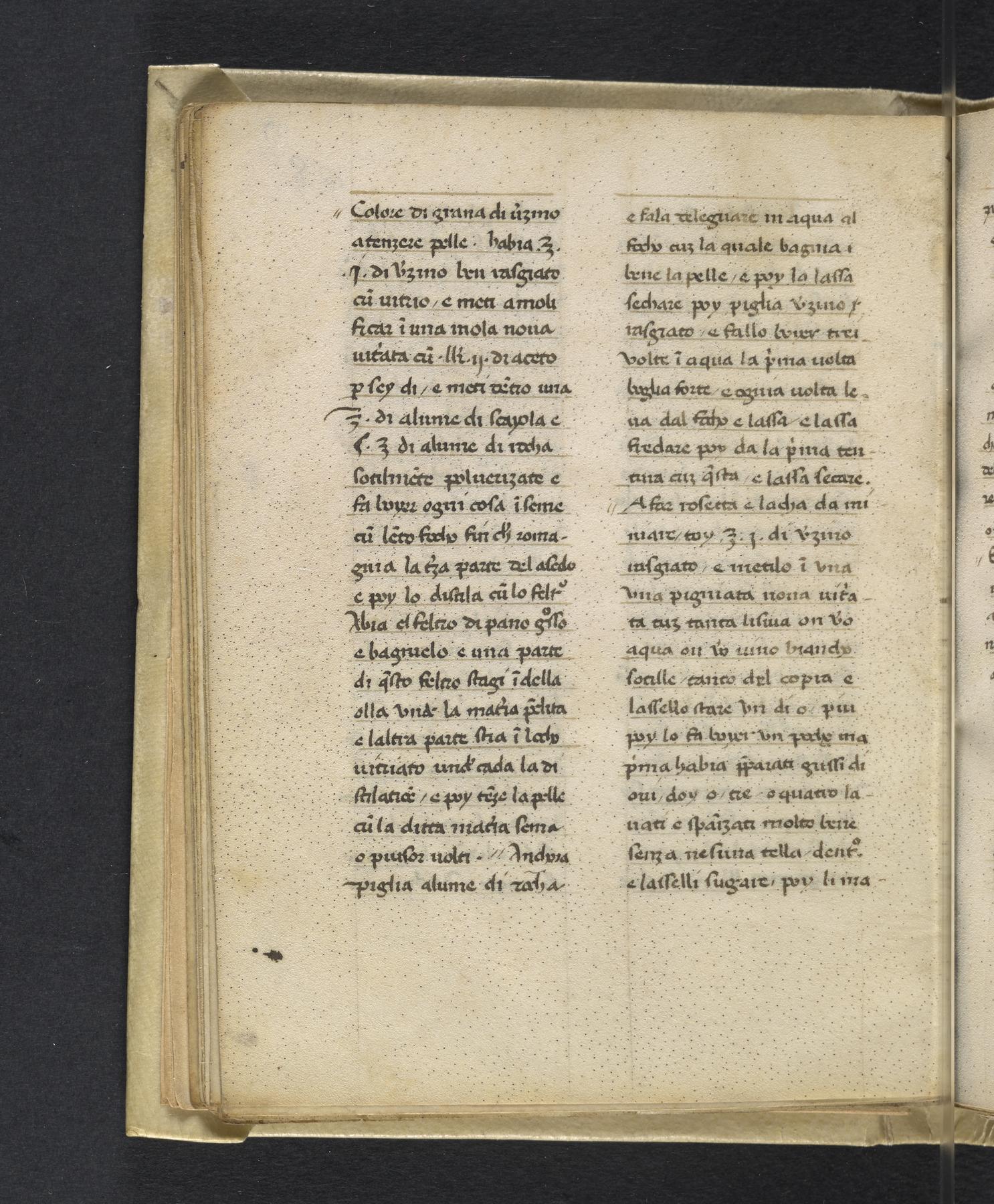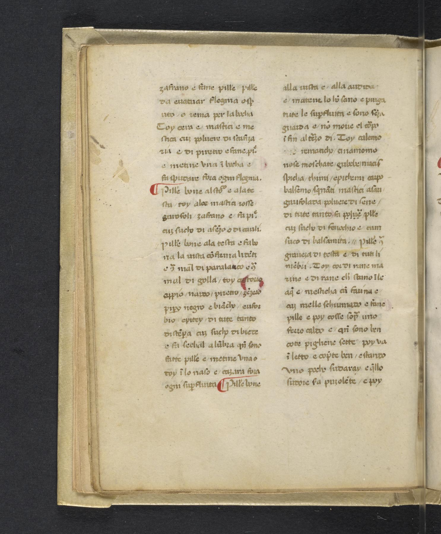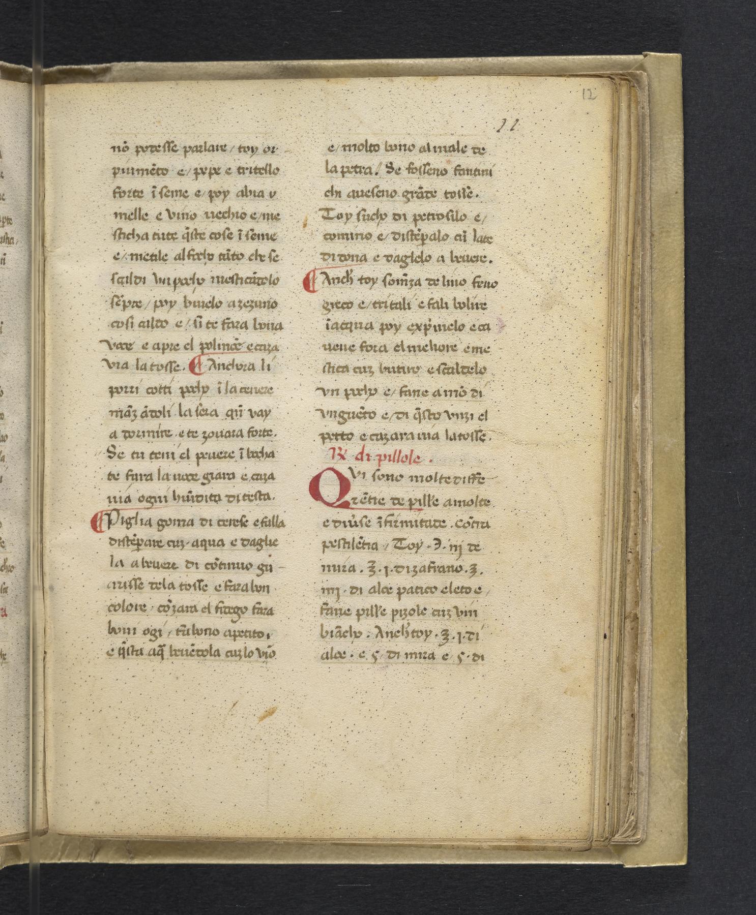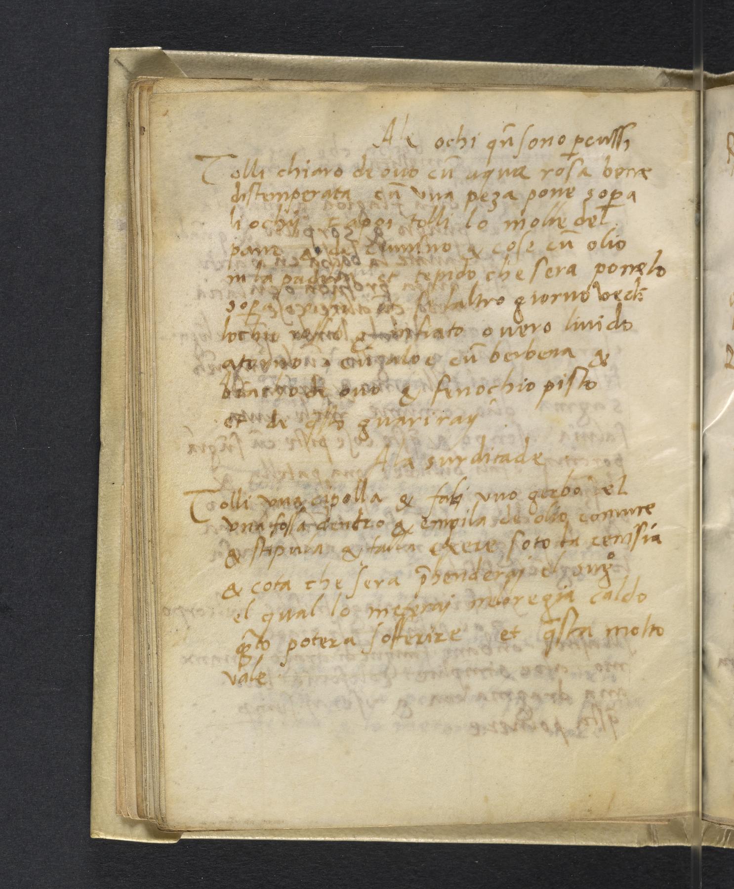 This manuscript is a compilation of remedies for various ills chiefly using wine, recipes for pills, for purifying metals, recipes and instructions for making colors for painting, enameling. The first half of the manuscript (fols. 1-32) is 15th century on parchment. Additional remedies in a 16th century hand, for inflamed testicles, menstrual distress, toothache, headache, leprosy, and recipes for birth control and various hair dyes. Folios 1-46 are parchment (1st gathering water-damaged); folios 47-61 are paper. Some marginalia, including multiple signatures of Dom[ina] Maria Barbani di Corticelle, one dated Oct. 1506.