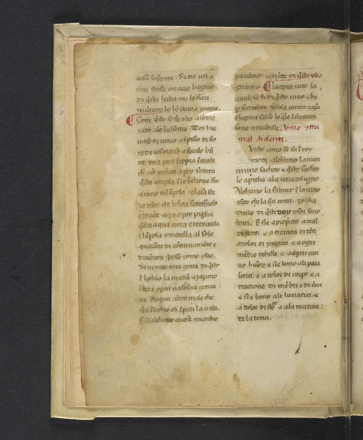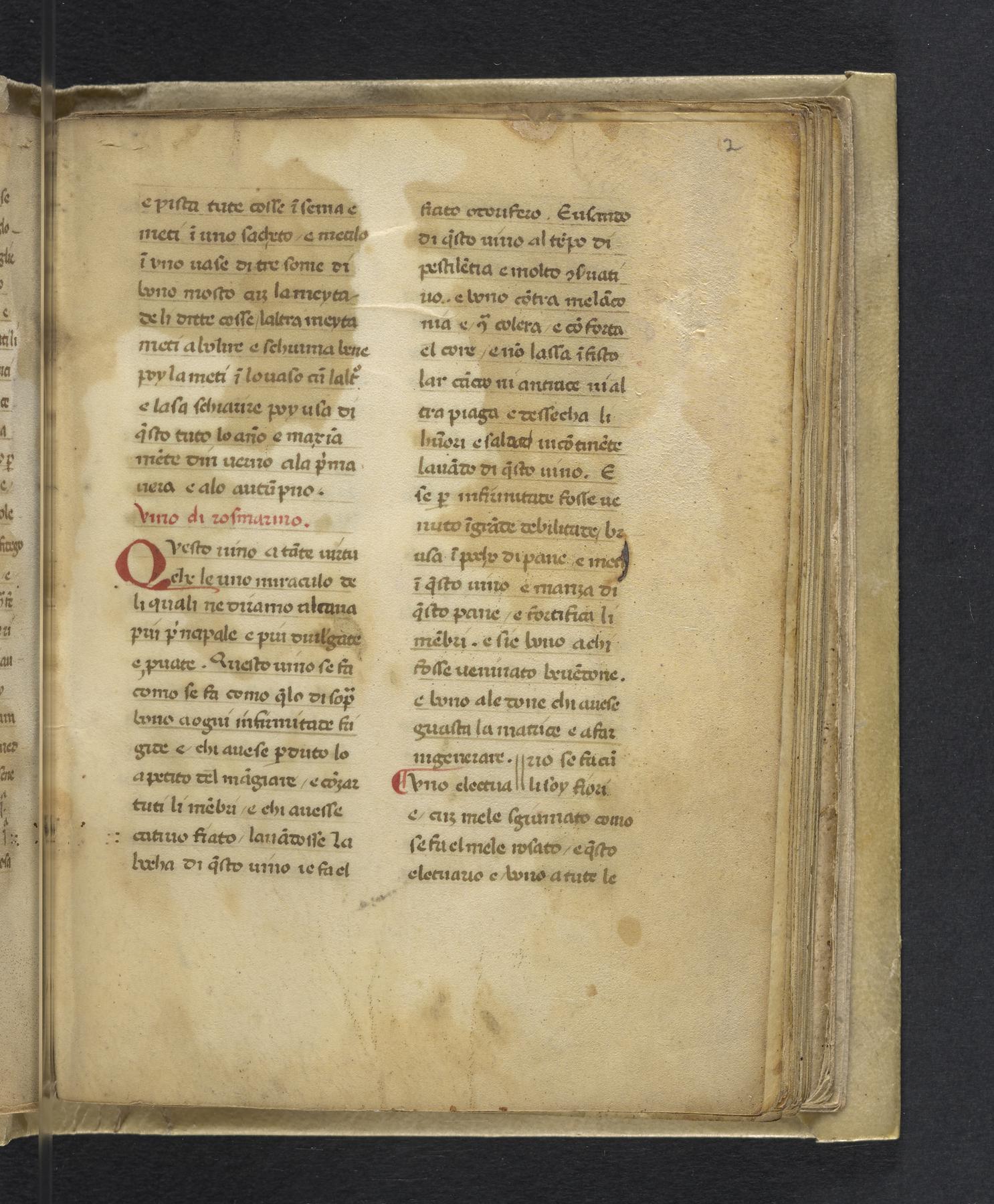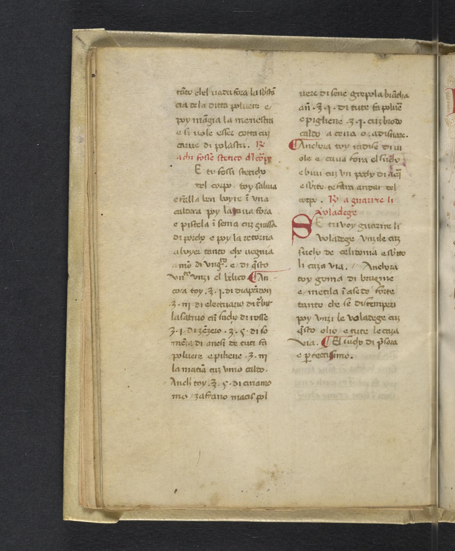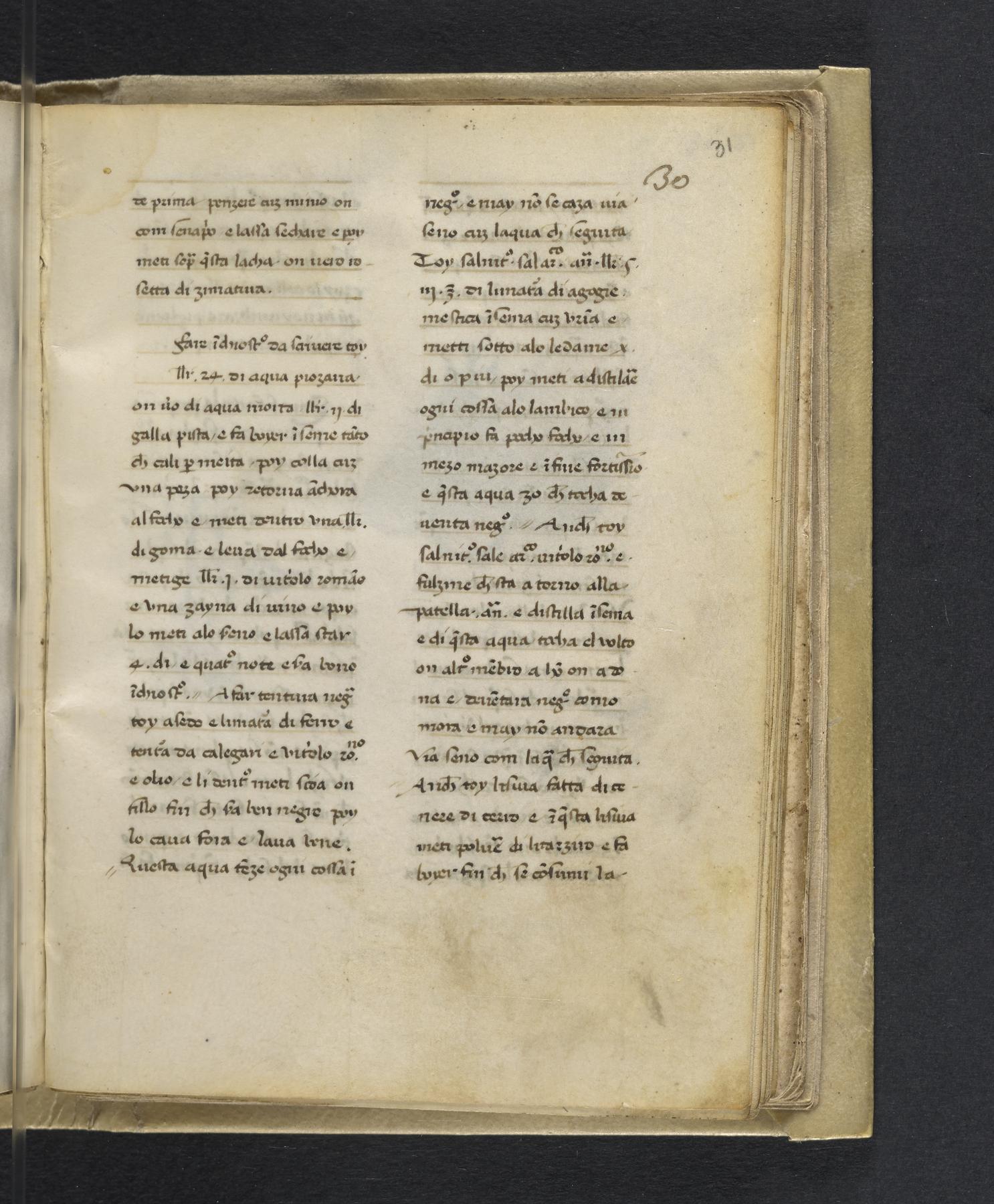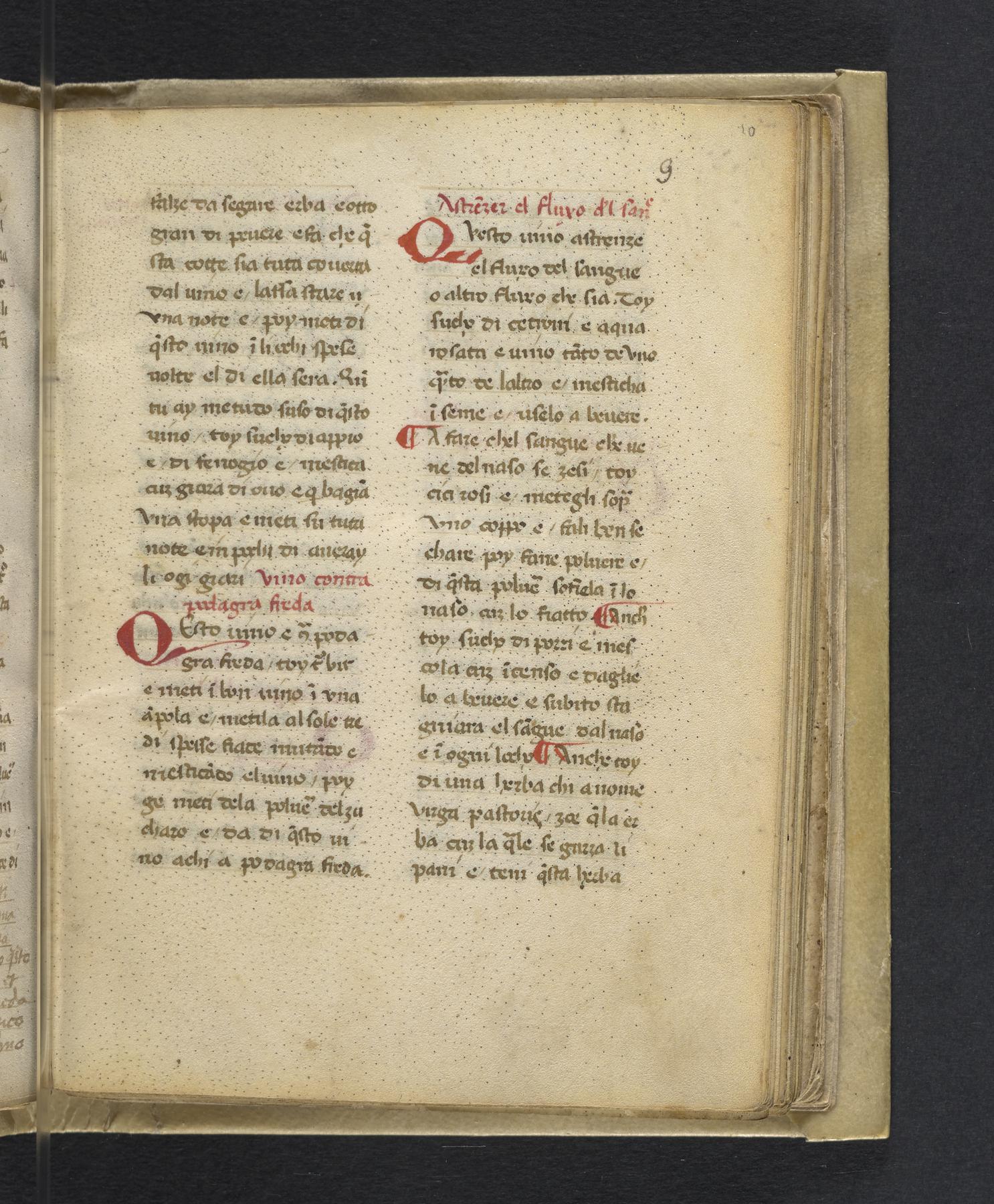 This manuscript is a compilation of remedies for various ills chiefly using wine, recipes for pills, for purifying metals, recipes and instructions for making colors for painting, enameling. The first half of the manuscript (fols. 1-32) is 15th century on parchment. Additional remedies in a 16th century hand, for inflamed testicles, menstrual distress, toothache, headache, leprosy, and recipes for birth control and various hair dyes. Folios 1-46 are parchment (1st gathering water-damaged); folios 47-61 are paper. Some marginalia, including multiple signatures of Dom[ina] Maria Barbani di Corticelle, one dated Oct. 1506.