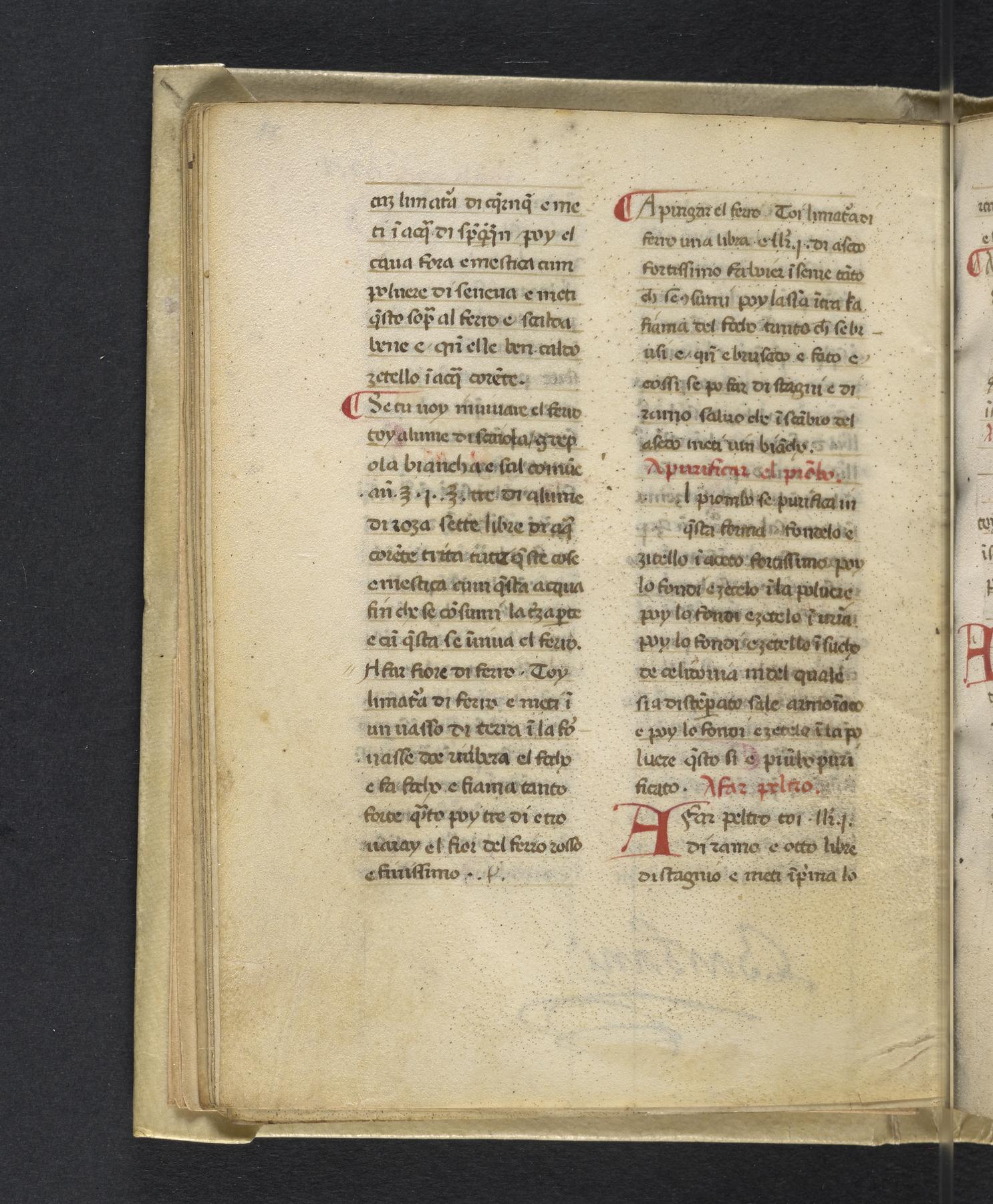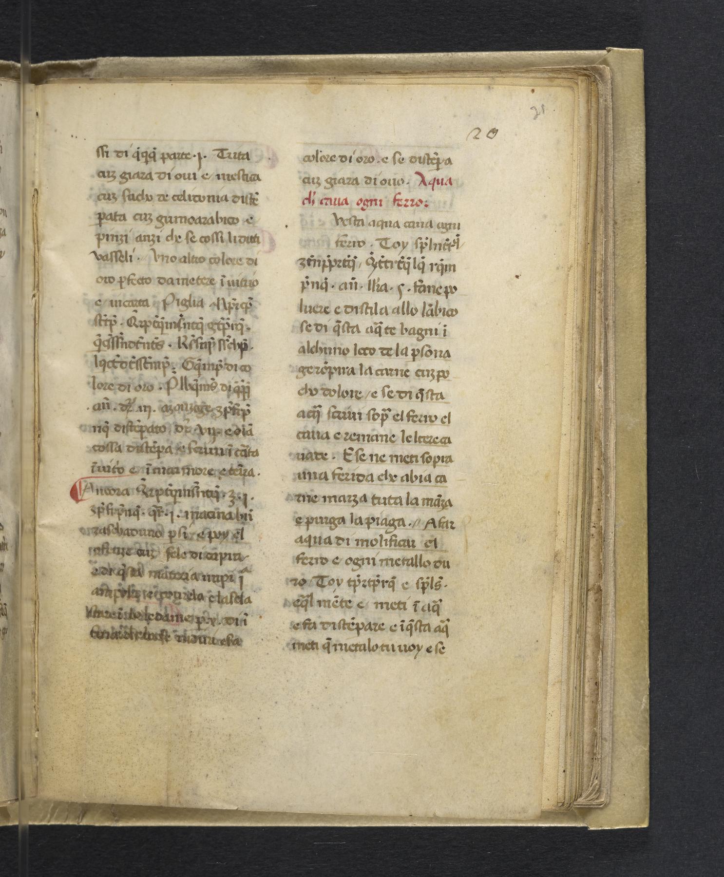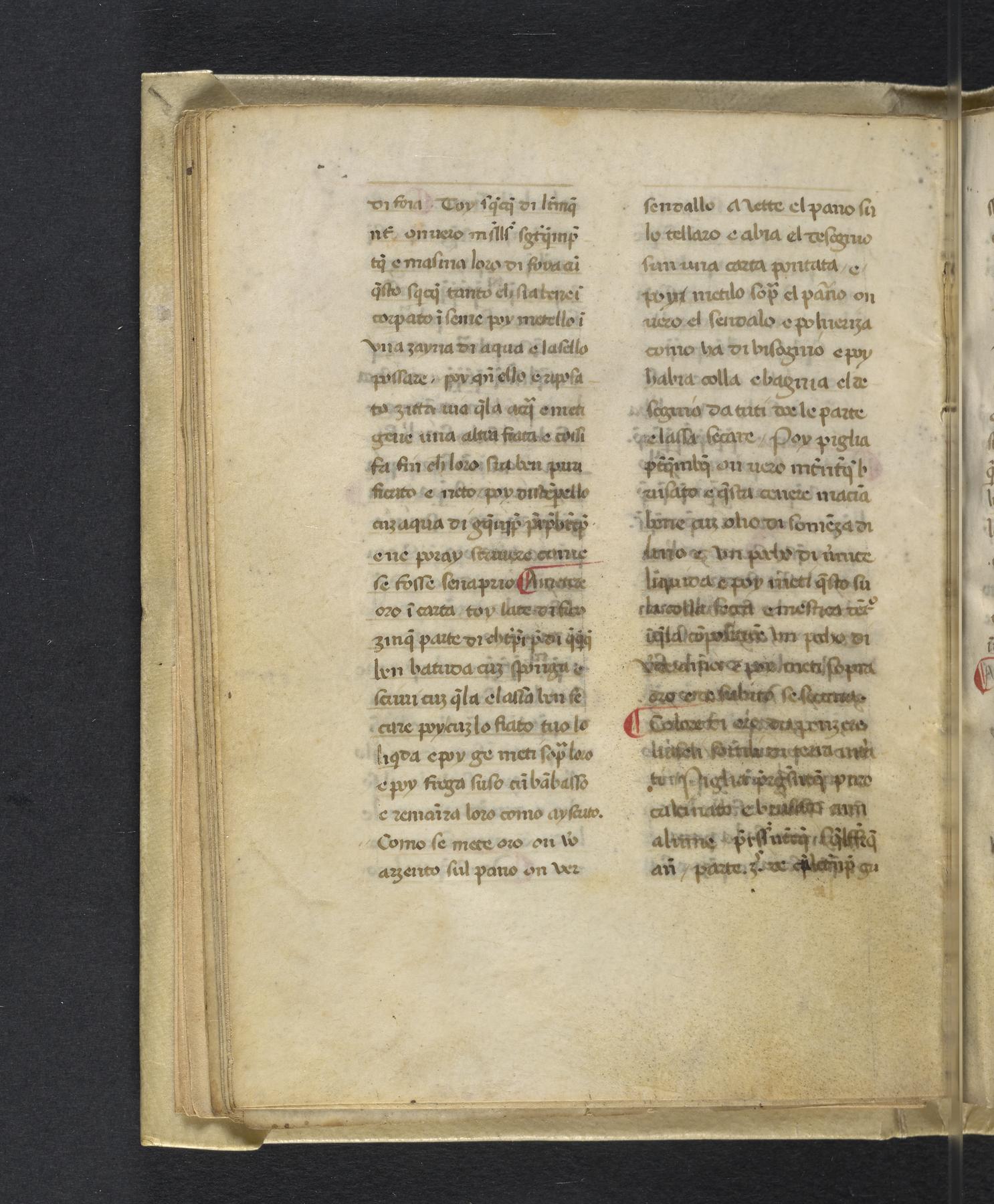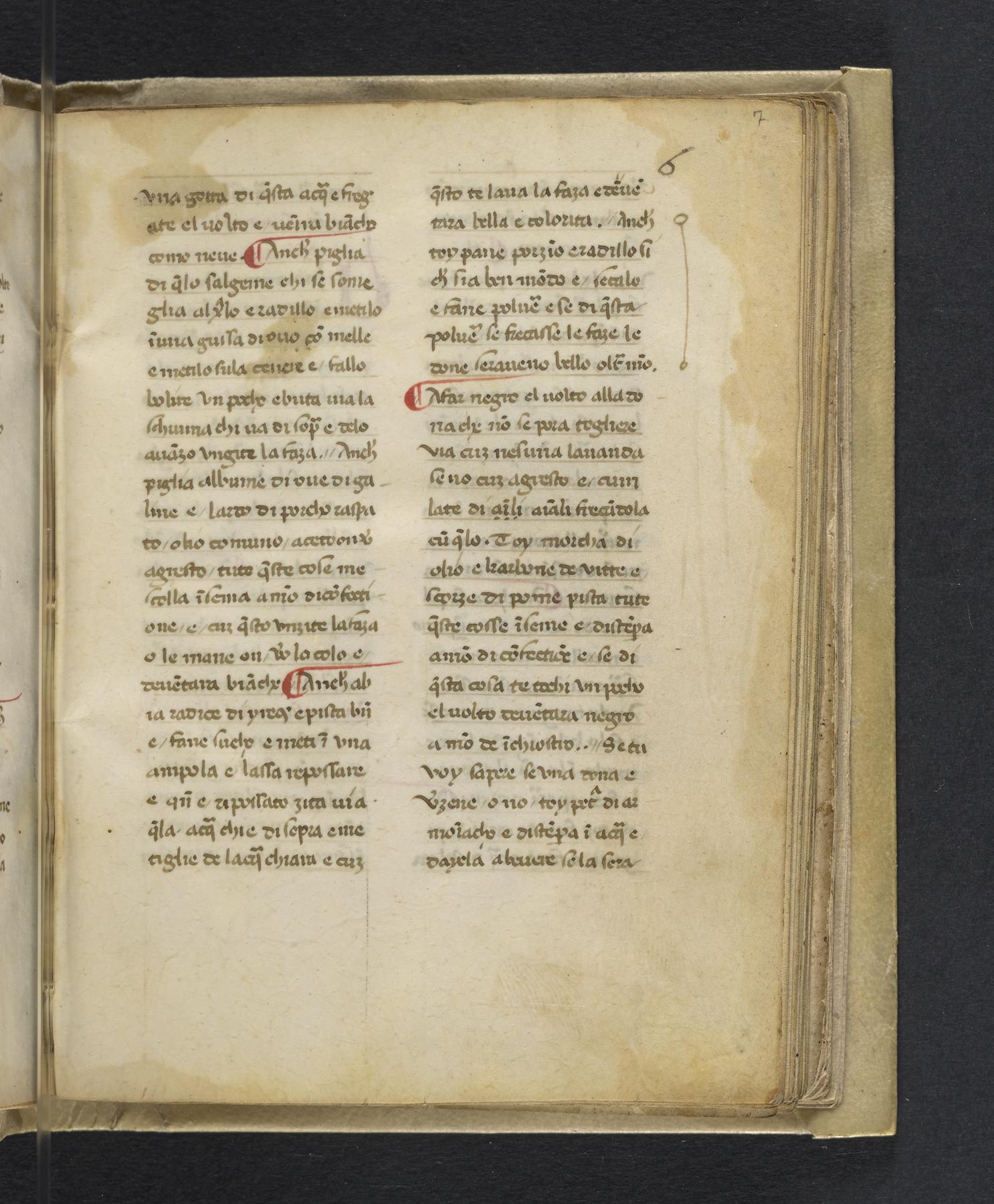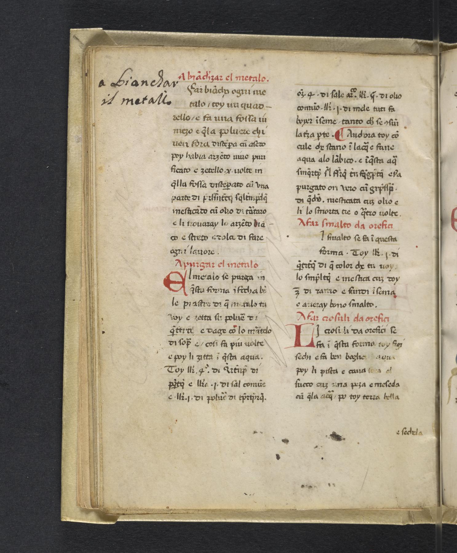This manuscript is a compilation of remedies for various ills chiefly using wine, recipes for pills, for purifying metals, recipes and instructions for making colors for painting, enameling. The first half of the manuscript (fols. 1-32) is 15th century on parchment. Additional remedies in a 16th century hand, for inflamed testicles, menstrual distress, toothache, headache, leprosy, and recipes for birth control and various hair dyes. Folios 1-46 are parchment (1st gathering water-damaged); folios 47-61 are paper. Some marginalia, including multiple signatures of Dom[ina] Maria Barbani di Corticelle, one dated Oct. 1506.