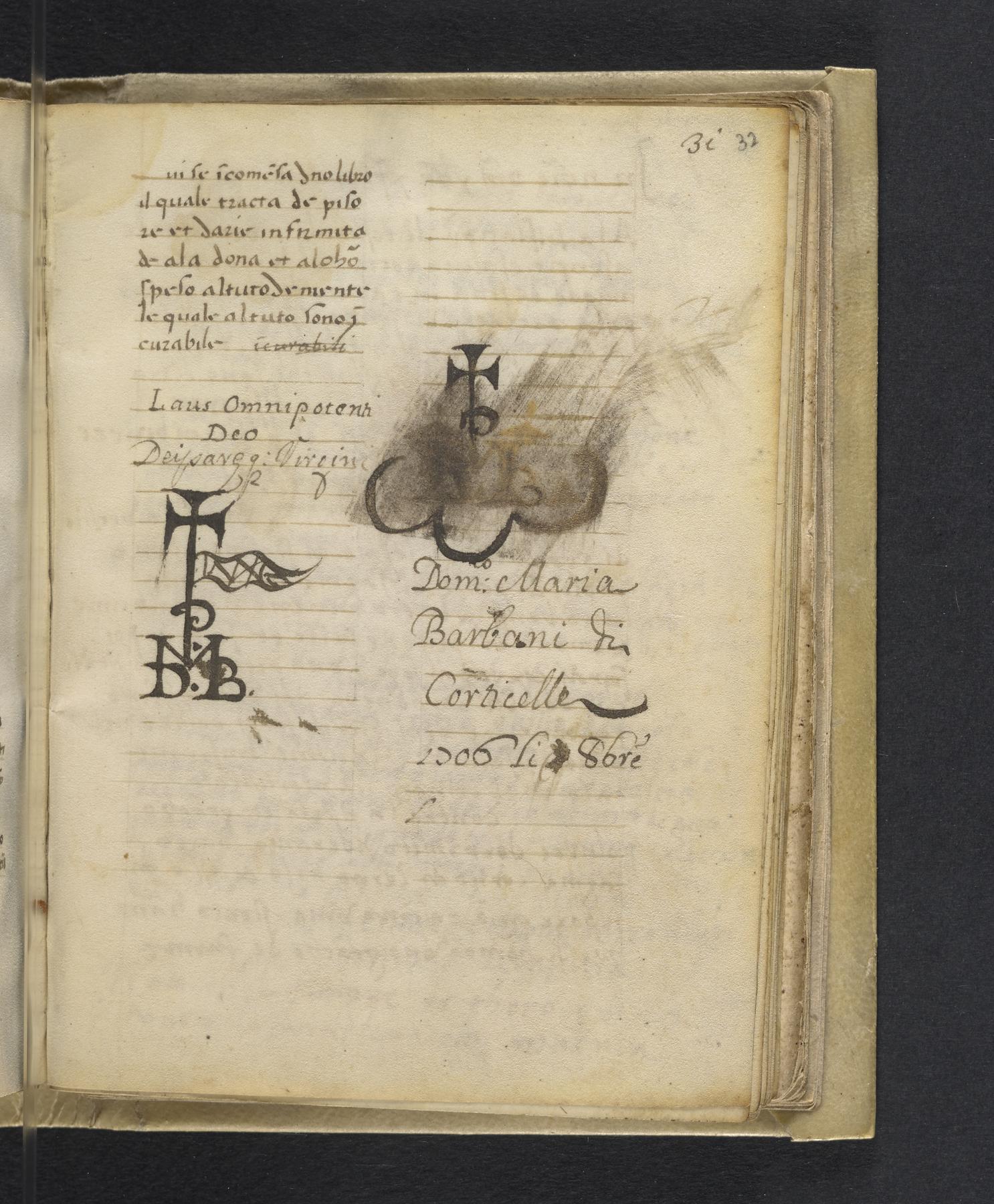 - fol. 32r — Signatures and a stylized monogram, (DMB - Domina Maria Barbani); inscription reads "Laus Omnipotens Deo; Dei paveai Vireisi<?>", possible translation from Latin; "praise almighty god, or let man fear his wrath"