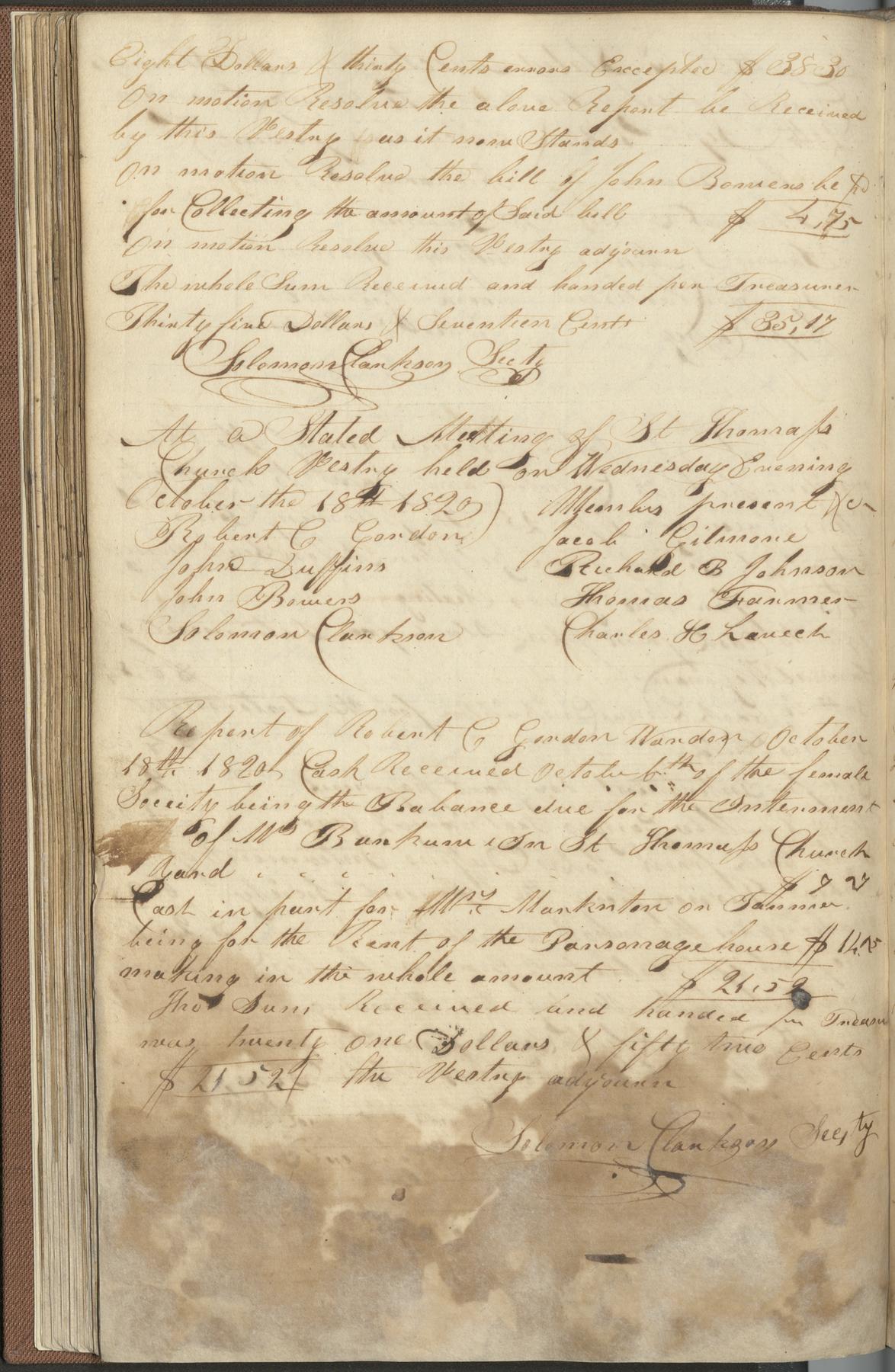 - To the extent possible under law, African Episcopal Church of St. Thomas has waived all copyright and related or neighboring rights to this metadata about African Episcopal Church of St. Thomas StThomas.VestryMinutes1813-1821: Vestry minutes, 1813-1821. This work is published from: United States. For a summary of CC0, see https://creativecommons.org/publicdomain/zero/1.0/. Legal code: https://creativecommons.org/publicdomain/zero/1.0/legalcode.