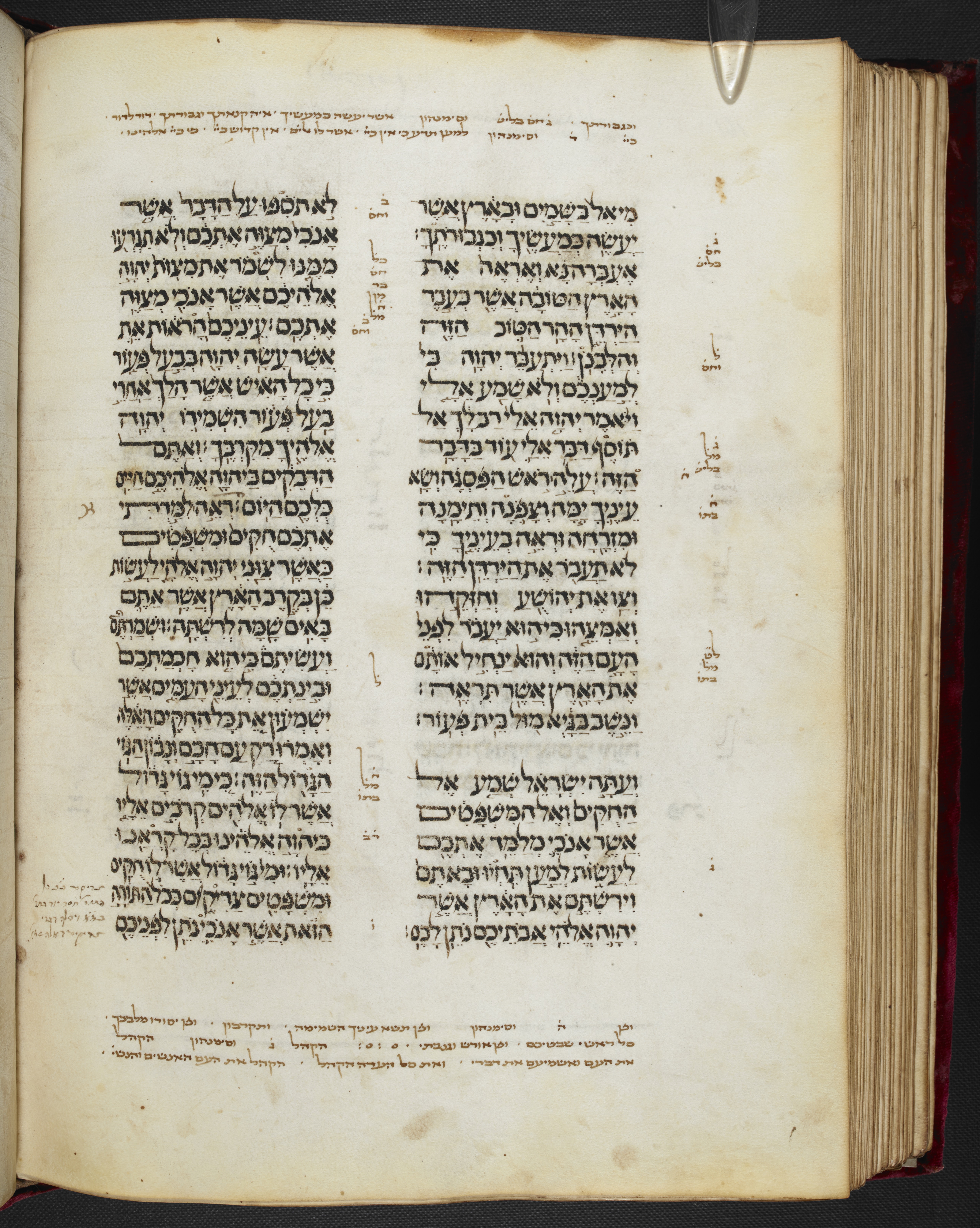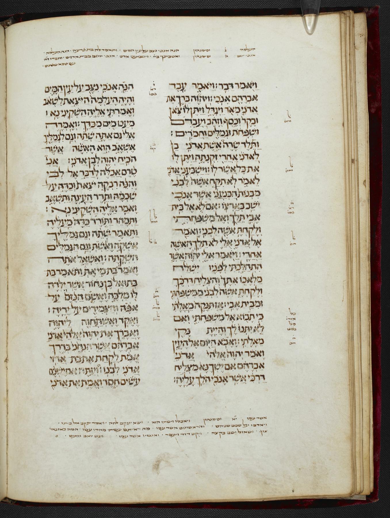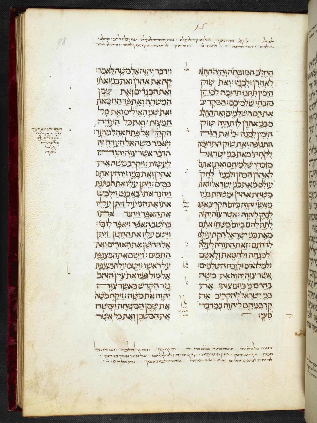 Post-1600. Crimson velvet binding. Boxed. Spine: 'Pentateuchus Hebraice. M.S. in Membrana. Mus. Brit. Jure Emptionis. 15,306. Plut.'Layout