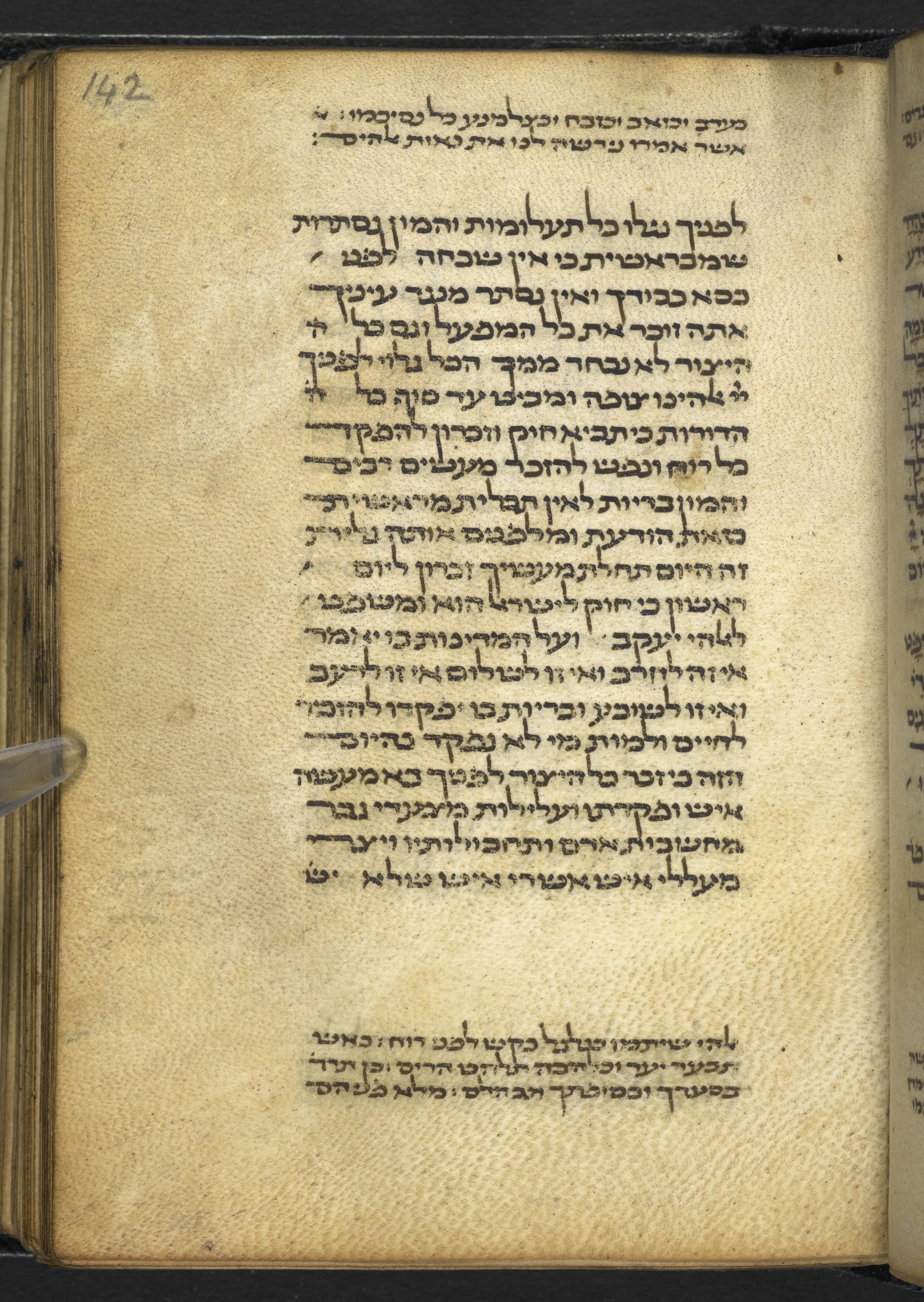 Post-1600, black leather. Boxed. Spine: 'Machazor. Breviarum Precum Ritus Italici. Cum Psalmis. Hebr. Mus. Brit. Jure Emptionis. 18,690.'Layout