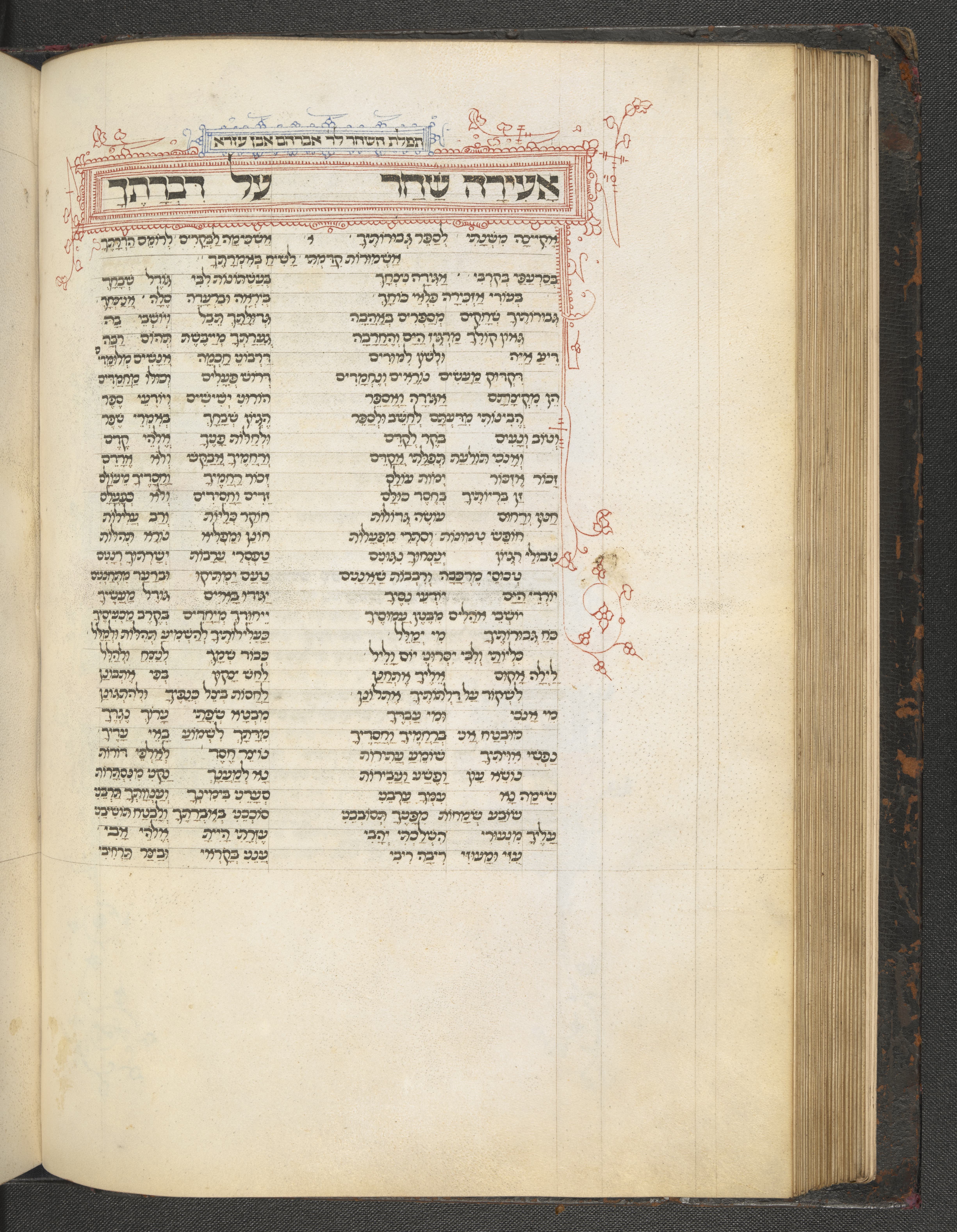Post-1600. Dark brown leather. Spine: 'Machazor Secundum Ritum Italicum. Hebraice. Pars II. Mus. Brit. Add. Or. 19,945.'Layout