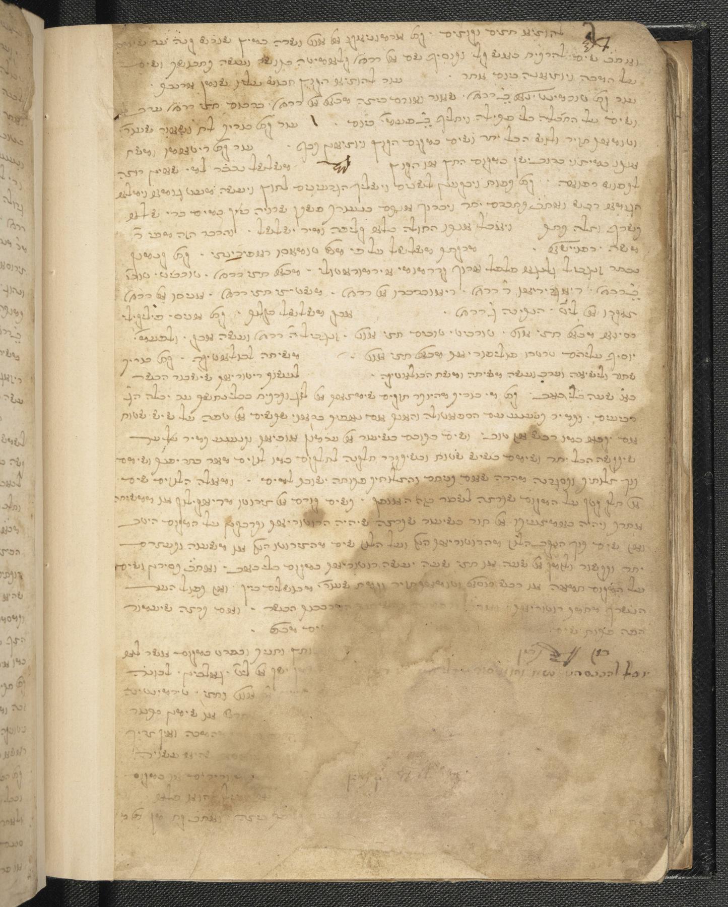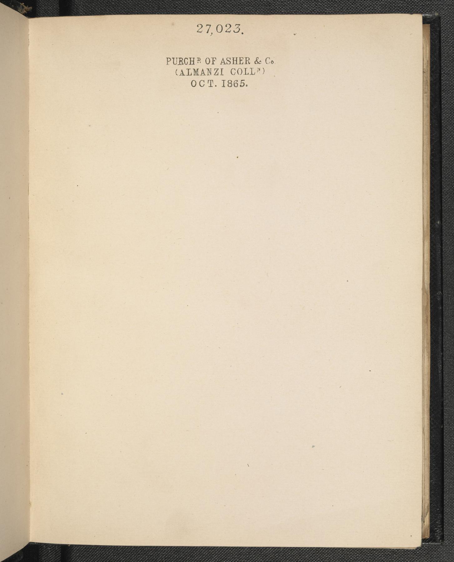 - Acquisition: Giuseppe Almanzi (b. 1801, d. 1860), bibliophile; his manuscript no. 129: his library including 322 medieval Hebrew manuscripts were purchased en bloc by the British Museum in October 1865 for £1,000 through Asher & Co., Berlin dealer to the British Museum 1841-1853: inscribed, folio [63v] (fse001v).