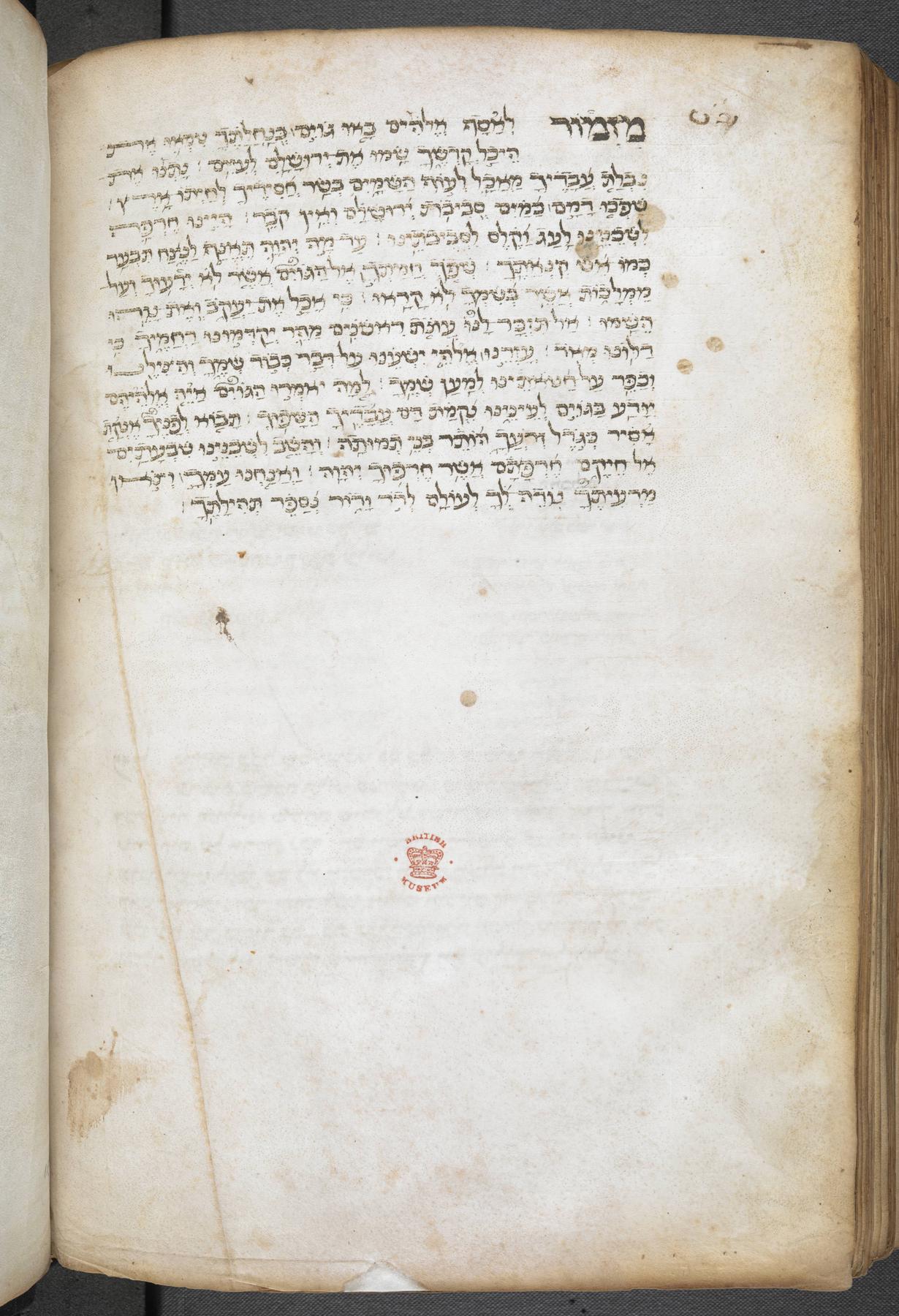 - Acquisition: Giuseppe Almanzi (b. 1801, d. 1860), bibliophile; his manuscript no. 175: his library including 322 medieval Hebrew manuscripts were purchased en bloc by the British Museum in October 1865 for £1,000 through Asher & Co., Berlin dealer to the British Museum (see 131-153): inscribed, [300v].