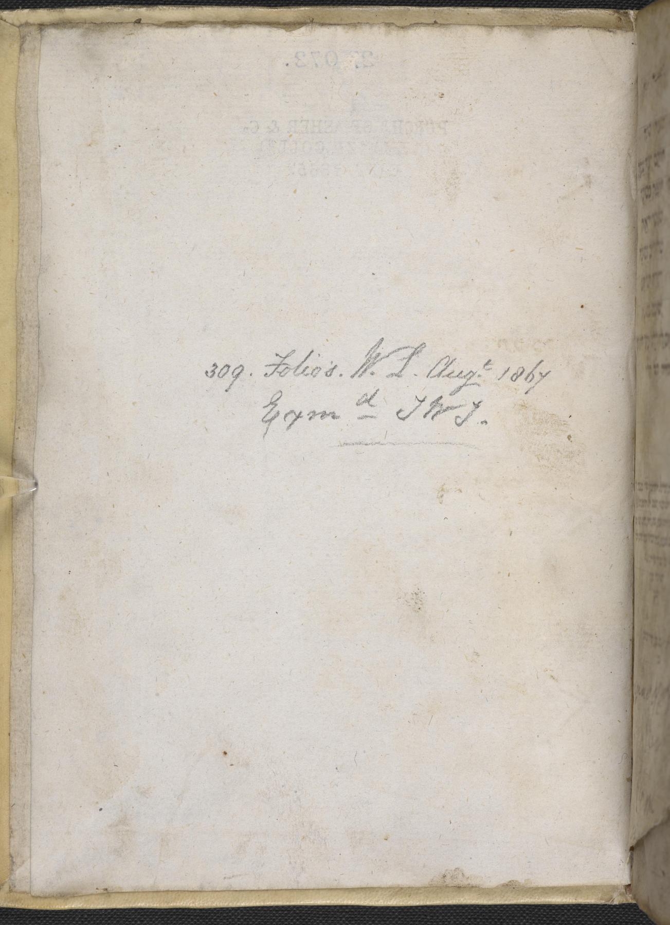 - Acquisition: Giuseppe Almanzi (b. 1801, d. 1860), bibliophile; his manuscript no. 177: his library including 322 medieval Hebrew manuscripts were purchased en bloc by the British Museum in October 1865 for £1,000 through Asher & Co., Berlin dealer to the British Museum (see 131-153): inscribed, [310v].